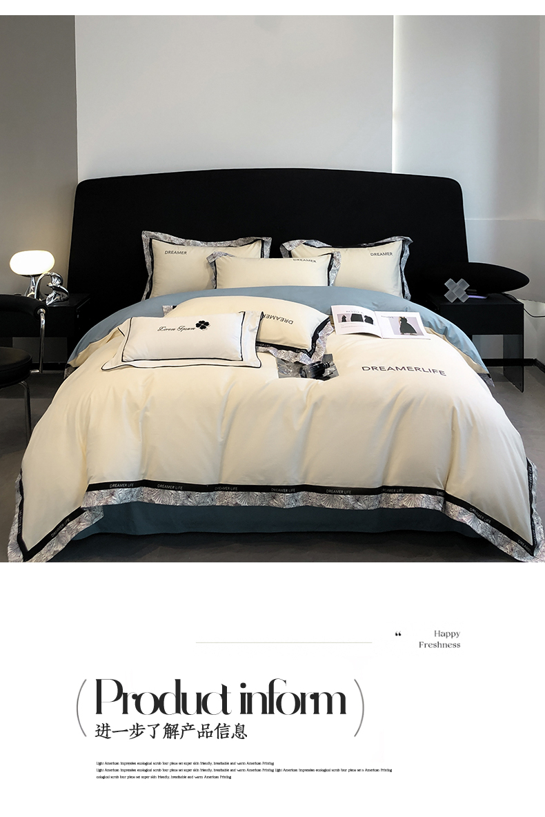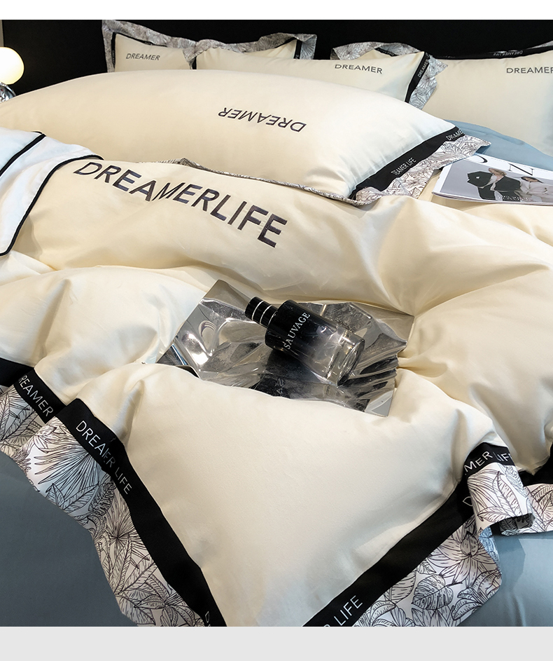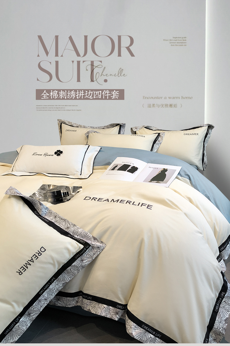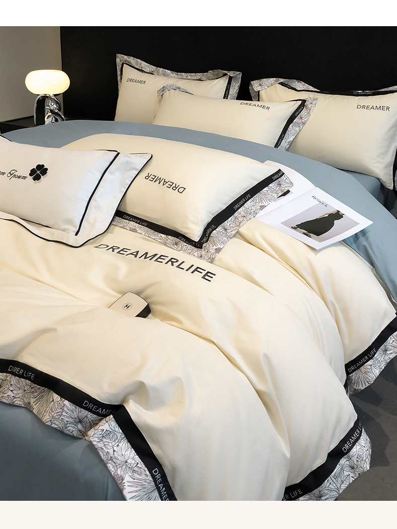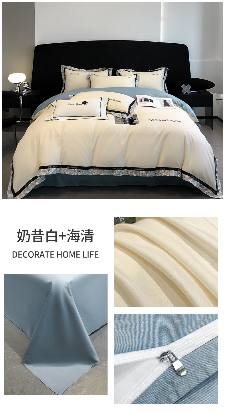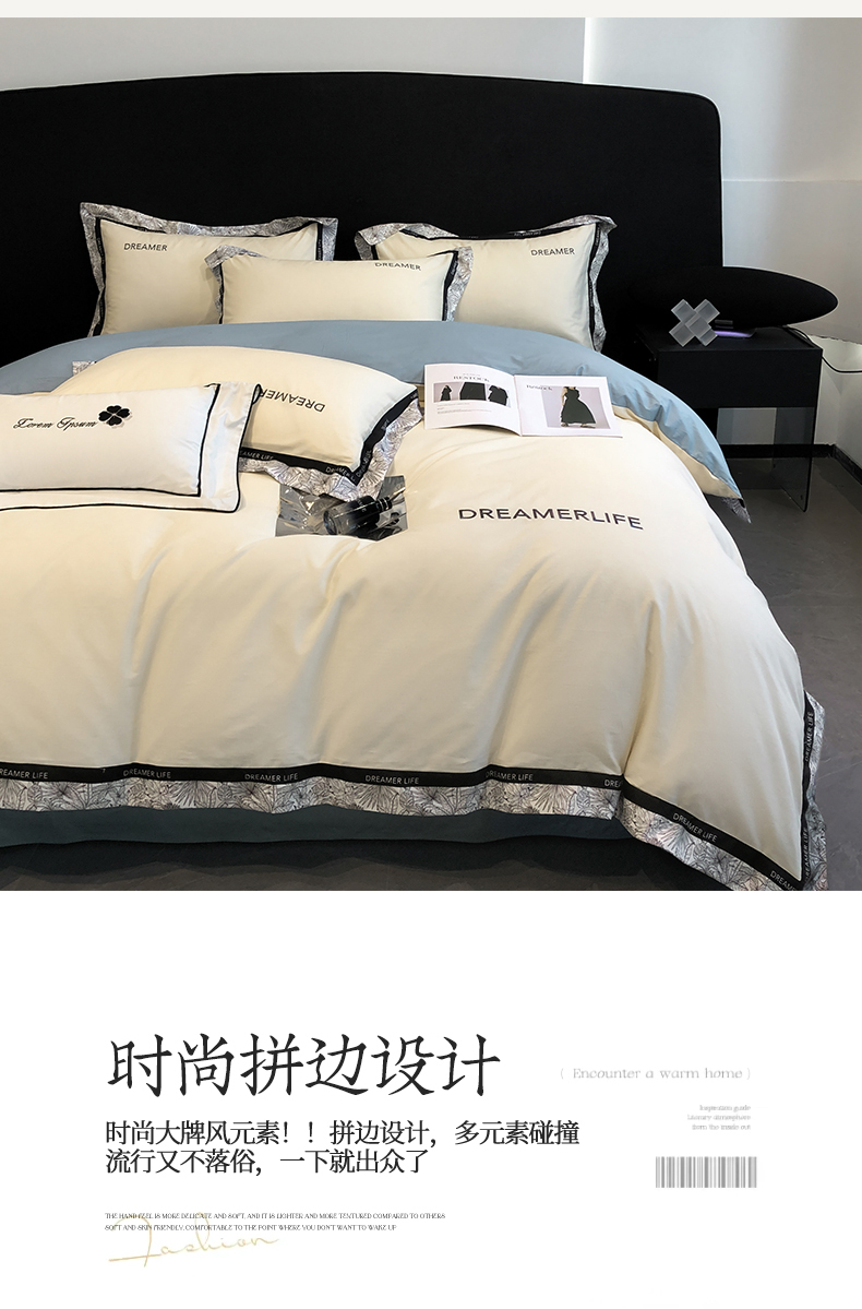 眷恋家纺 2024新款全棉数码拼接刺绣四件套 奶昔白+海清