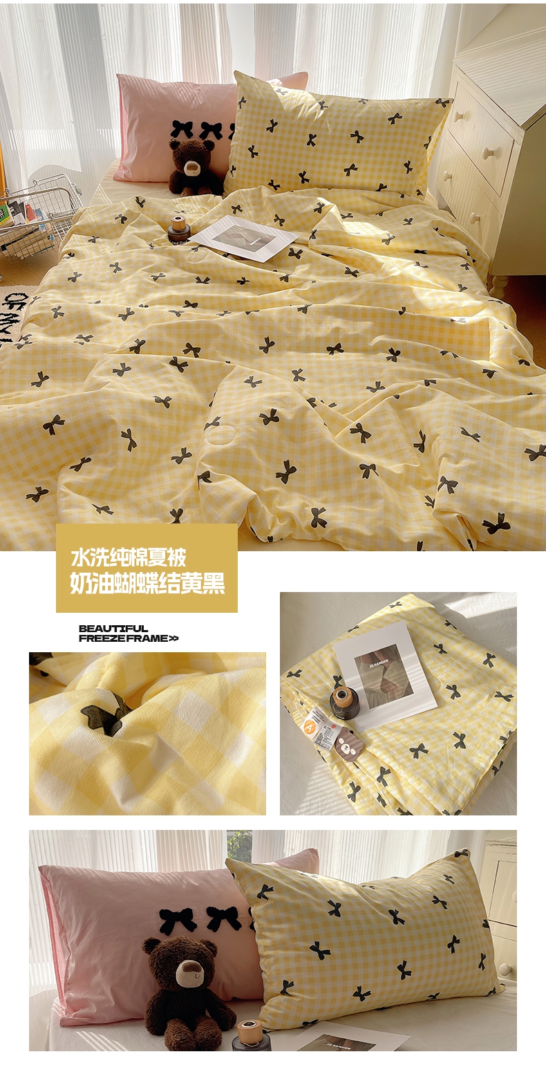 • 91家纺网 家纺一手货源 找家纺 桃子家居 2024新款A类纯棉水洗棉毛巾绣奶油蝴蝶结夏被四件套单夏被单品系列 水洗纯棉夏被-奶油蝴蝶结黄黑