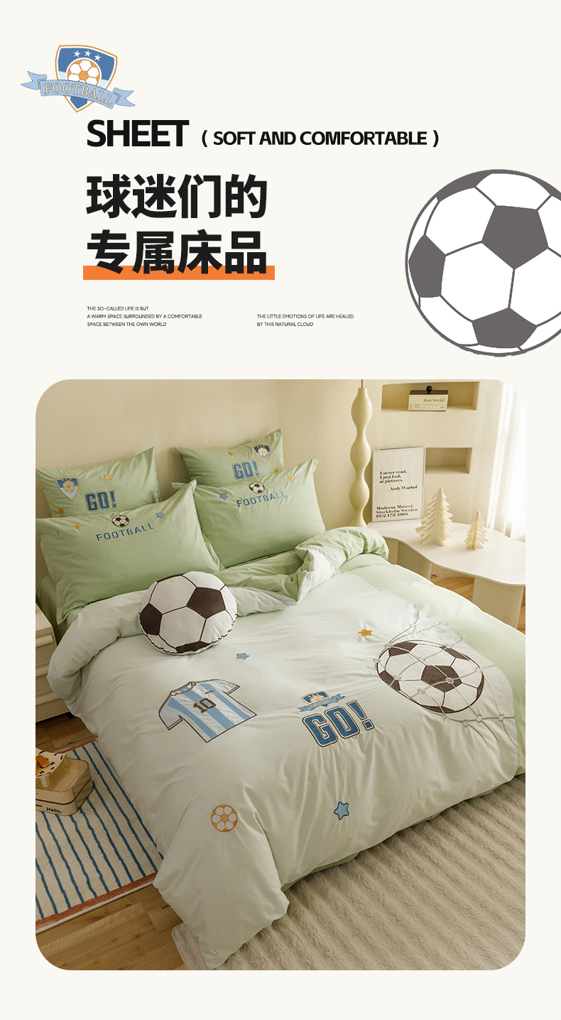 当前位置: 91家纺网 > 商品网购 > 床品套件 > 四件套 > 水洗棉四件套 > (总)绒梦里 2025款A类全棉40s水洗棉贴布绣花四件套儿童三件套上下铺床套件-足球系列
