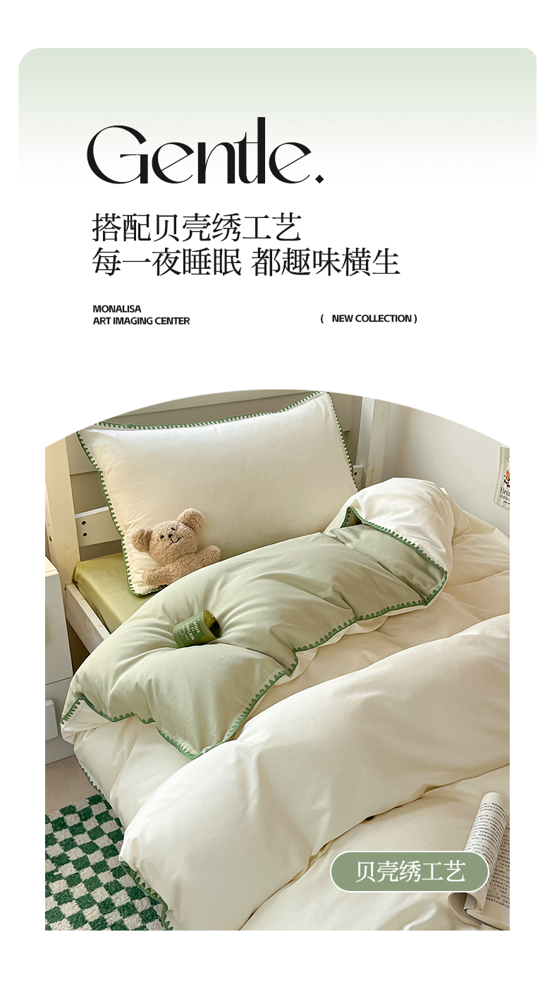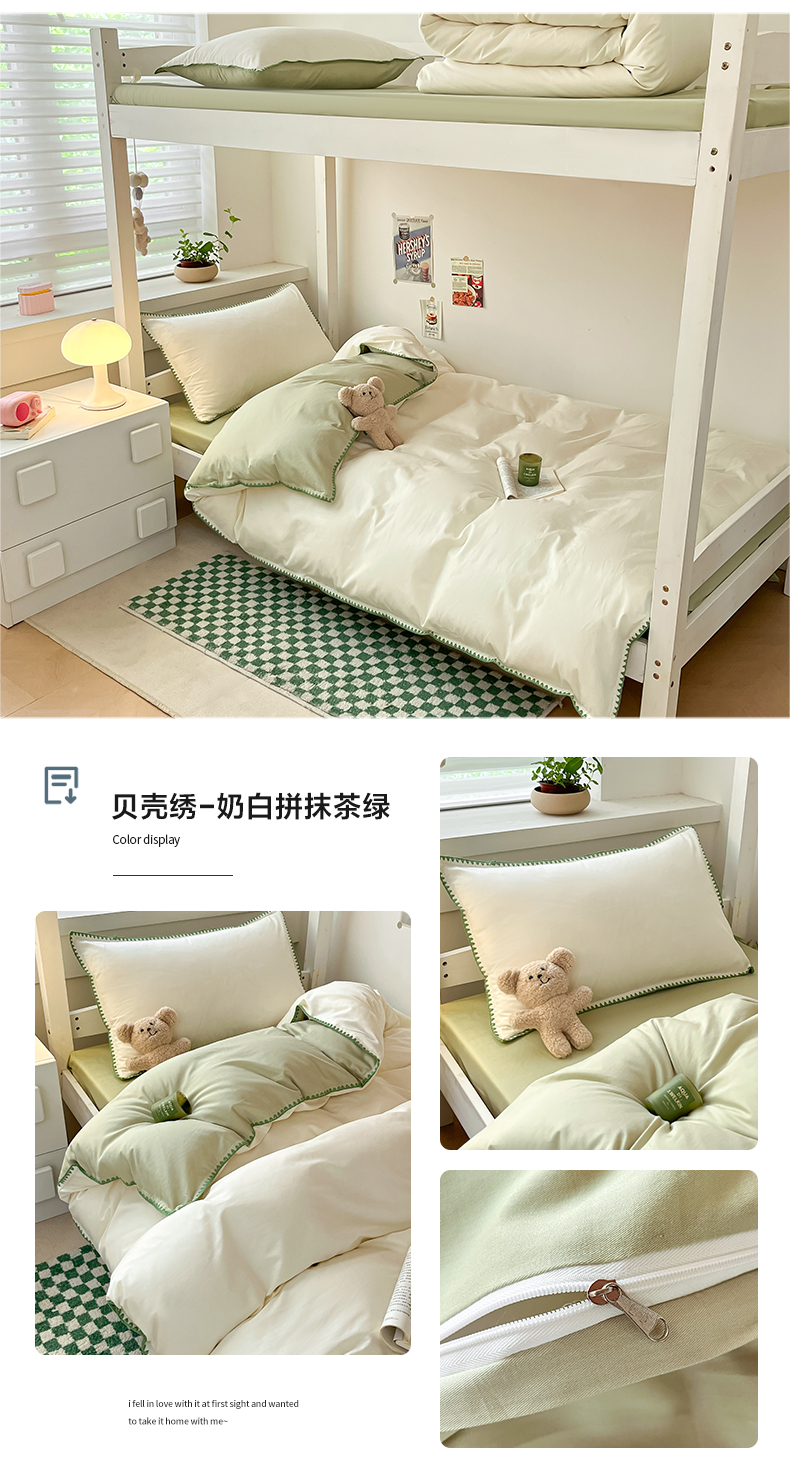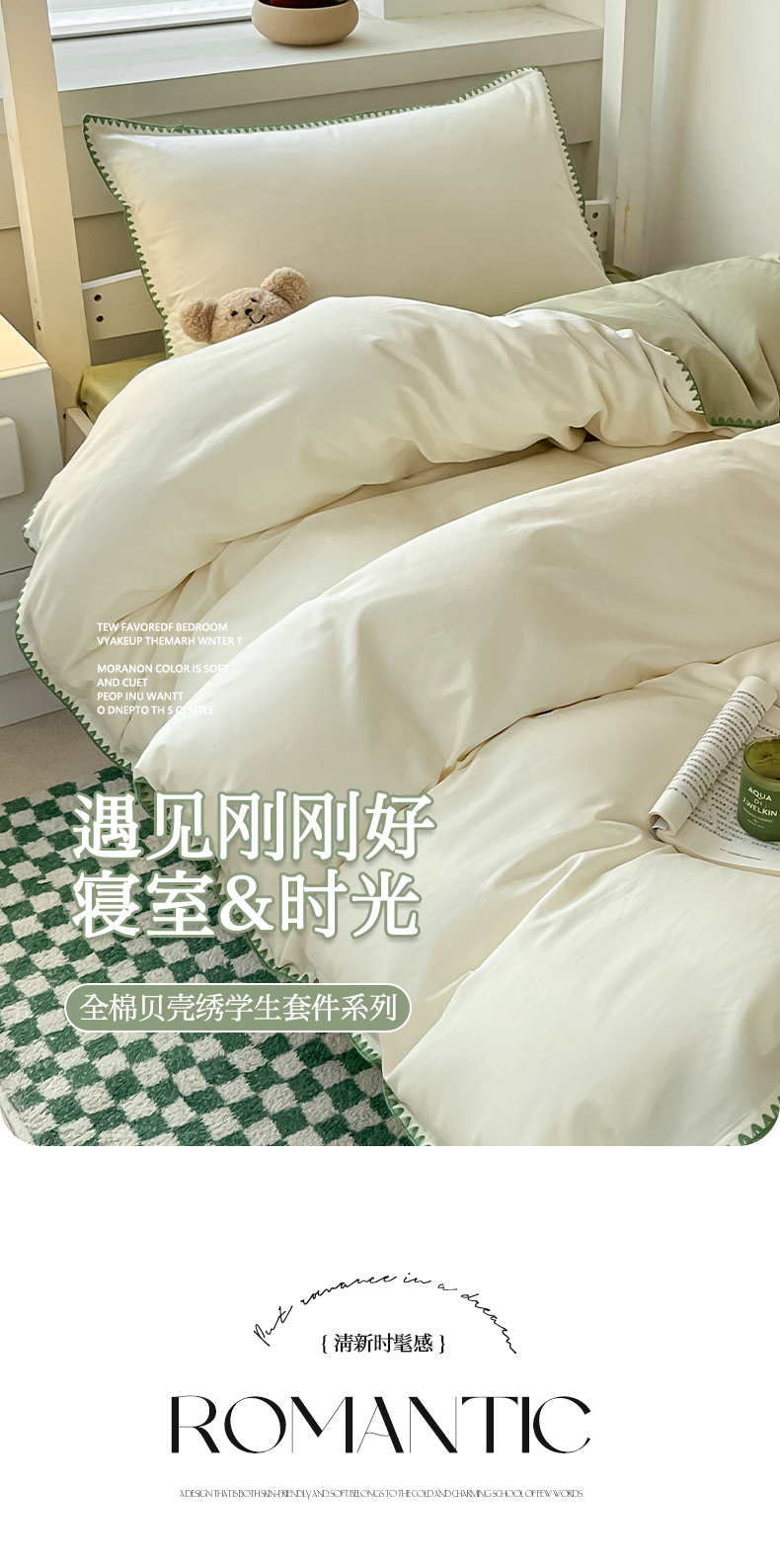 当前位置: 91家纺网 > 商品网购 > 床品套件 > 四件套 > 全棉普通四件套 > 莱登卡奴 2025新款全棉13374贝壳绣学生三件套四件套套件系列 贝壳绣-奶白拼抹茶绿