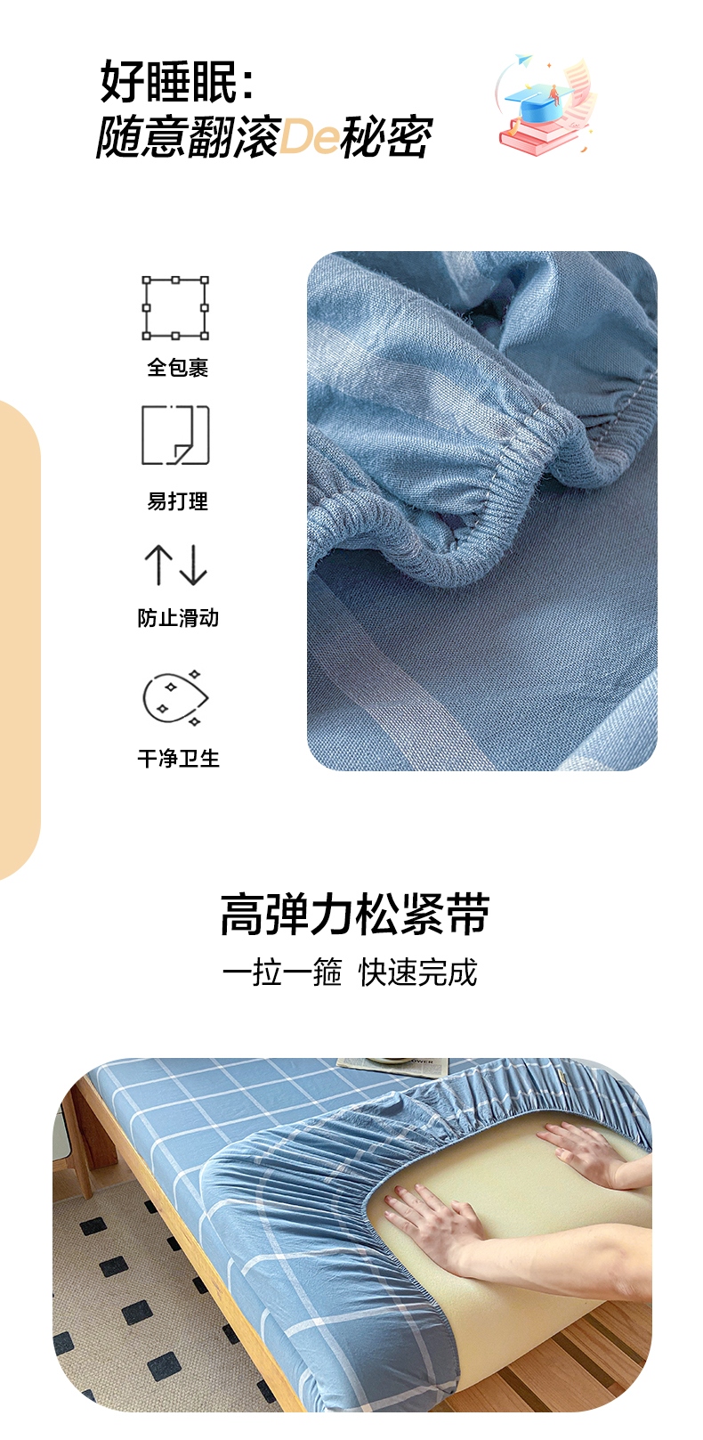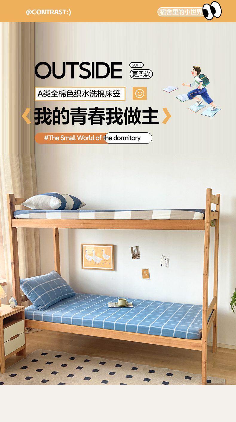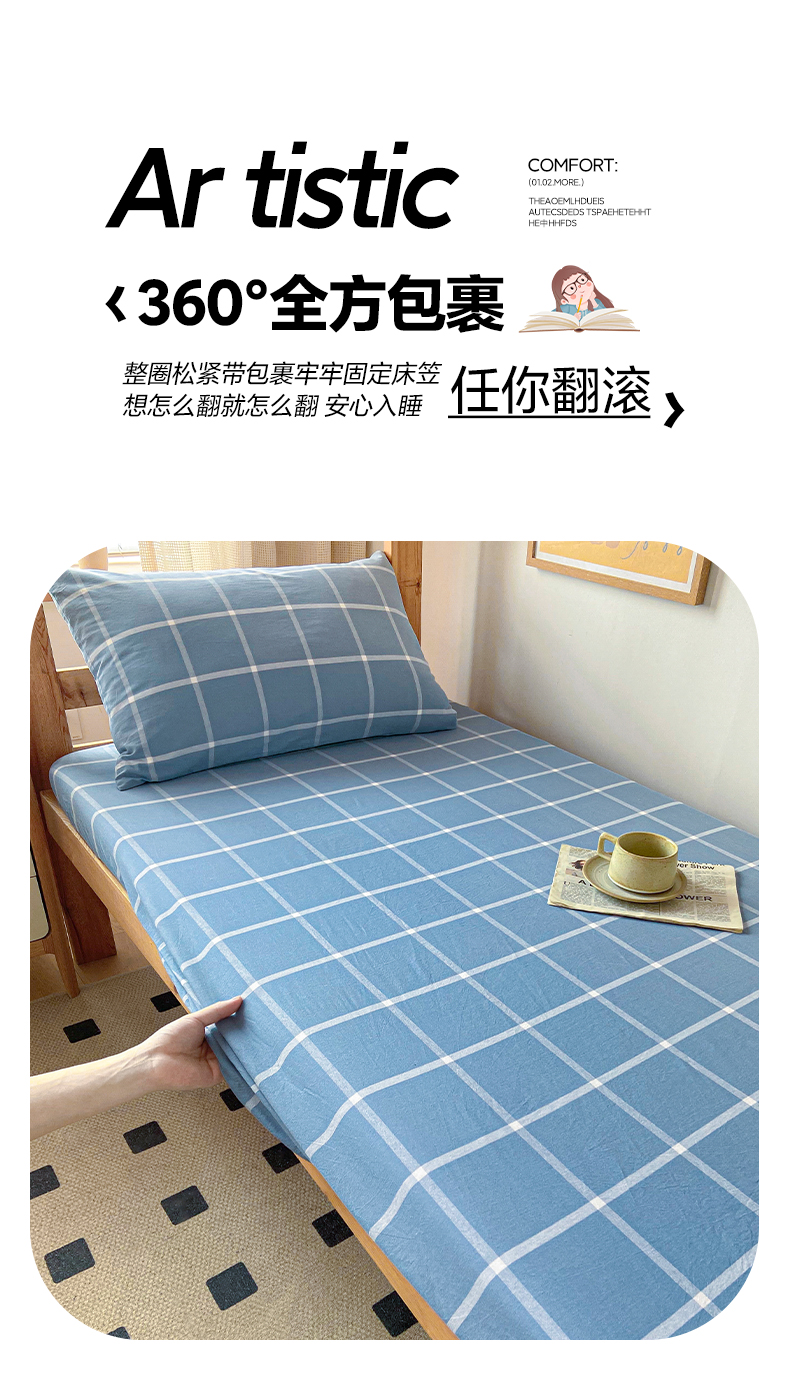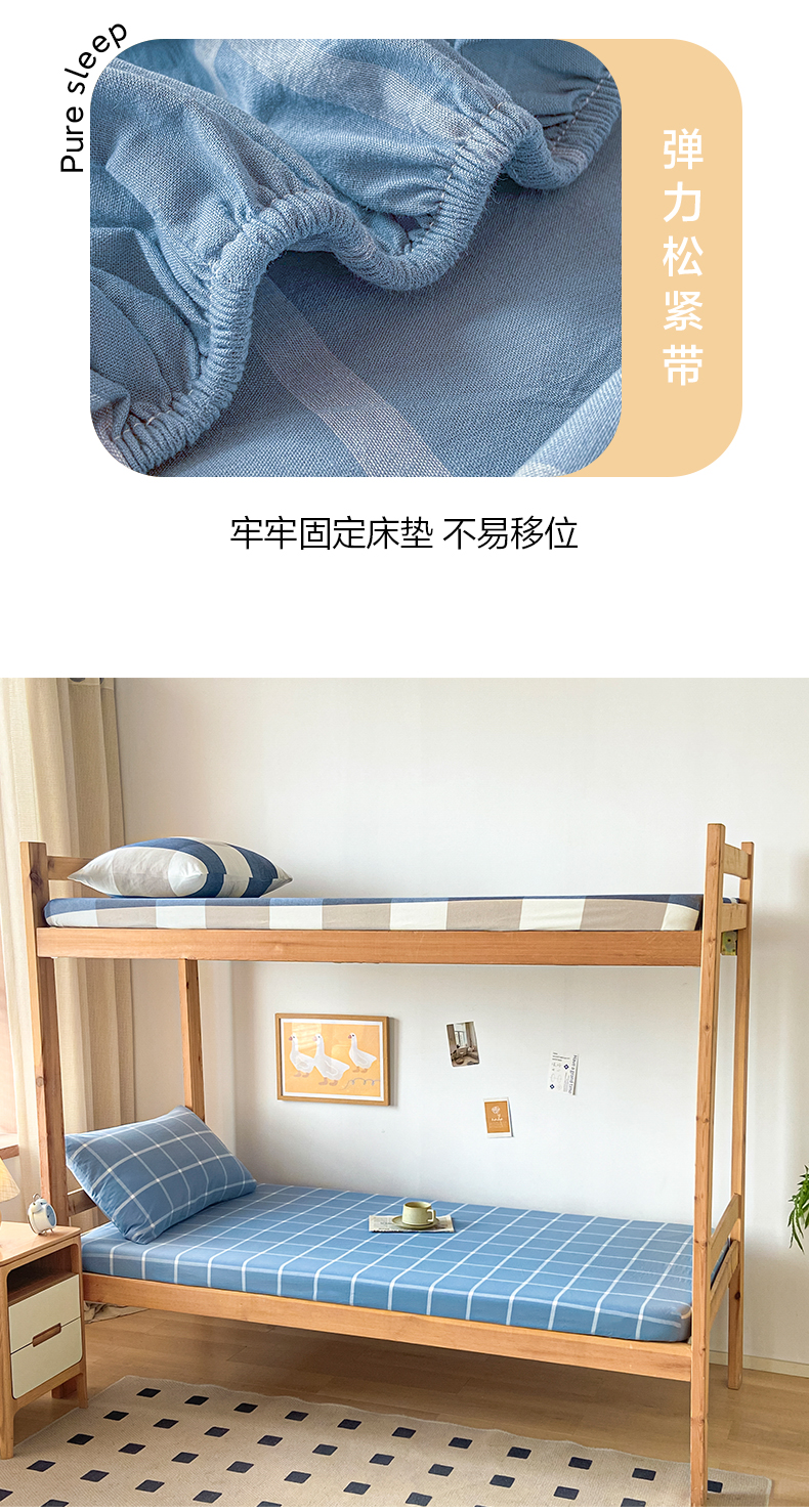 卡伦家纺 2025新款全棉色织水洗棉单层宿舍学生床笠 蓝灰中格