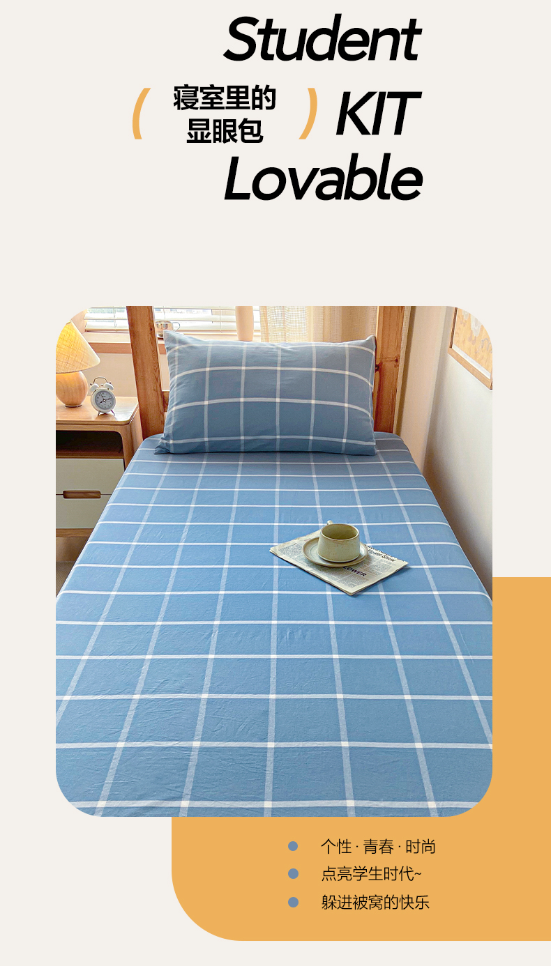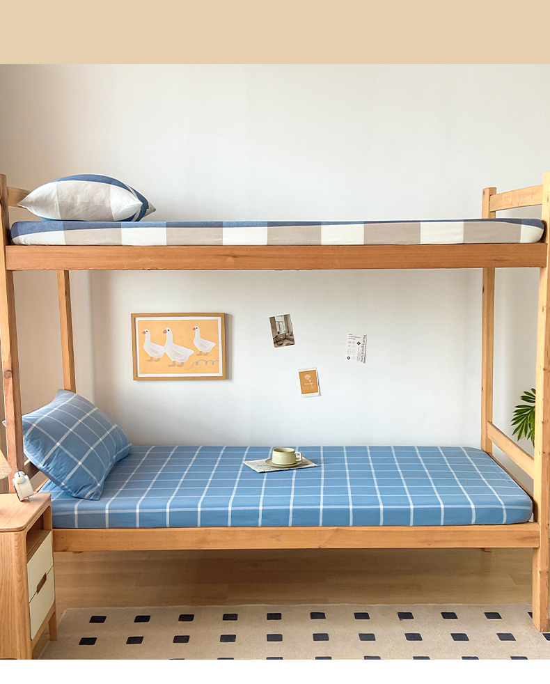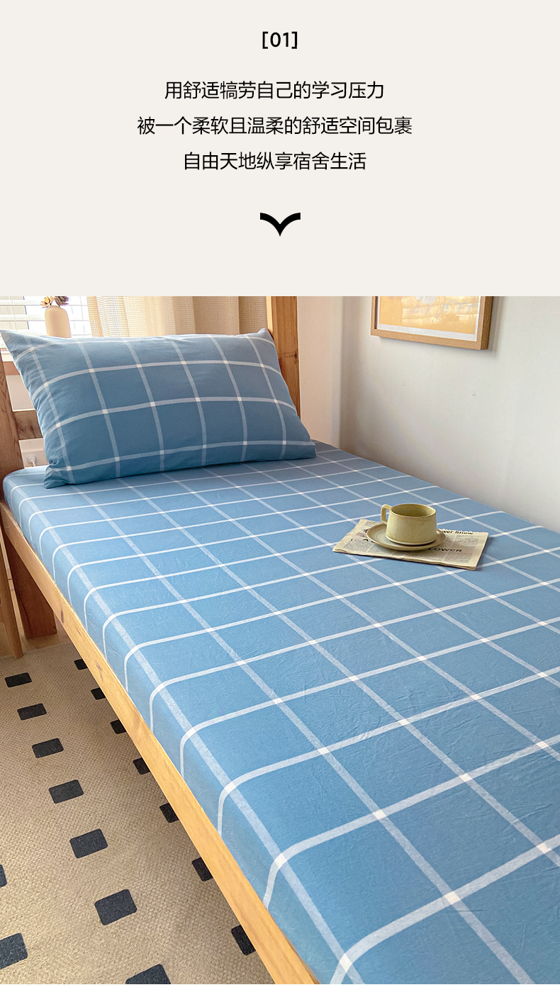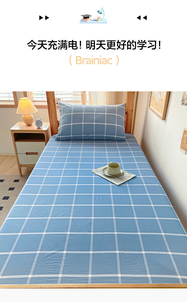 • 91家纺网 家纺一手货源 找家纺 卡伦家纺 2025新款全棉色织水洗棉单层宿舍学生床笠 蓝灰中格
