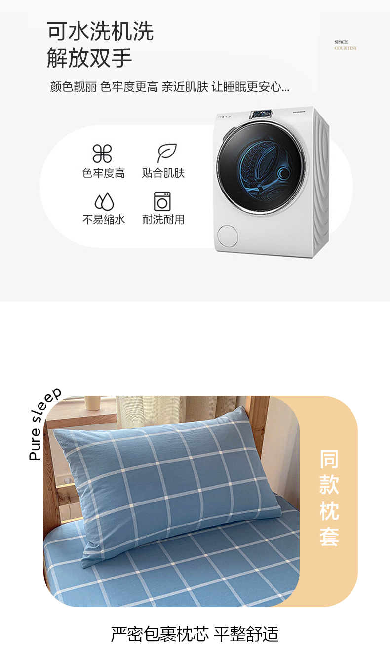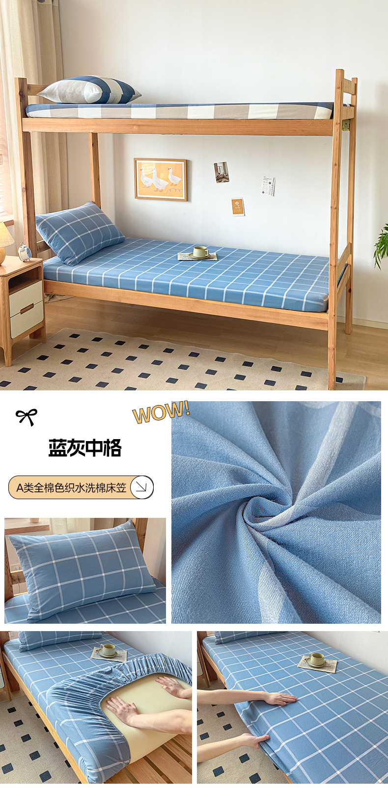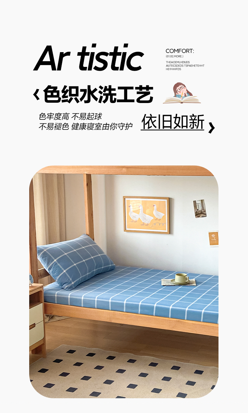 • 91家纺网 家纺一手货源 找家纺 卡伦家纺 2025新款全棉色织水洗棉单层宿舍学生床笠 蓝灰中格