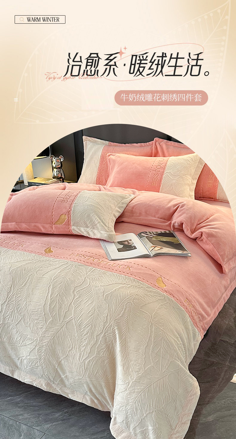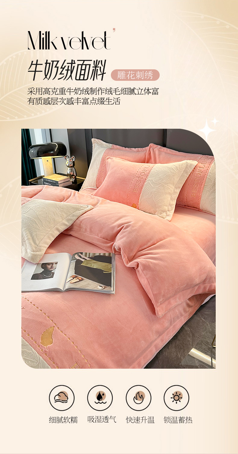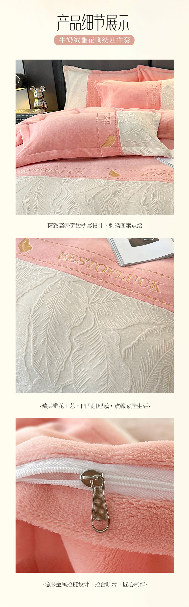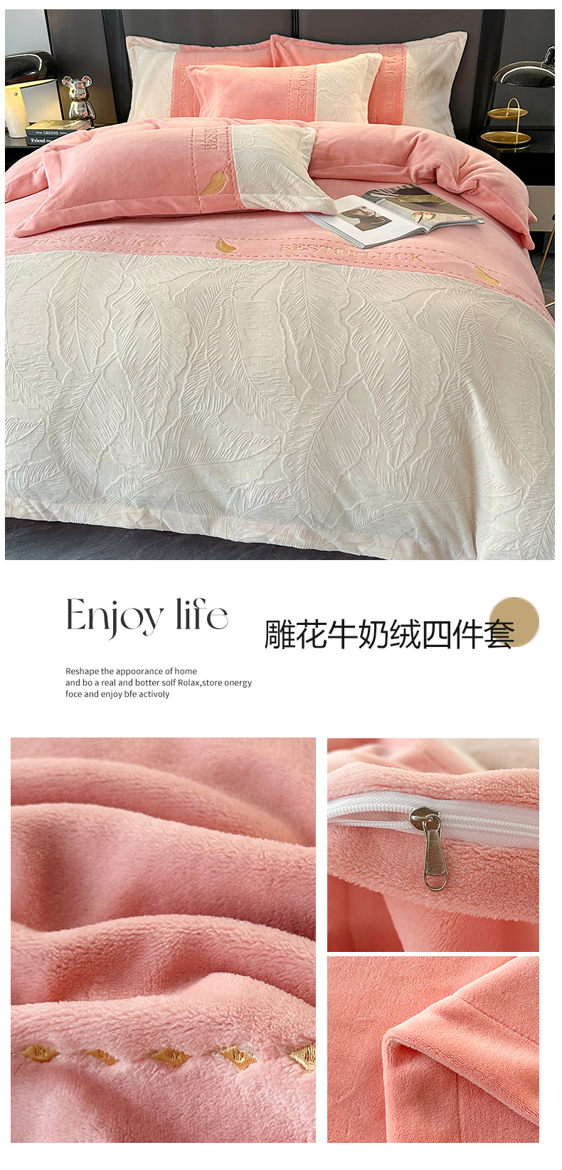 莱凯家纺 2025新款牛奶绒雕花刺绣四件套-叶屿 叶屿-粉
