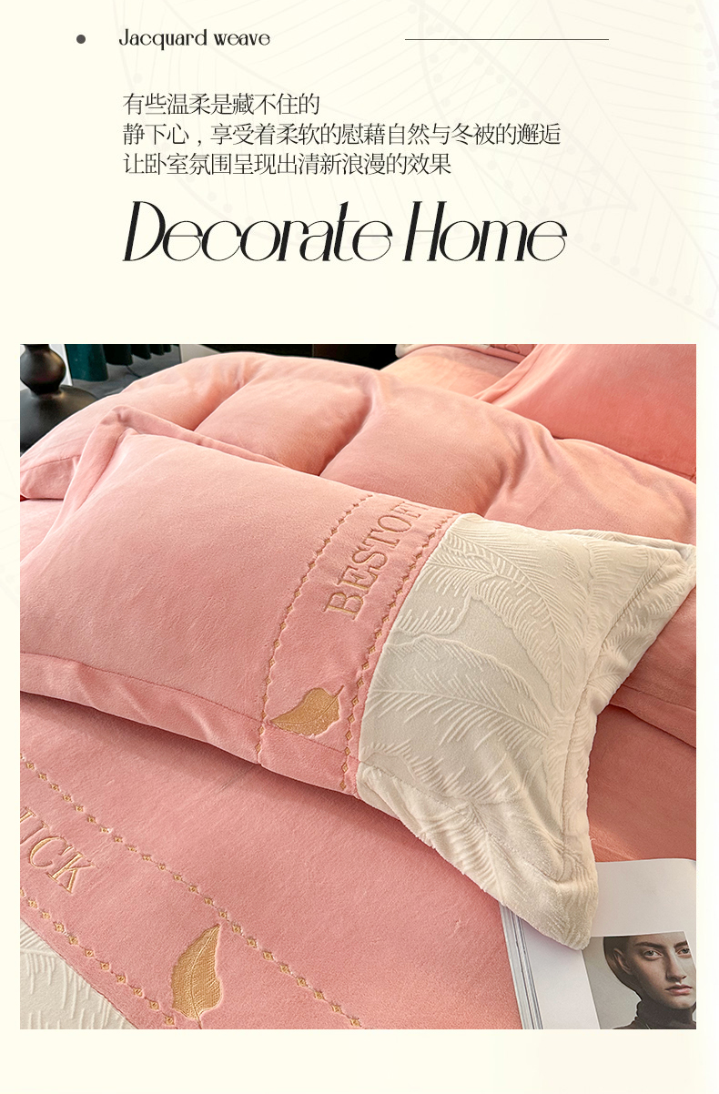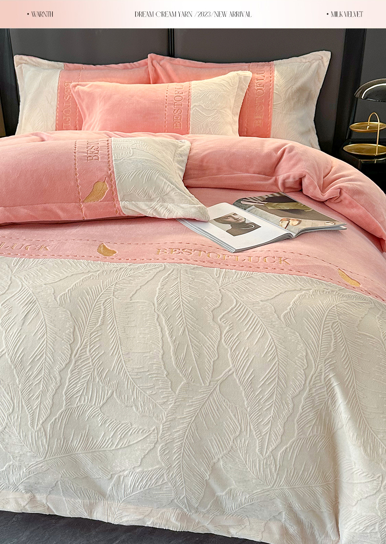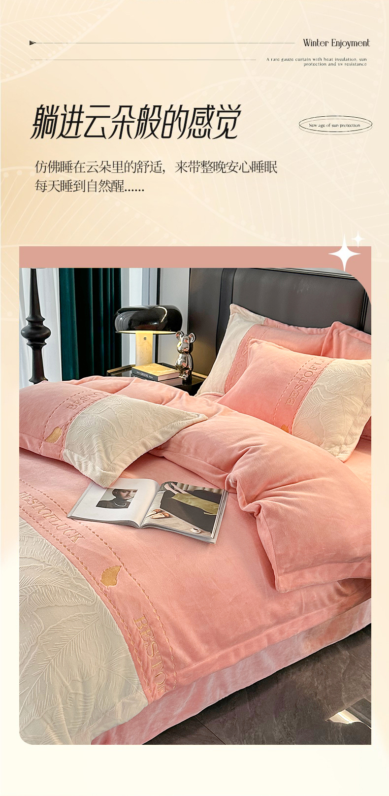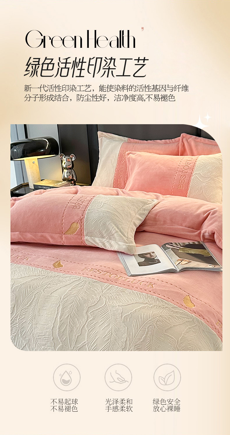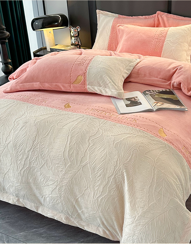 莱凯家纺 2025新款牛奶绒雕花刺绣四件套-叶屿 叶屿-粉
