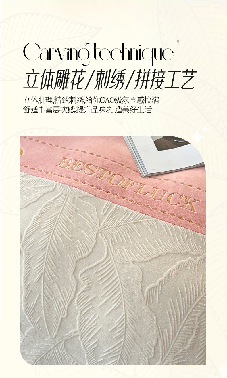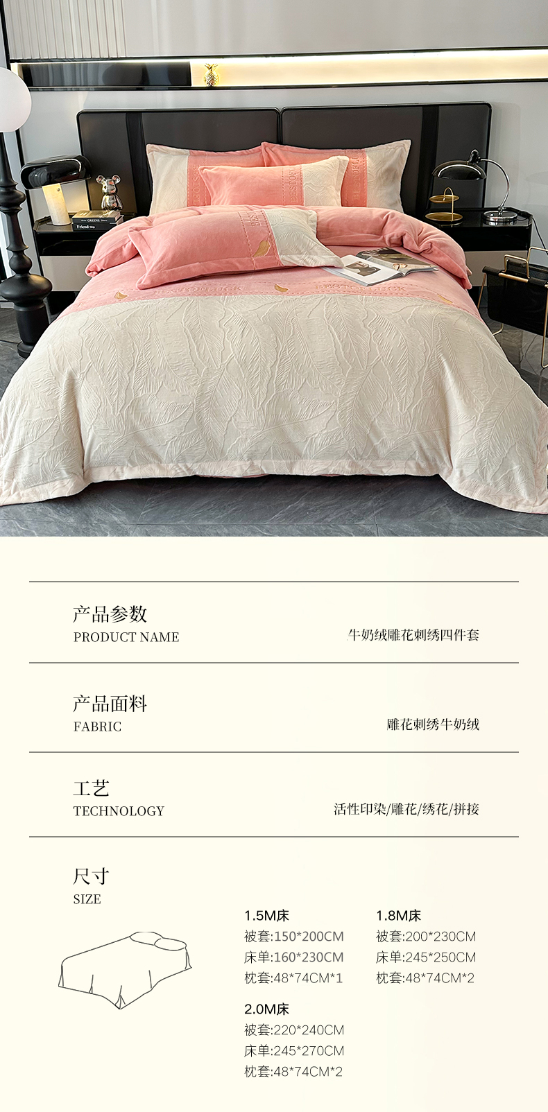 商品名称:莱凯家纺 2025新款牛奶绒雕花刺绣四件套-叶屿 叶屿-粉