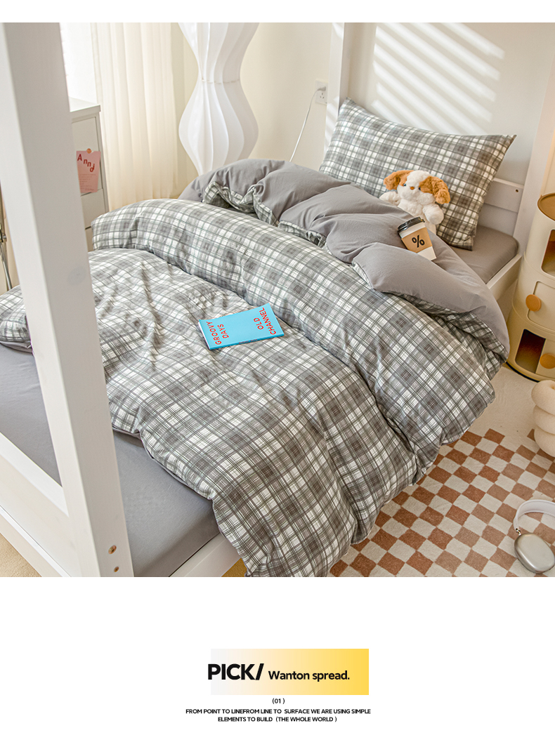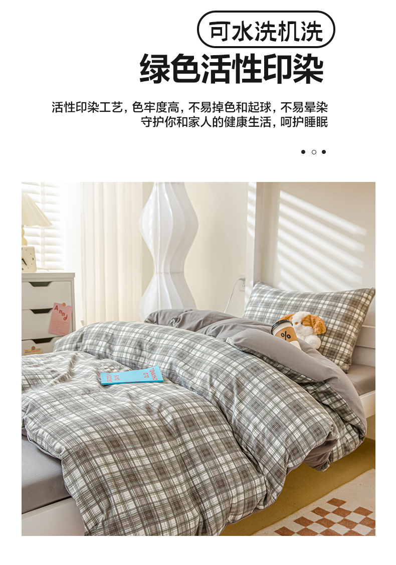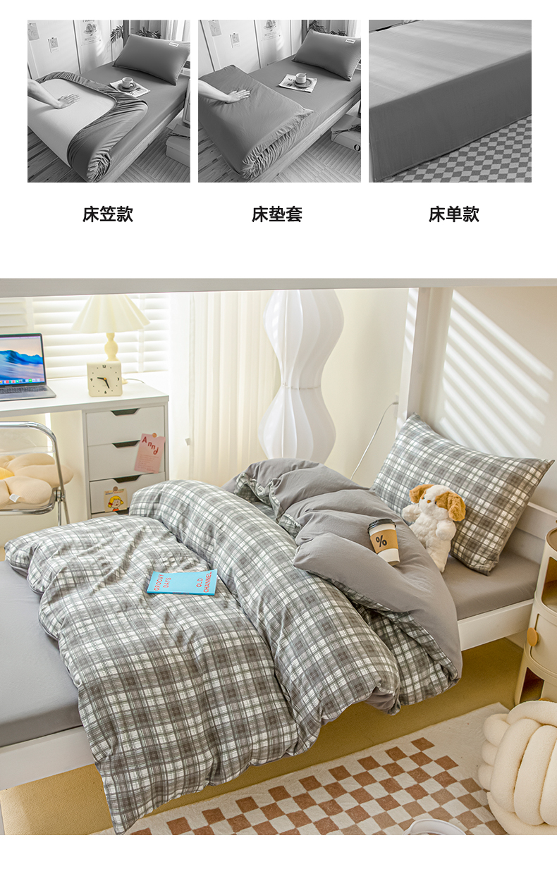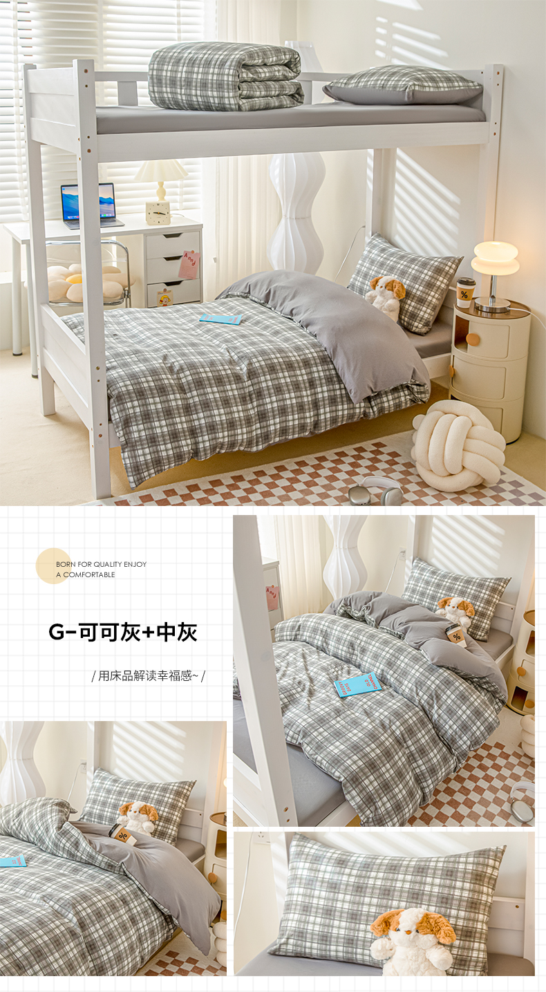 商品名称:2024新款水洗棉无印格子学生三件套(床笠床套款) G-可可灰+中灰