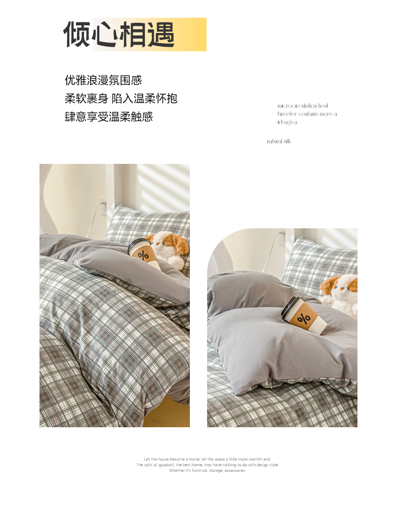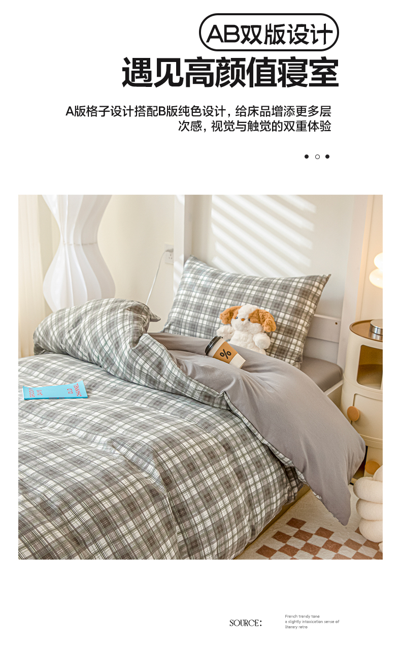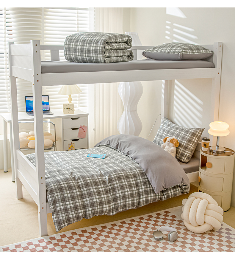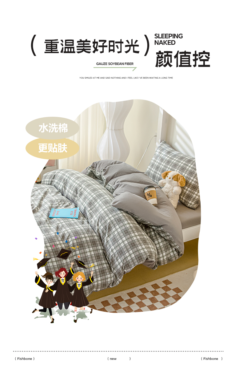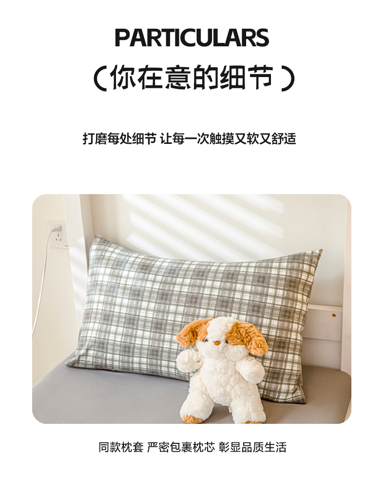 商品名称:2024新款水洗棉无印格子学生三件套(床笠床套款) G-可可灰+中灰