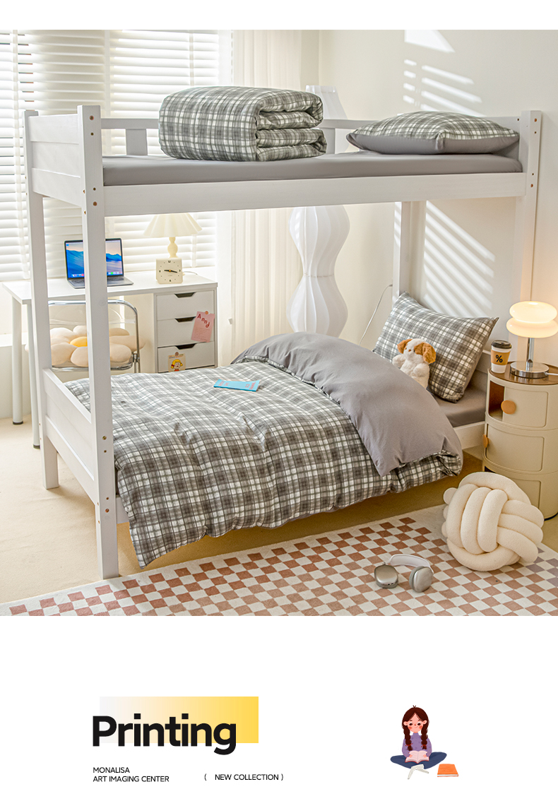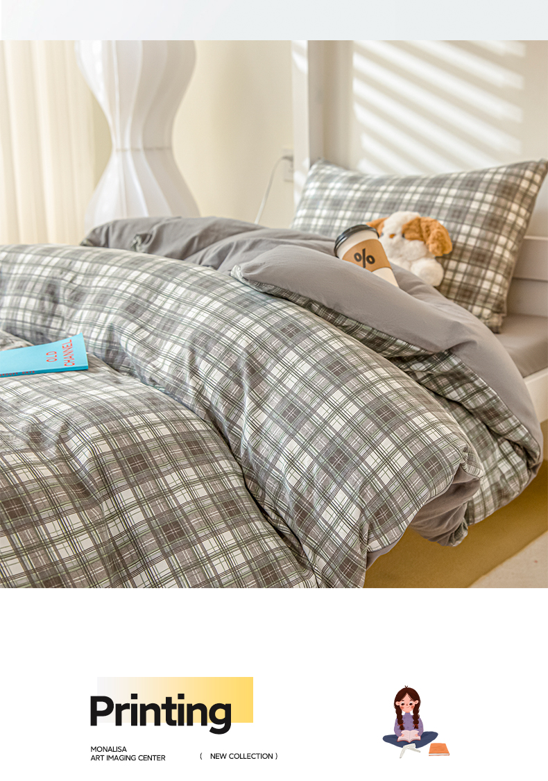 2024新款水洗棉无印格子学生三件套(床笠床套款) G-可可灰+中灰