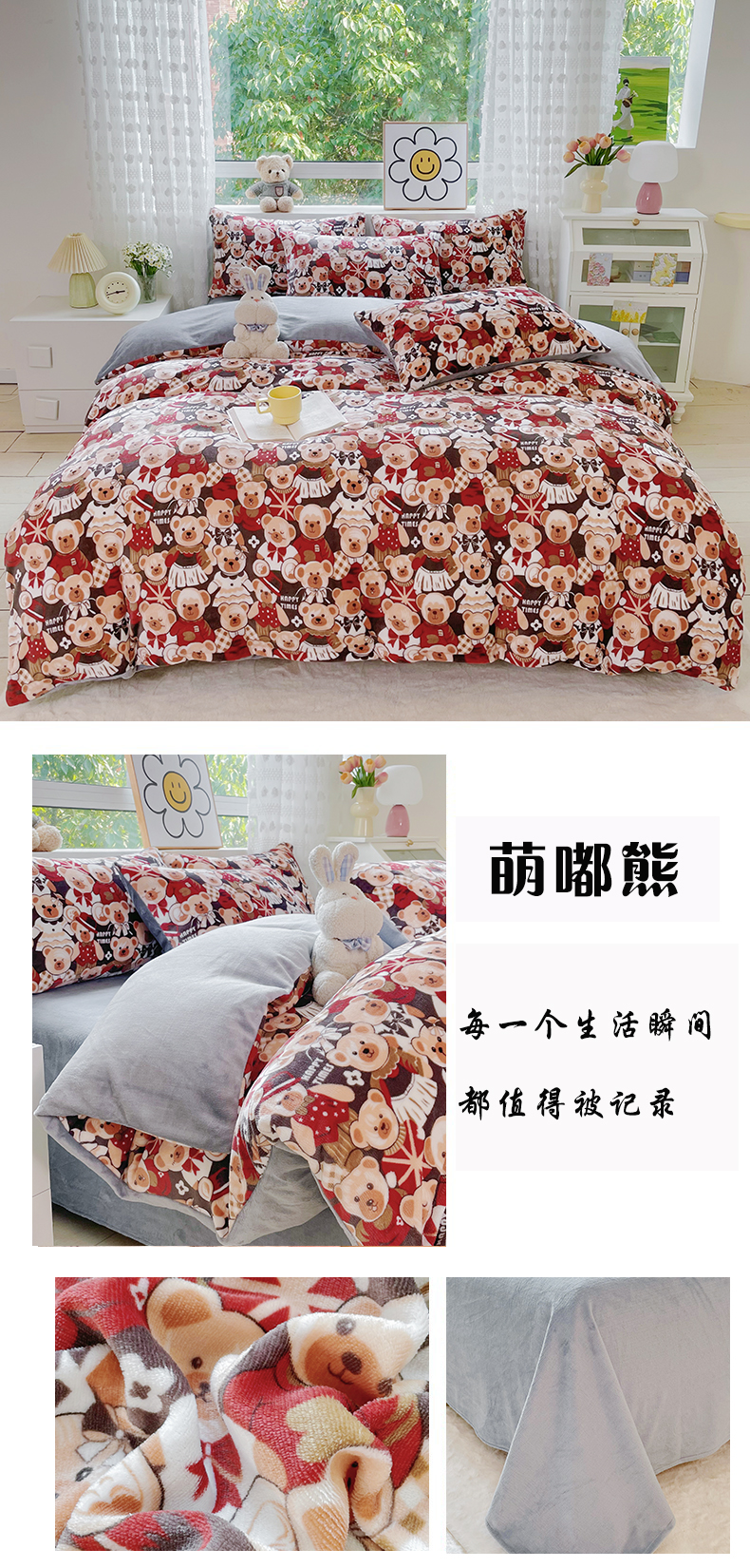 当前位置: 91家纺网 > 商品网购 > 床品套件 > 四件套 > 牛奶绒四件套 > 神州川 2024新款190小清新牛奶绒印花四件套卡通法莱绒保暖四件套跑量款 萌嘟熊