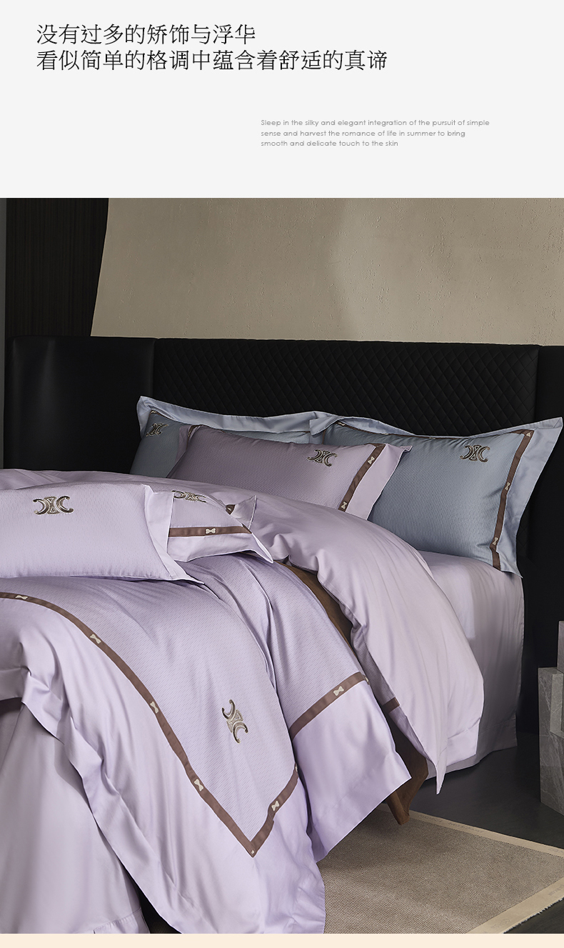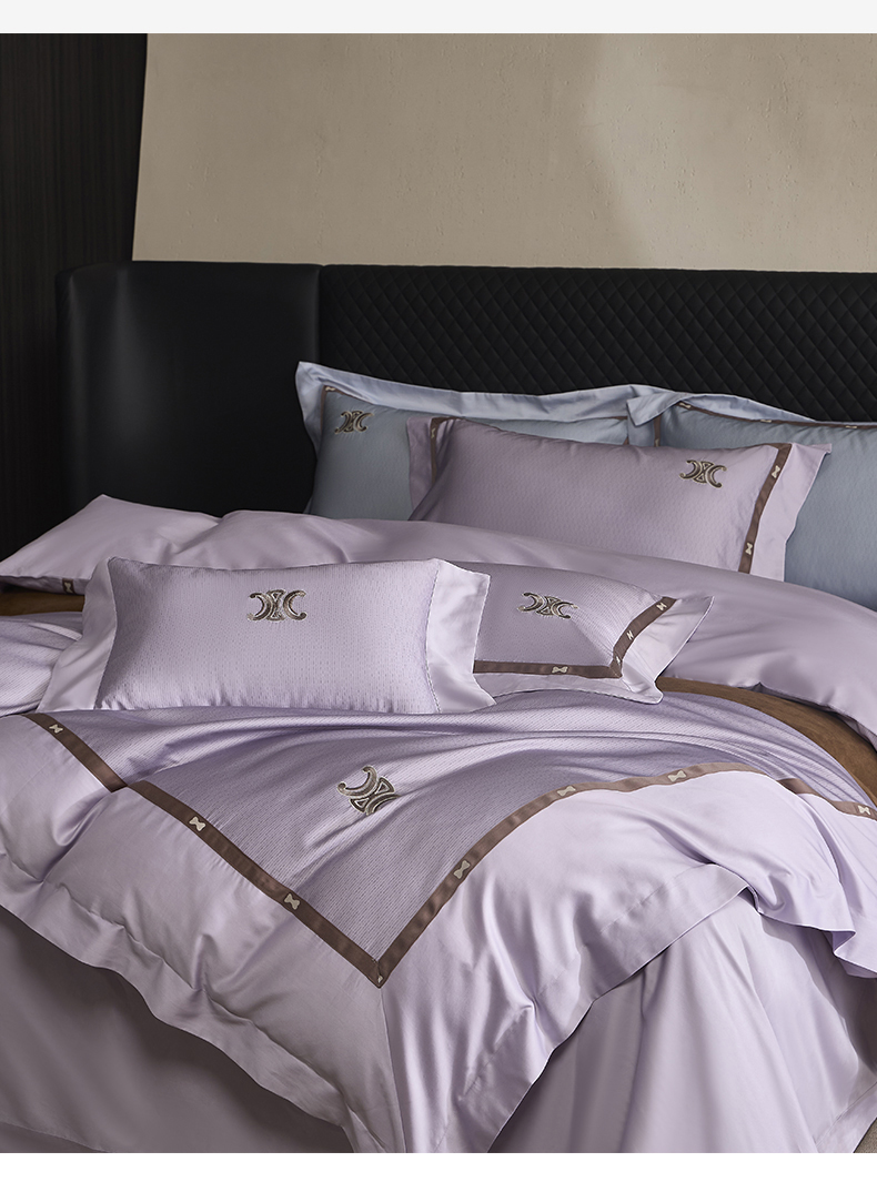 商品名称:名品优仓 2024新款高支高密长绒棉数码印花加织带刺绣拼角款四件套-斯琳娜 斯琳娜-丁香紫
