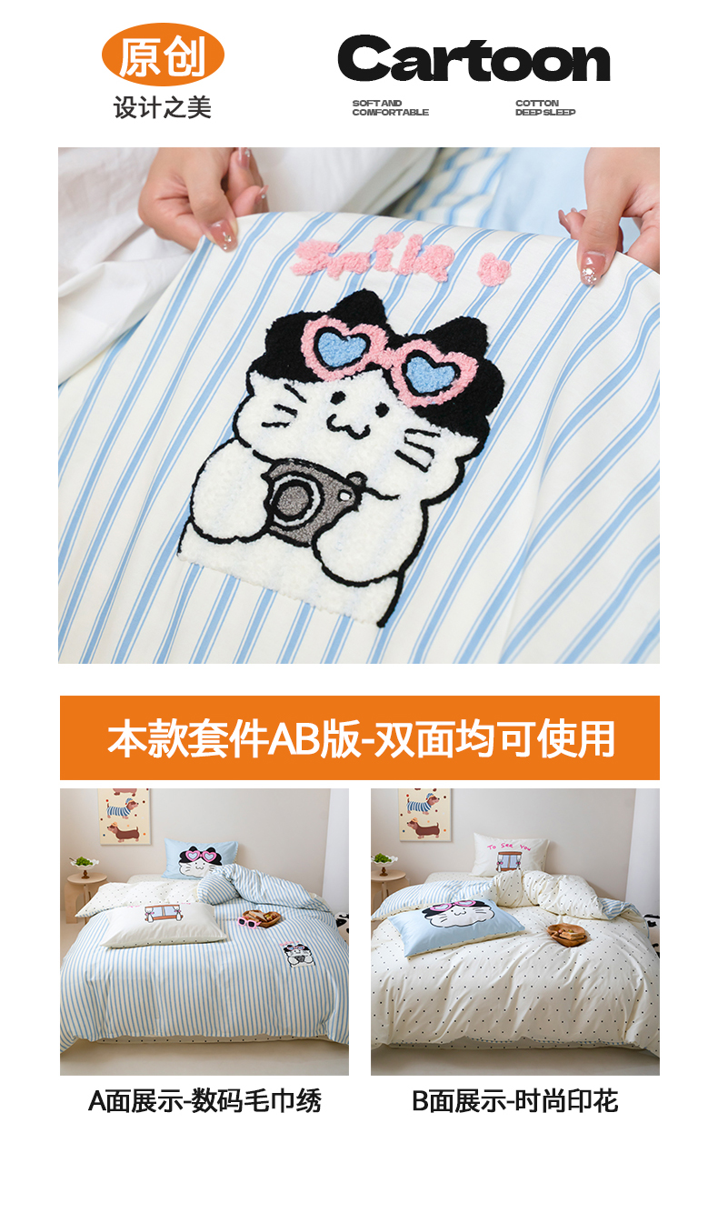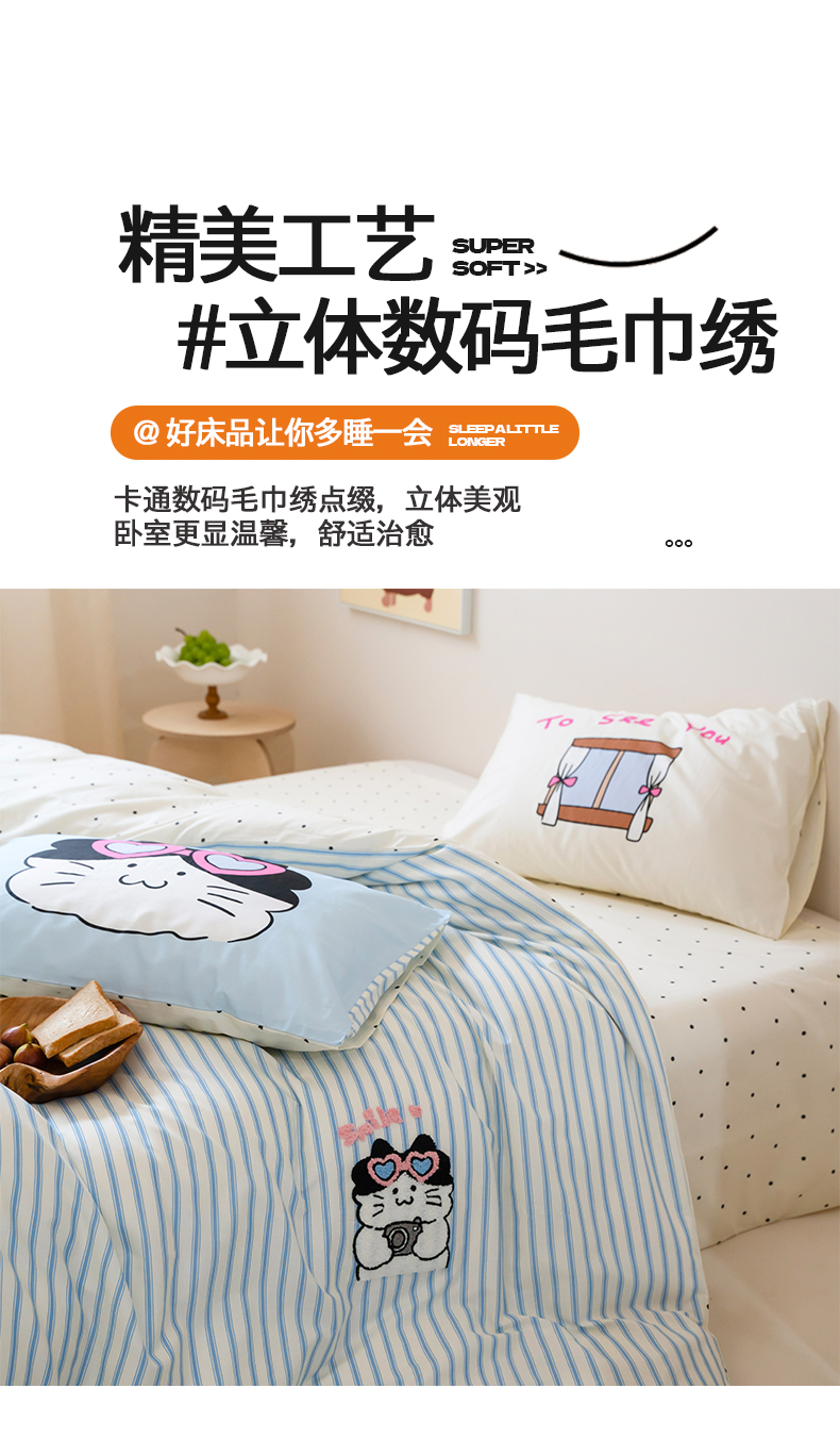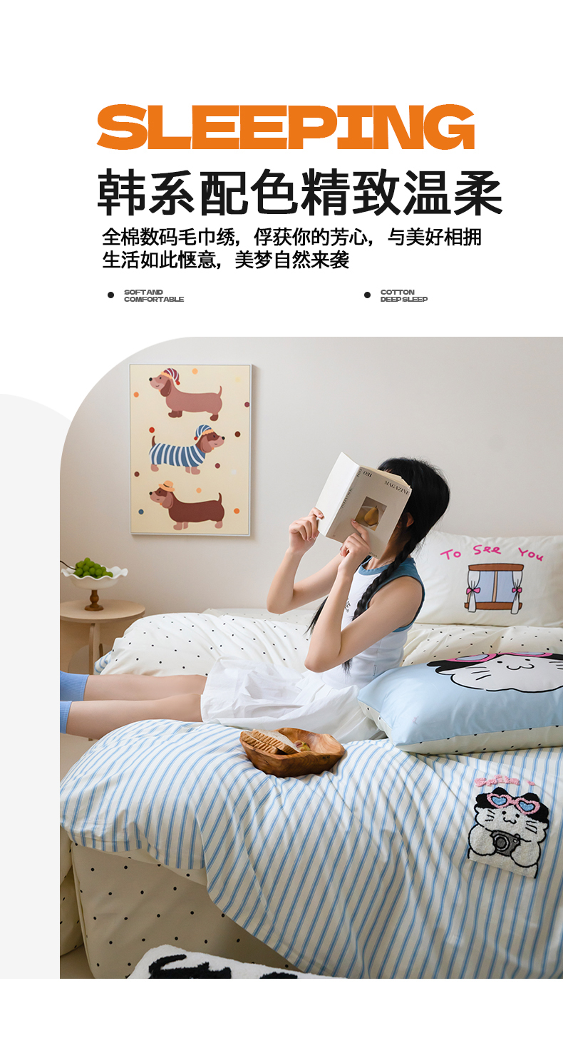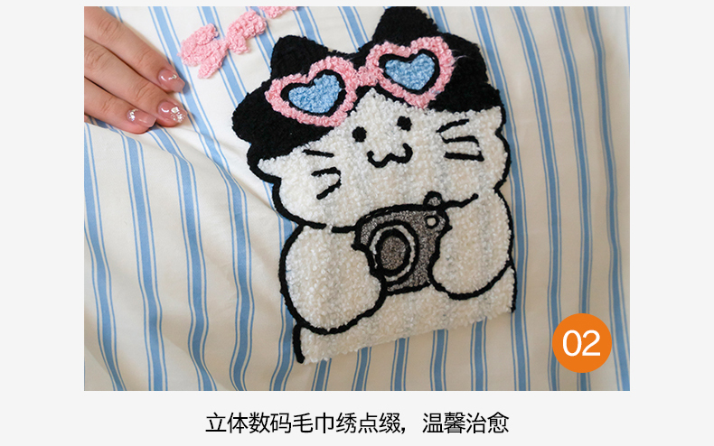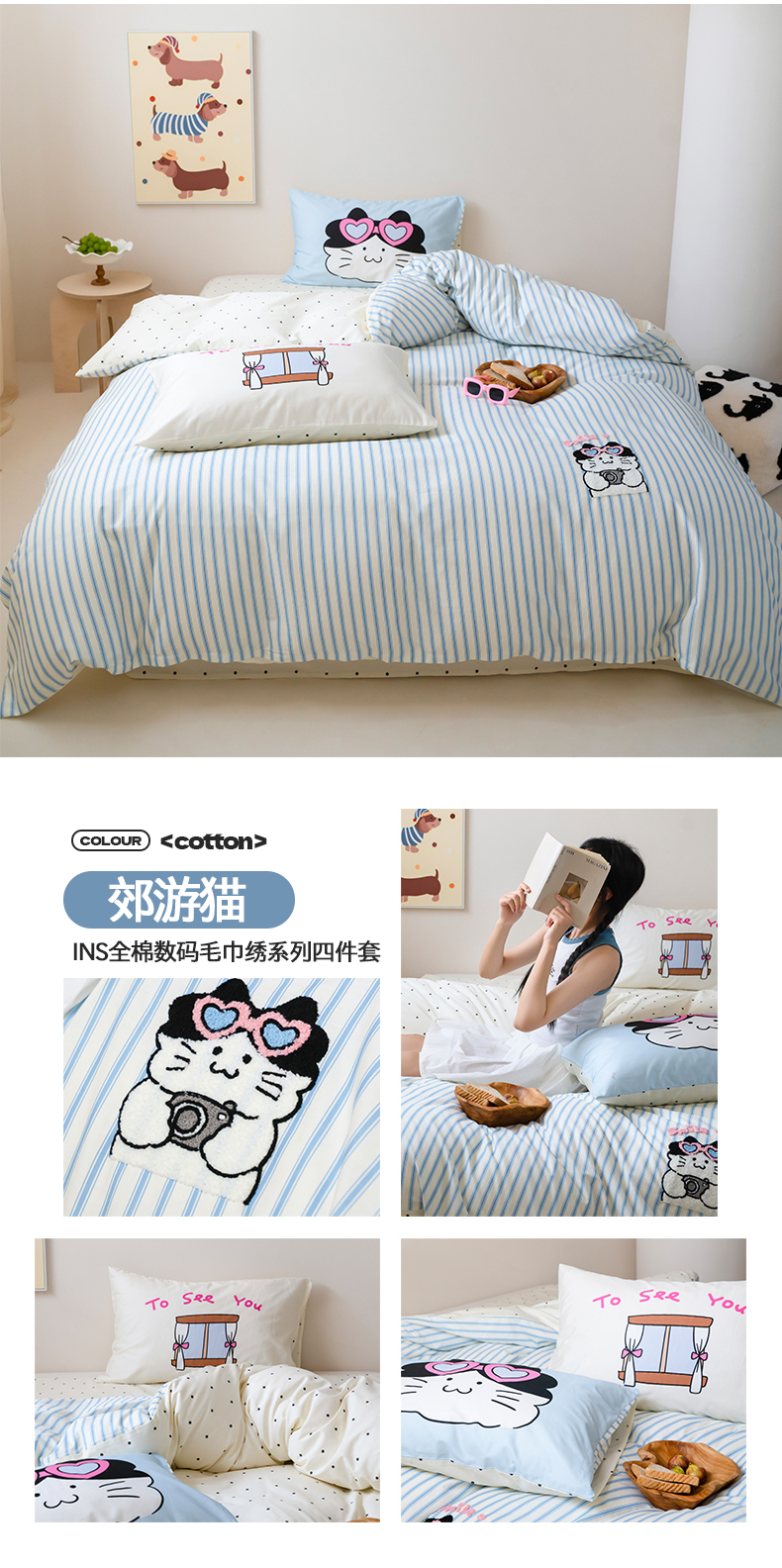 窝米2024毛巾绣x数码 13370全棉撞色卡通系列四件套 郊游猫