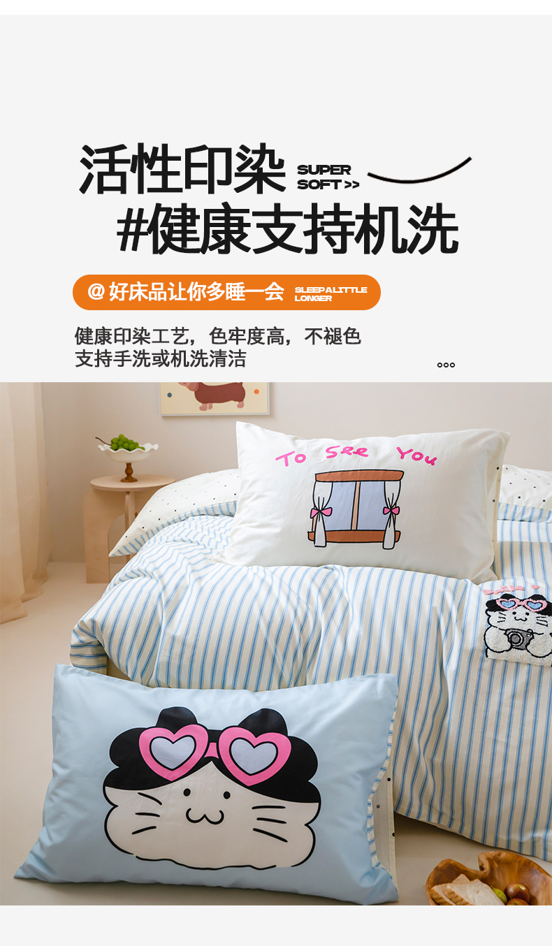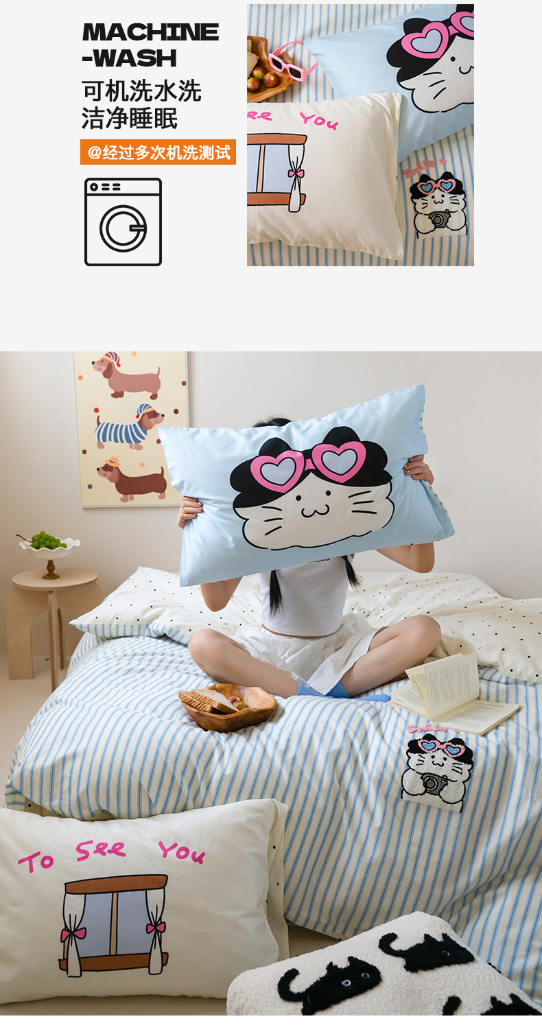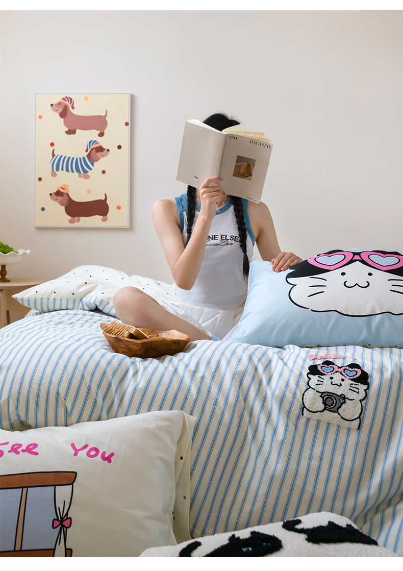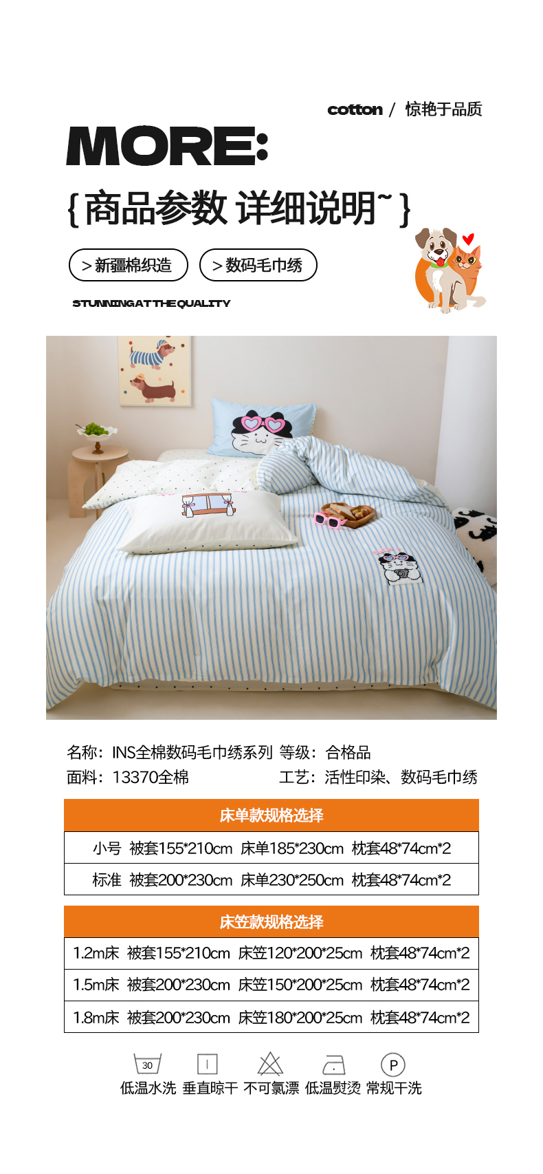 窝米2024毛巾绣x数码 13370全棉撞色卡通系列四件套 郊游猫