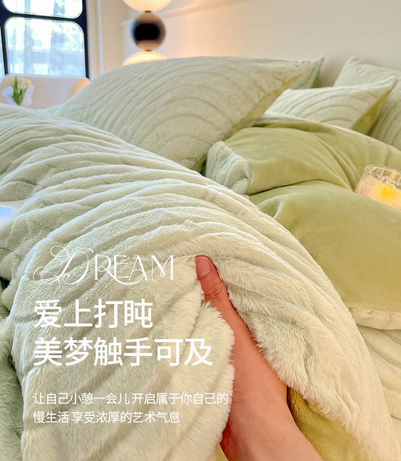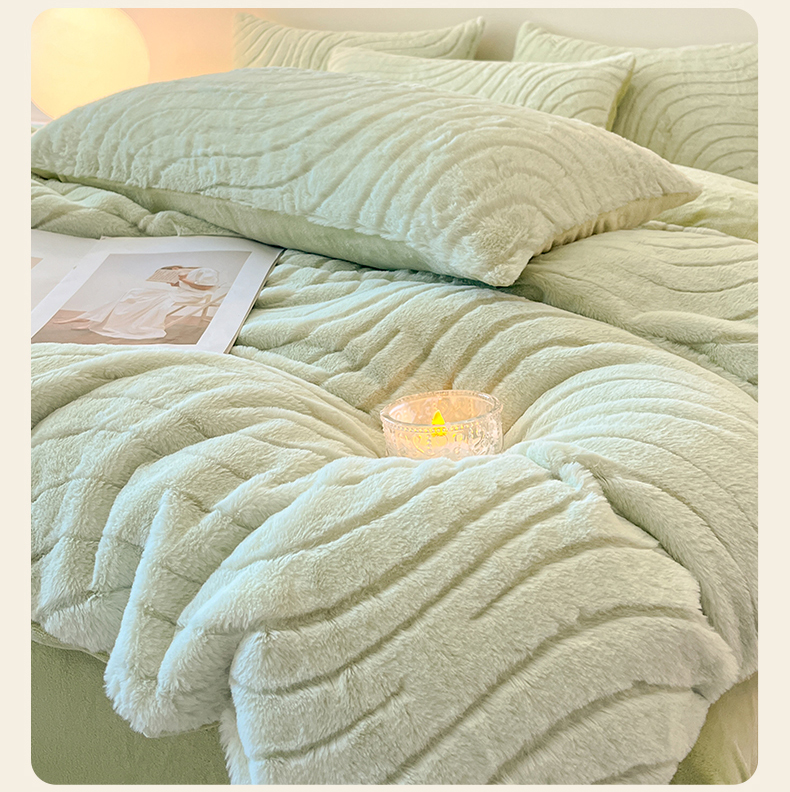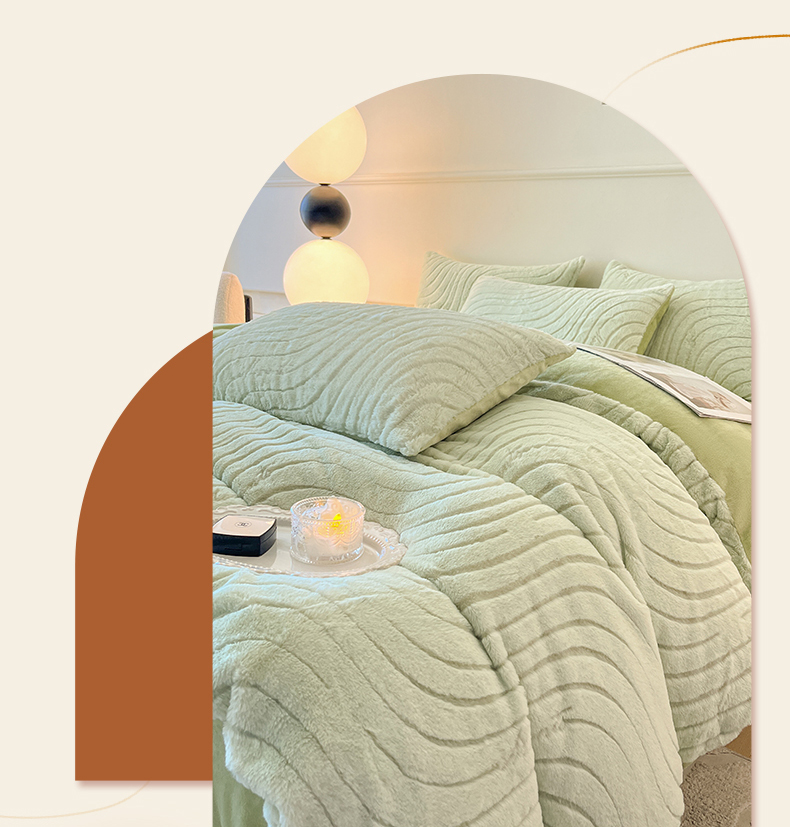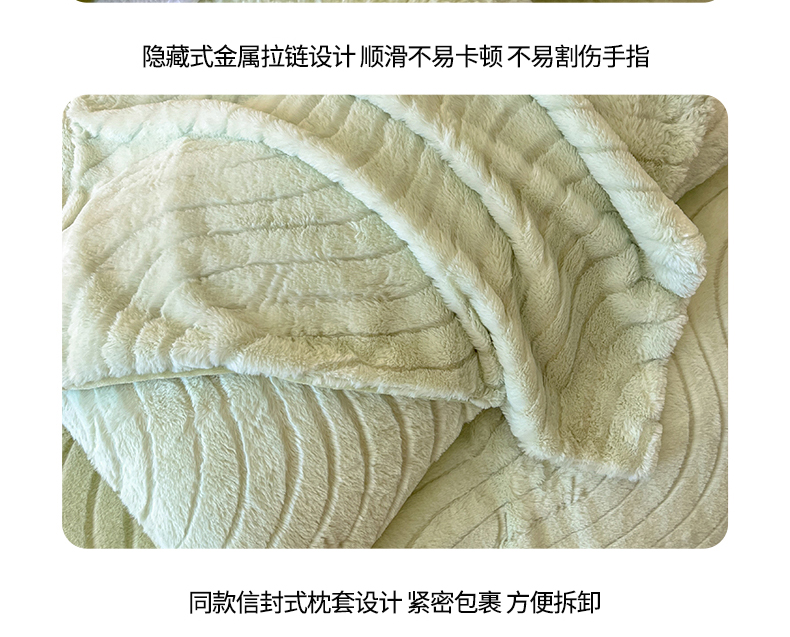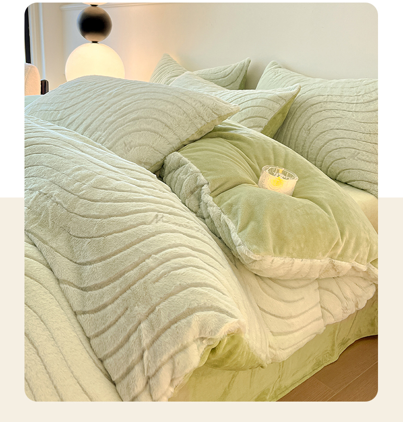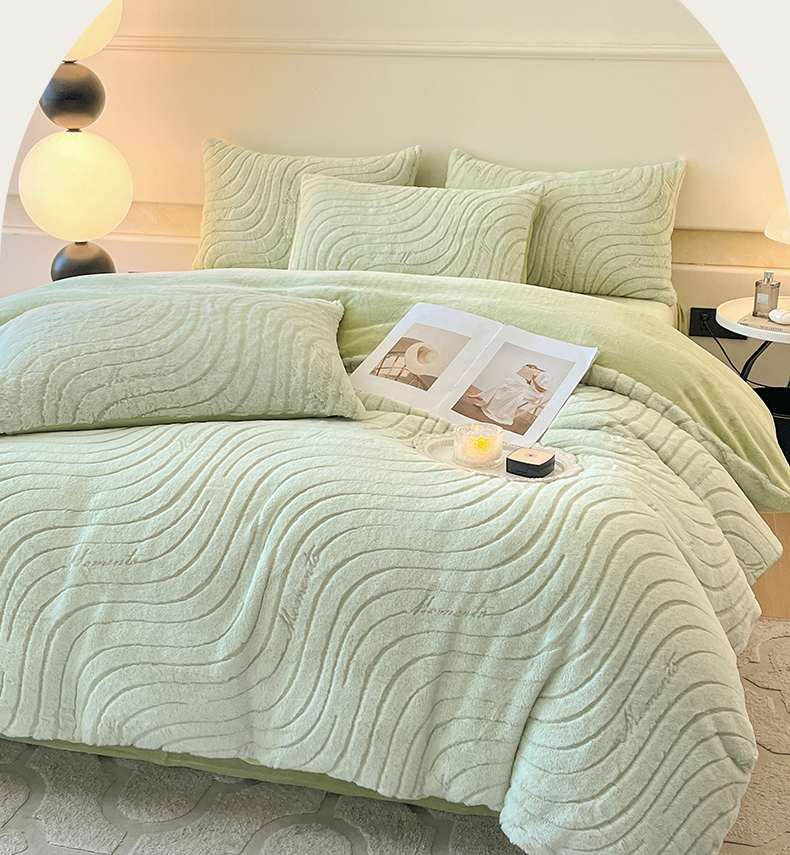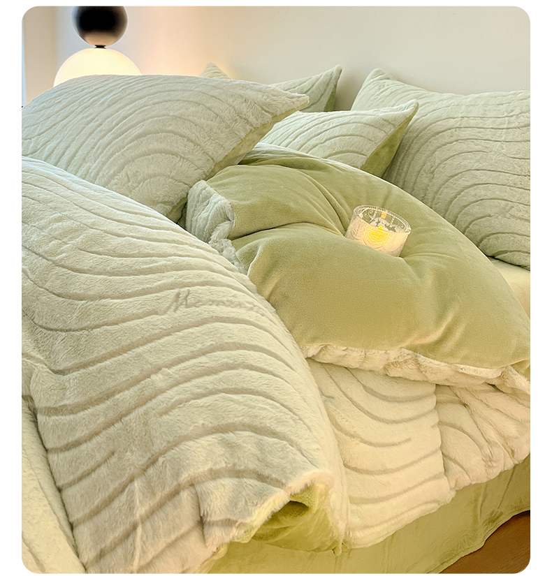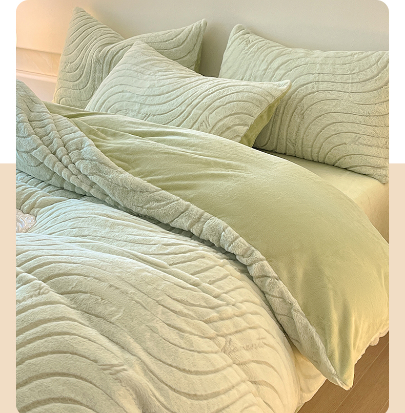 商品名称:2024新款高克重着色烂花兔毛绒牛奶绒四件套宝宝绒婴儿绒秋冬加厚法莱绒法兰绒珊瑚绒三件套 波浪-青梧绿