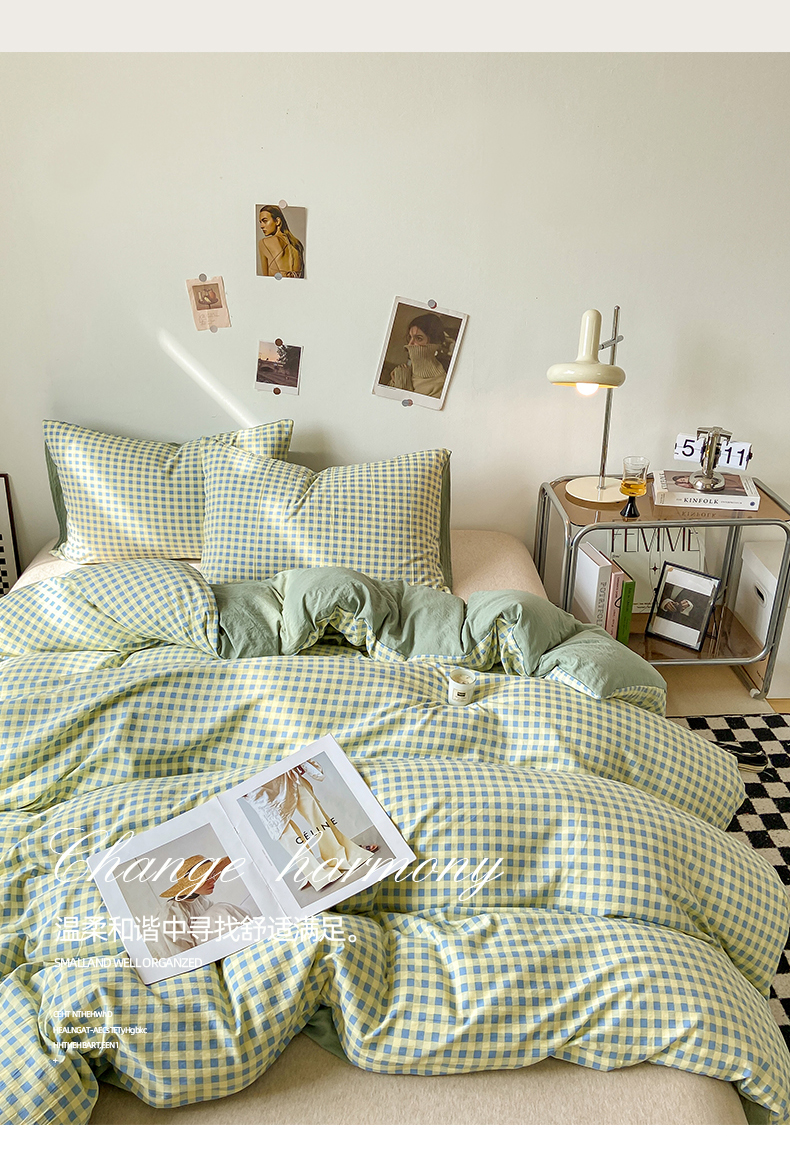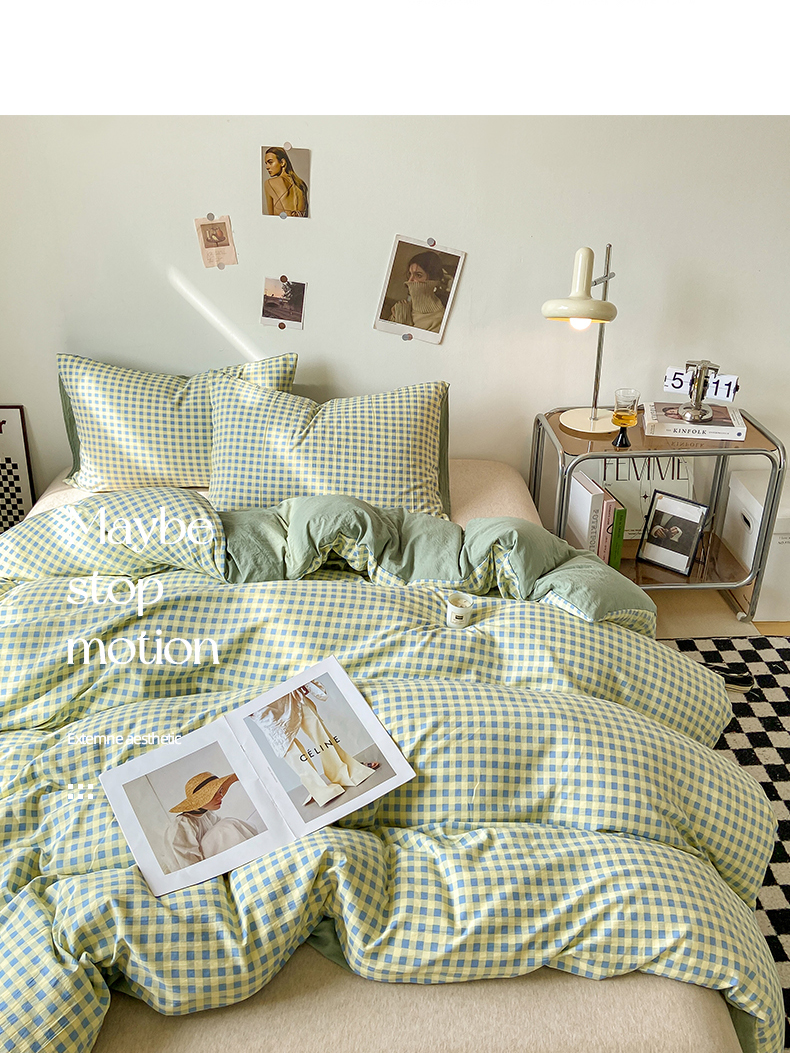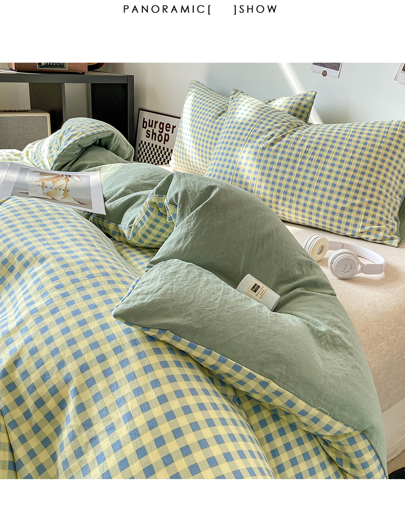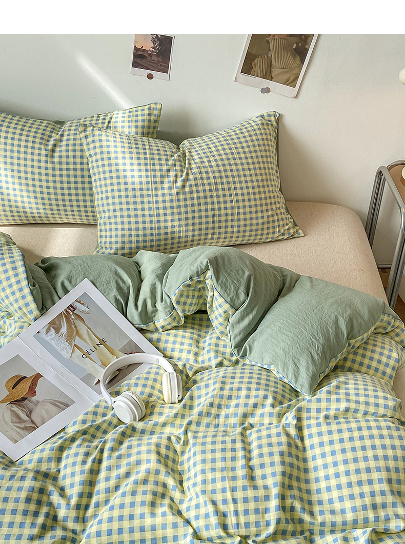 悦织湾家纺 2025新款日式简约格子水洗棉单品被套系列 布丁绿