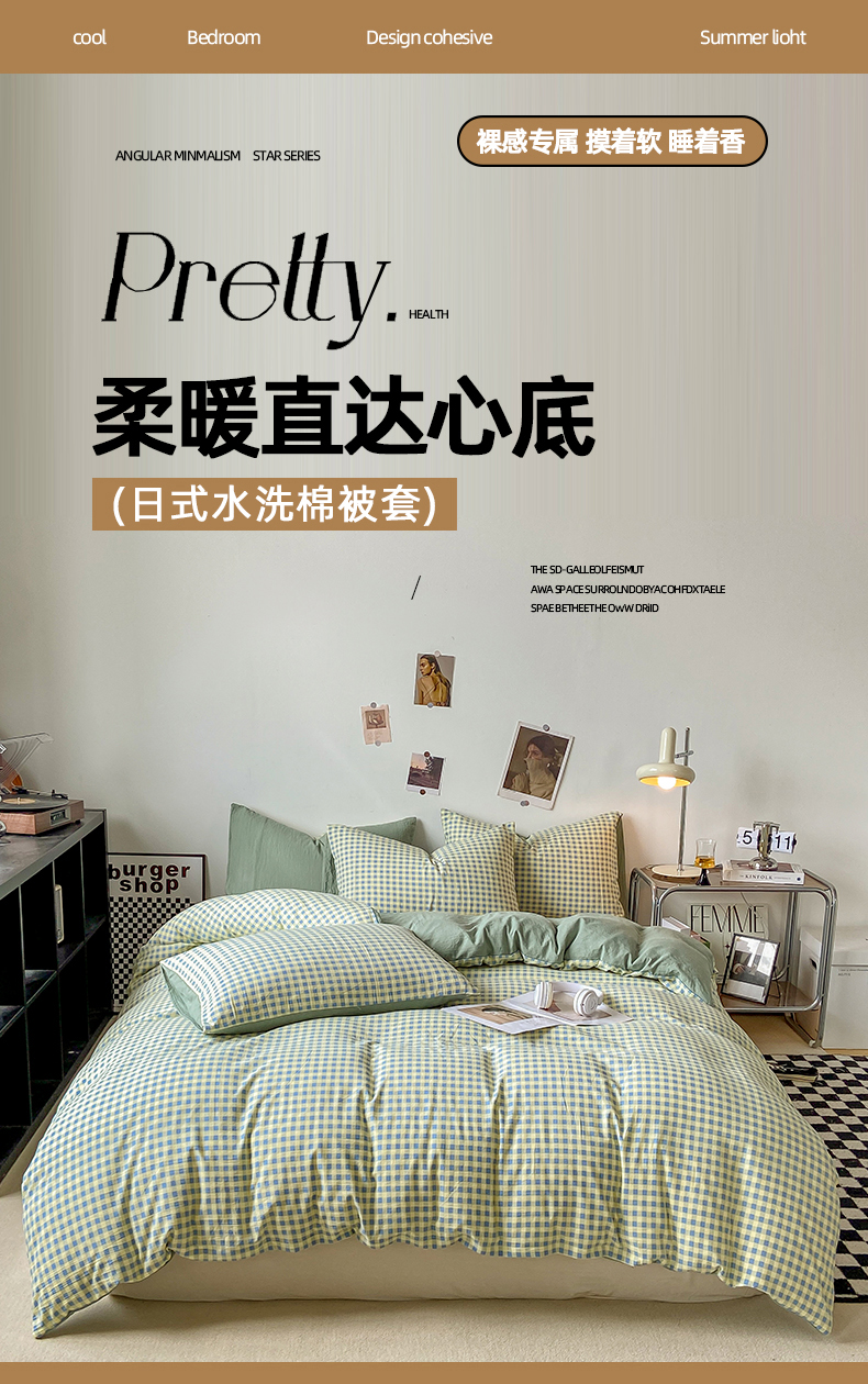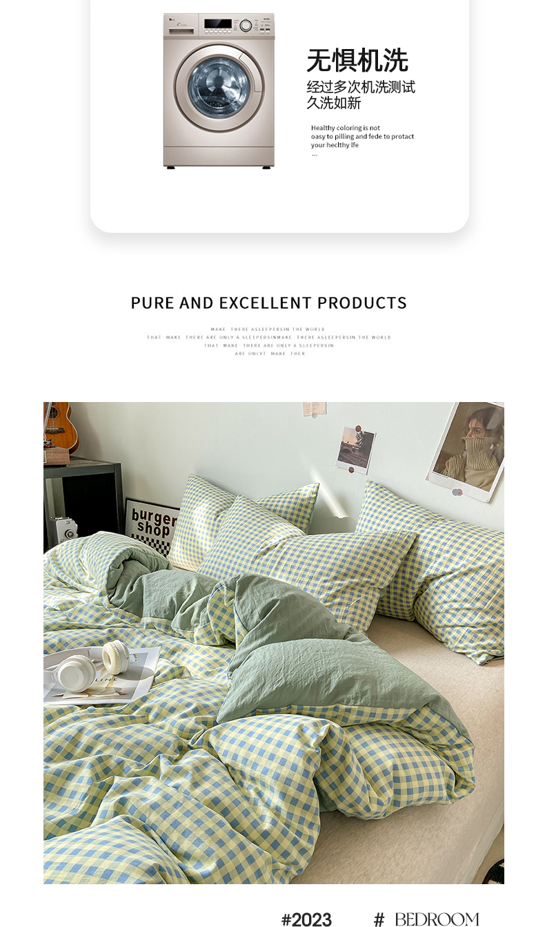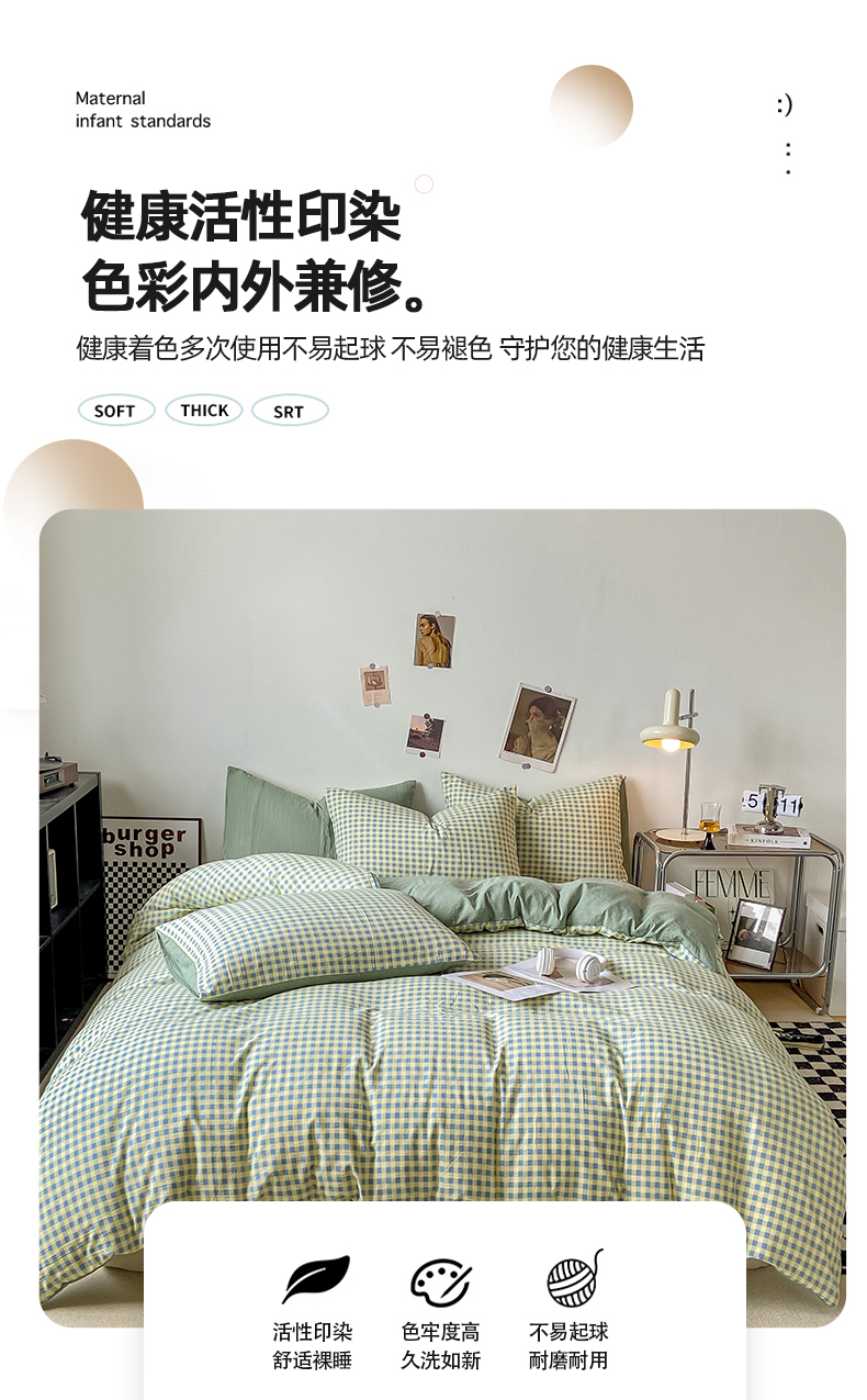 悦织湾家纺 2025新款日式简约格子水洗棉单品被套系列 布丁绿