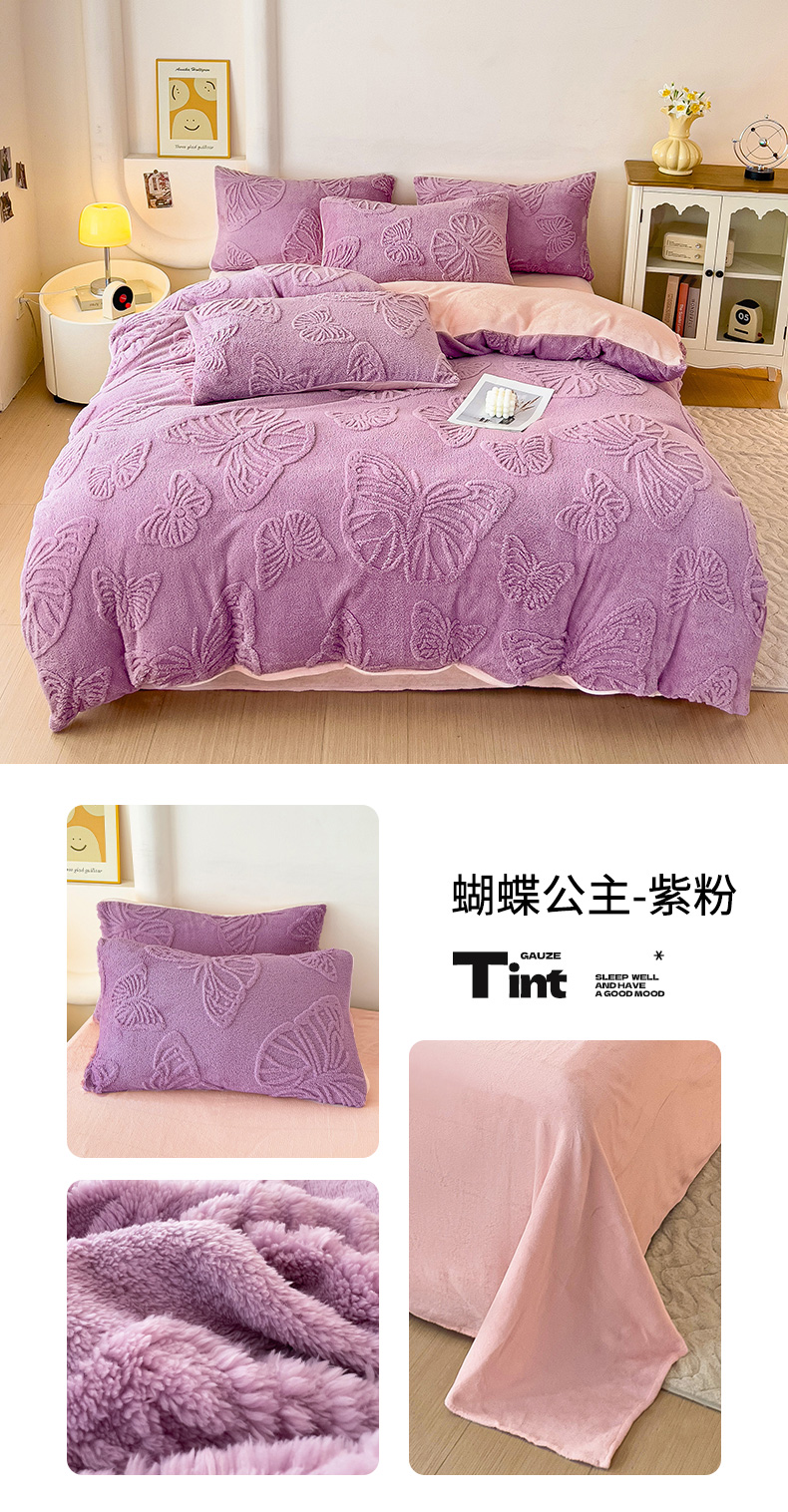 当前位置: 91家纺网 > 商品网购 > 床品套件 > 四件套 > 牛奶绒四件套 > 梦之岛 2024新款高克重提花雕花牛奶绒四件套 蝴蝶公主-紫粉