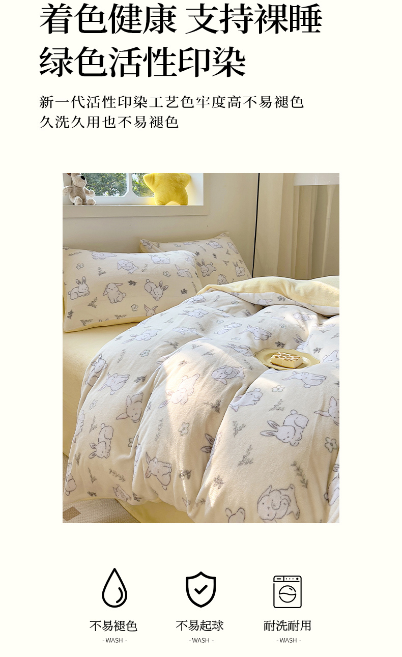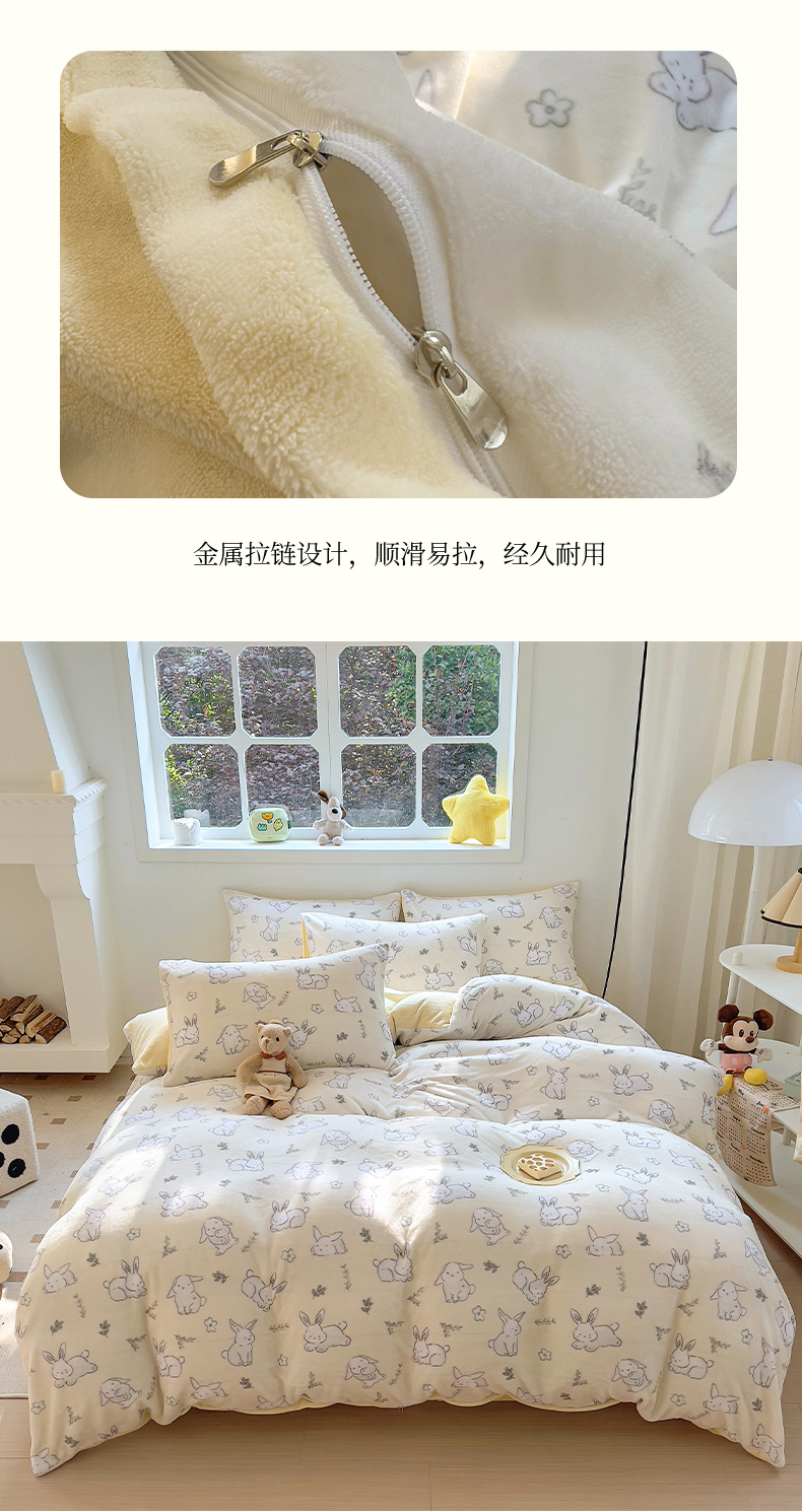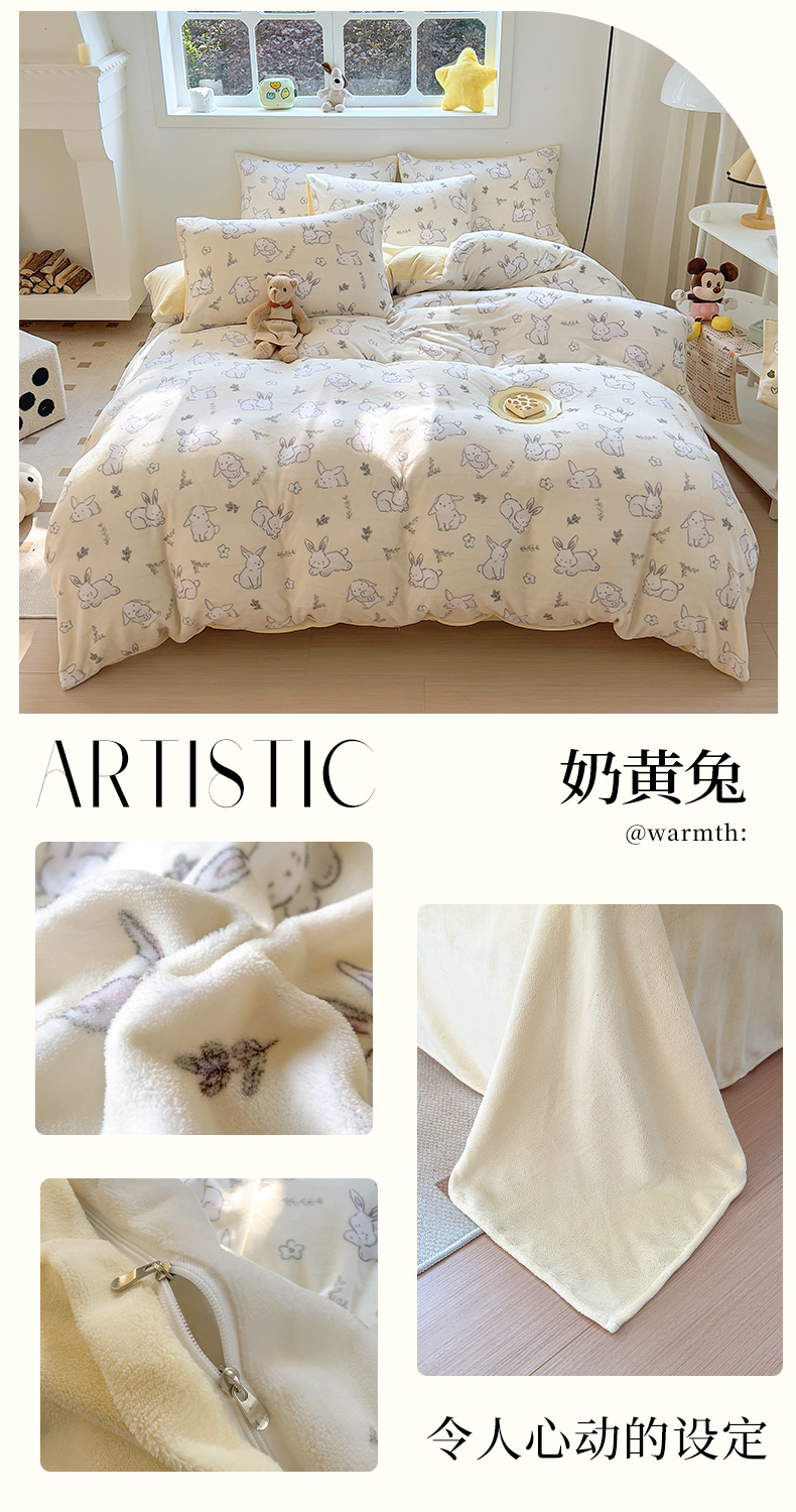 商品名称:山茶家纺 2024新款高克重印花牛奶绒四件套 奶黄兔
