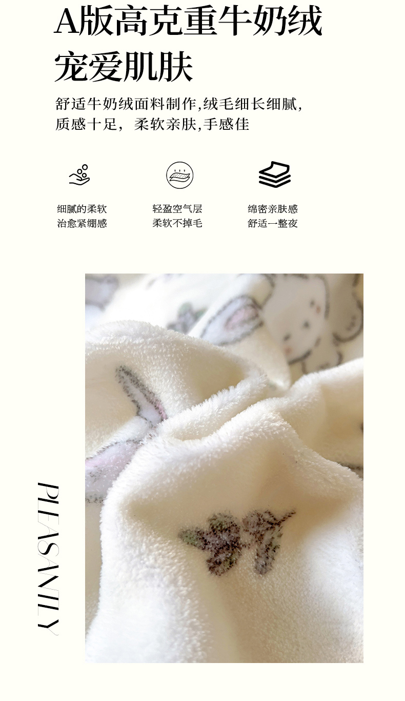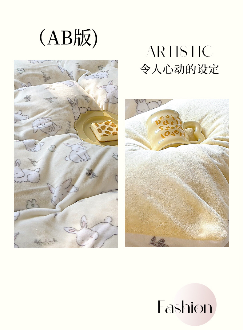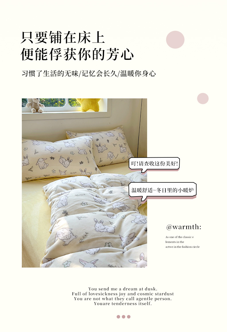 商品名称:山茶家纺 2024新款高克重印花牛奶绒四件套 奶黄兔