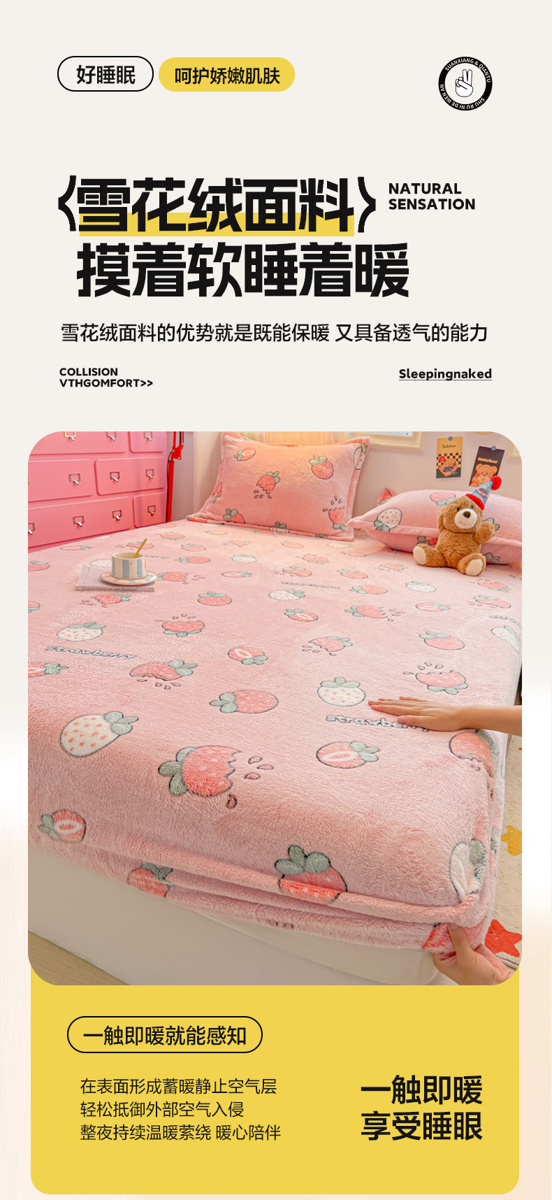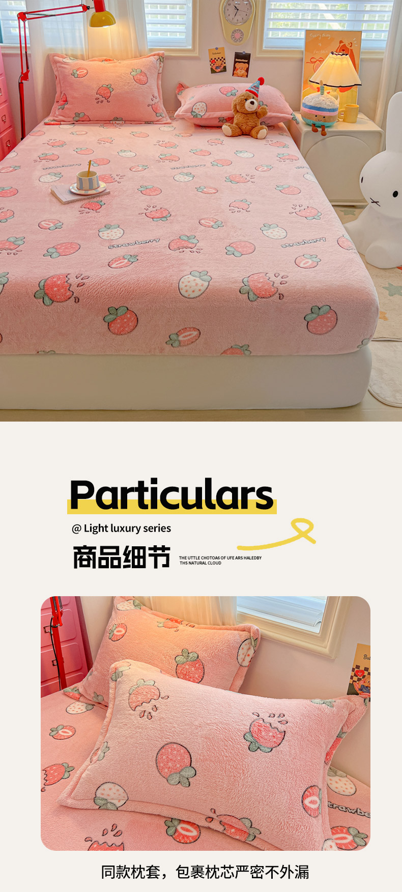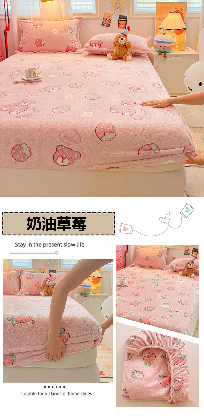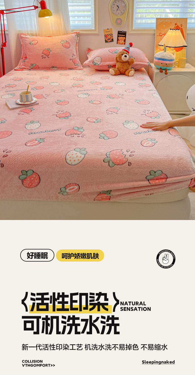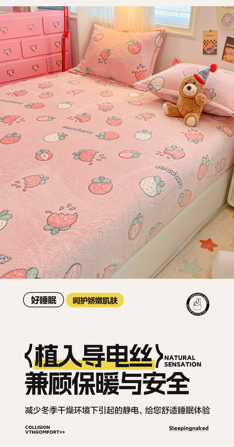 • 91家纺网 家纺一手货源 找家纺 韩巢家纺 2024新款加厚雪花绒卡通印花保暖床笠三件套 奶油草莓