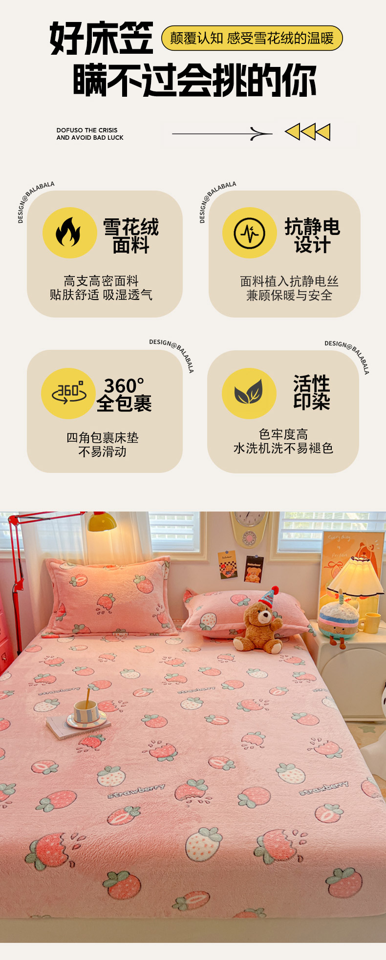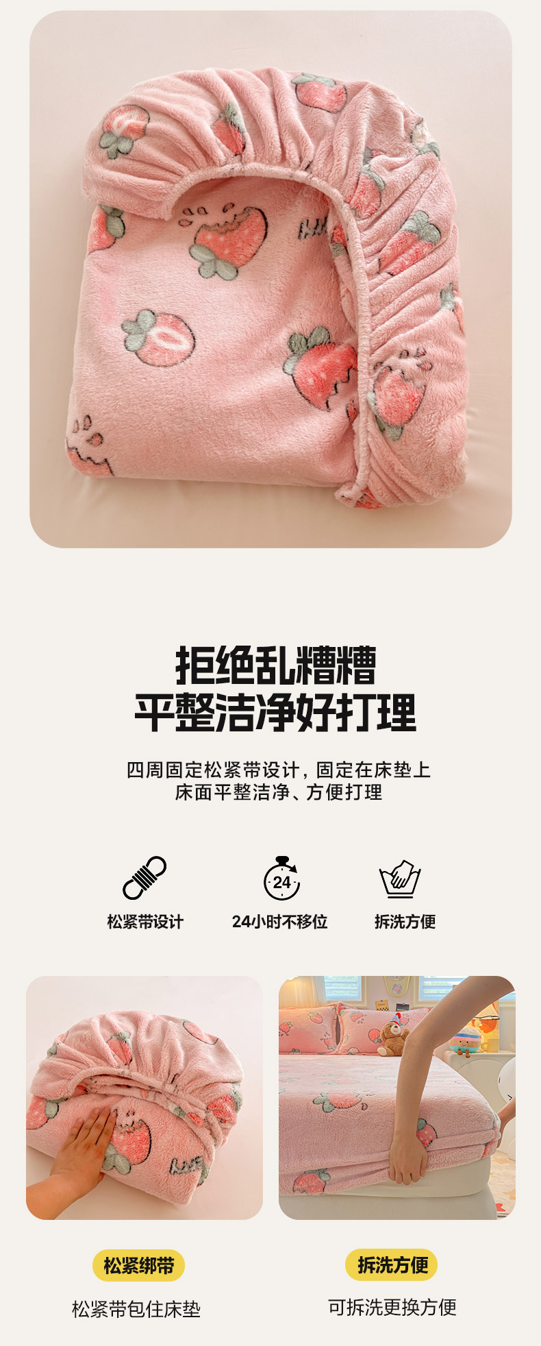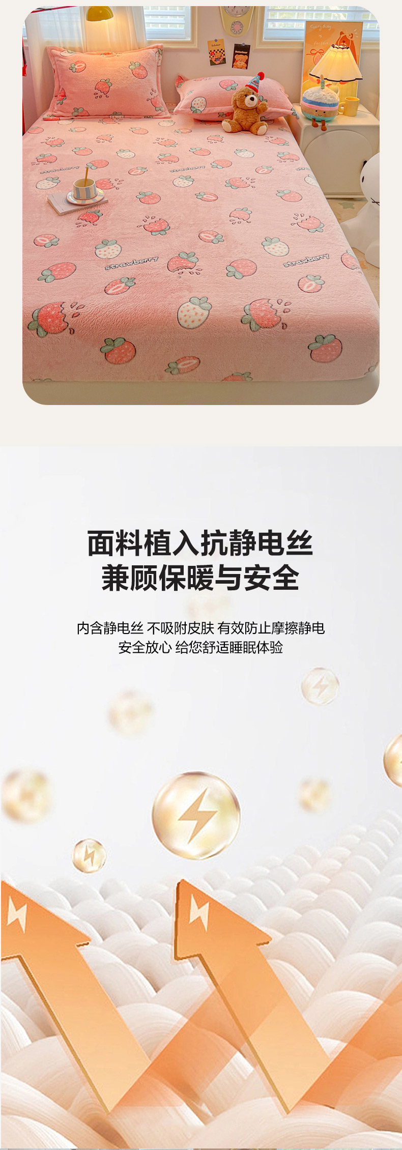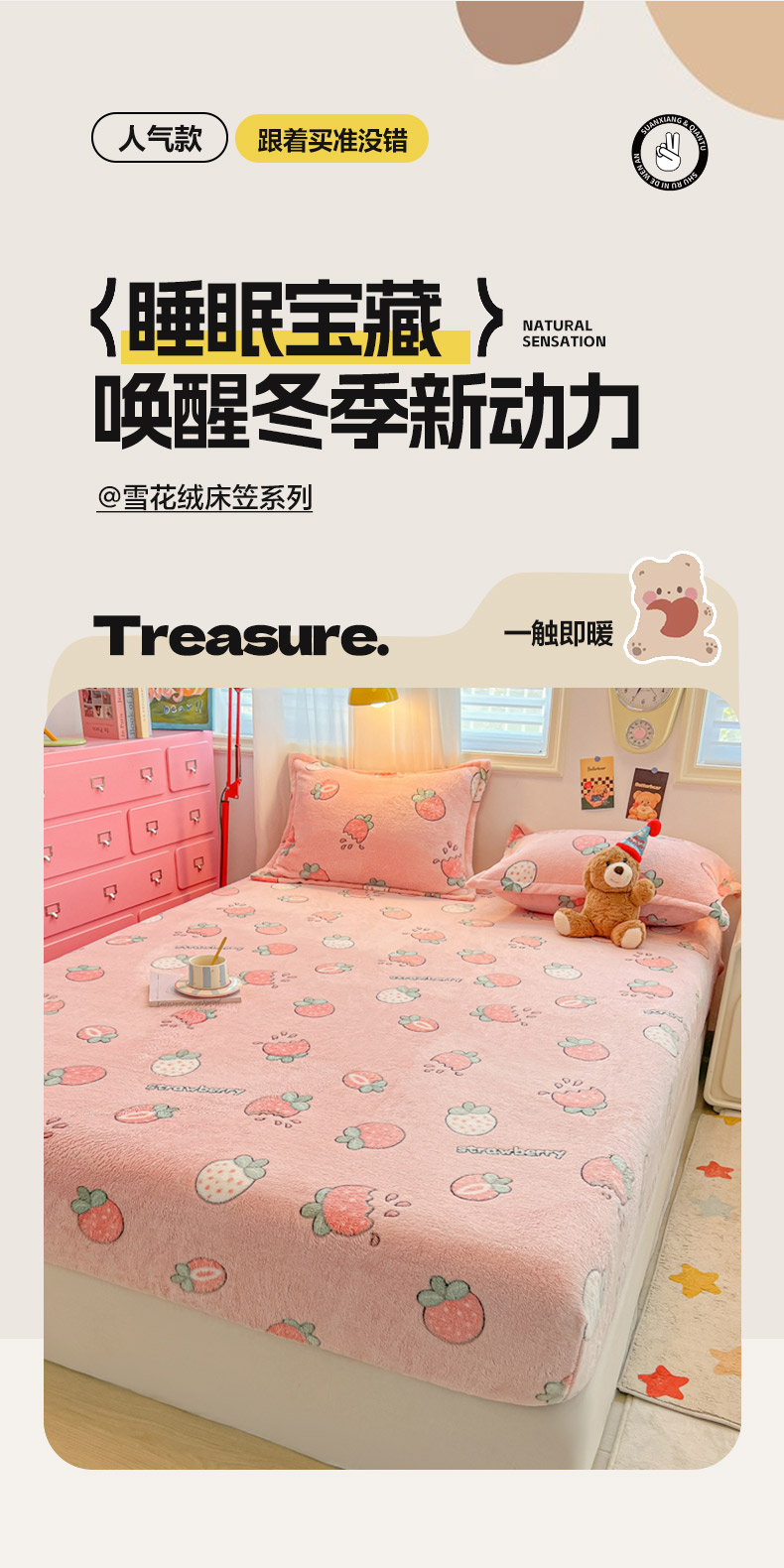 • 91家纺网 家纺一手货源 找家纺 韩巢家纺 2024新款加厚雪花绒卡通印花保暖床笠三件套 奶油草莓