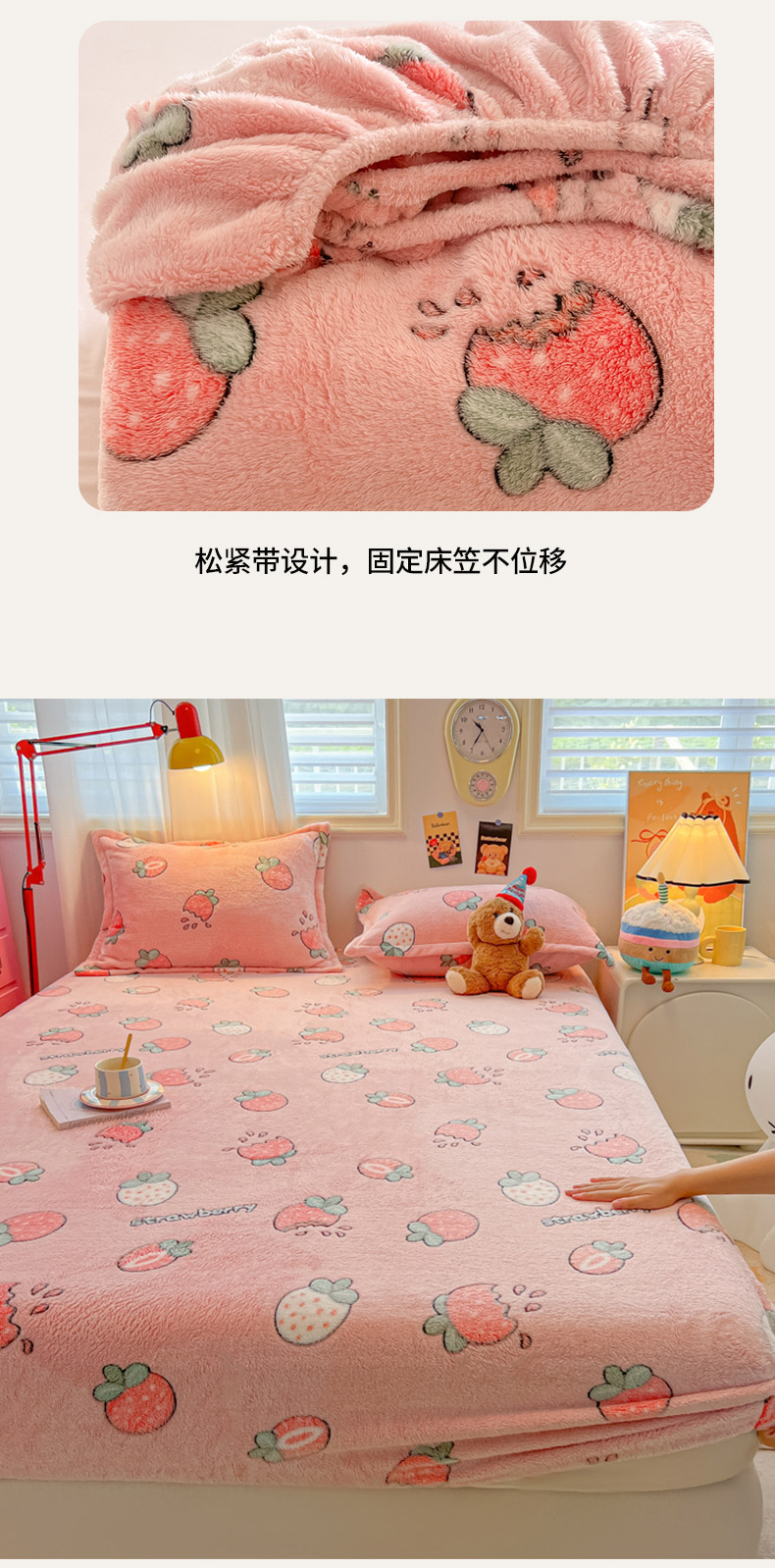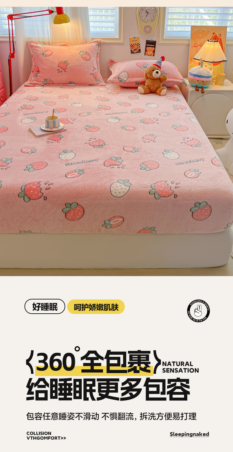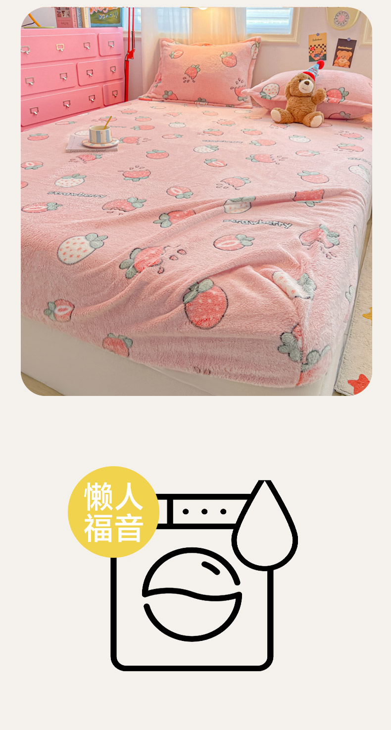 韩巢家纺 2024新款加厚雪花绒卡通印花保暖床笠三件套 奶油草莓