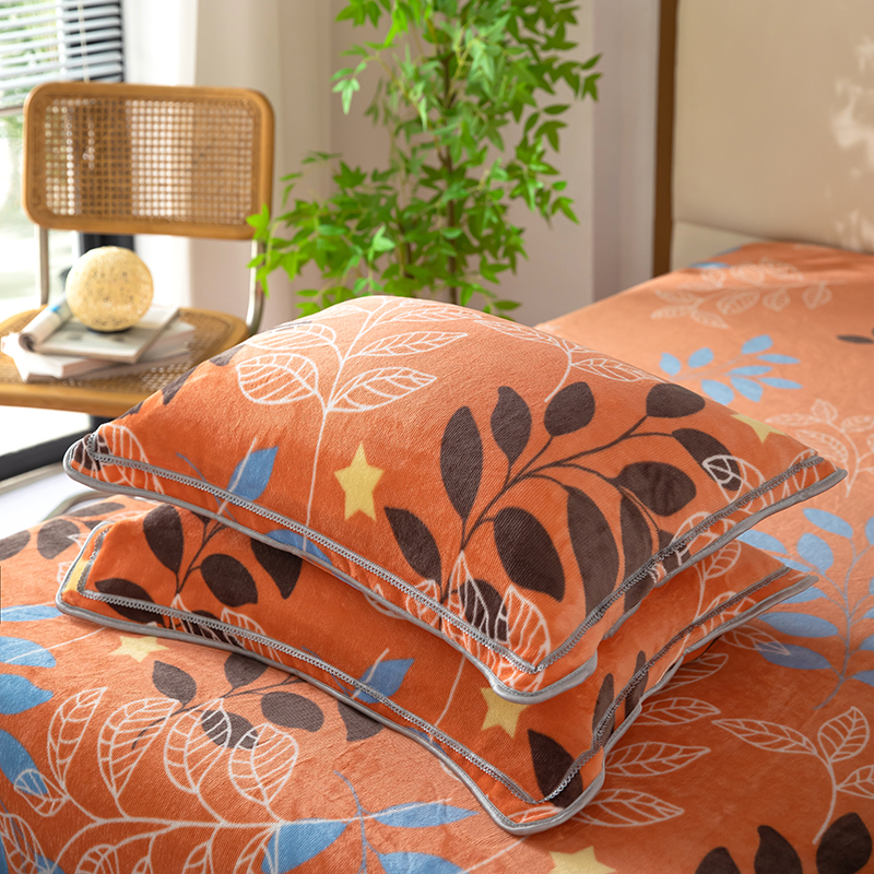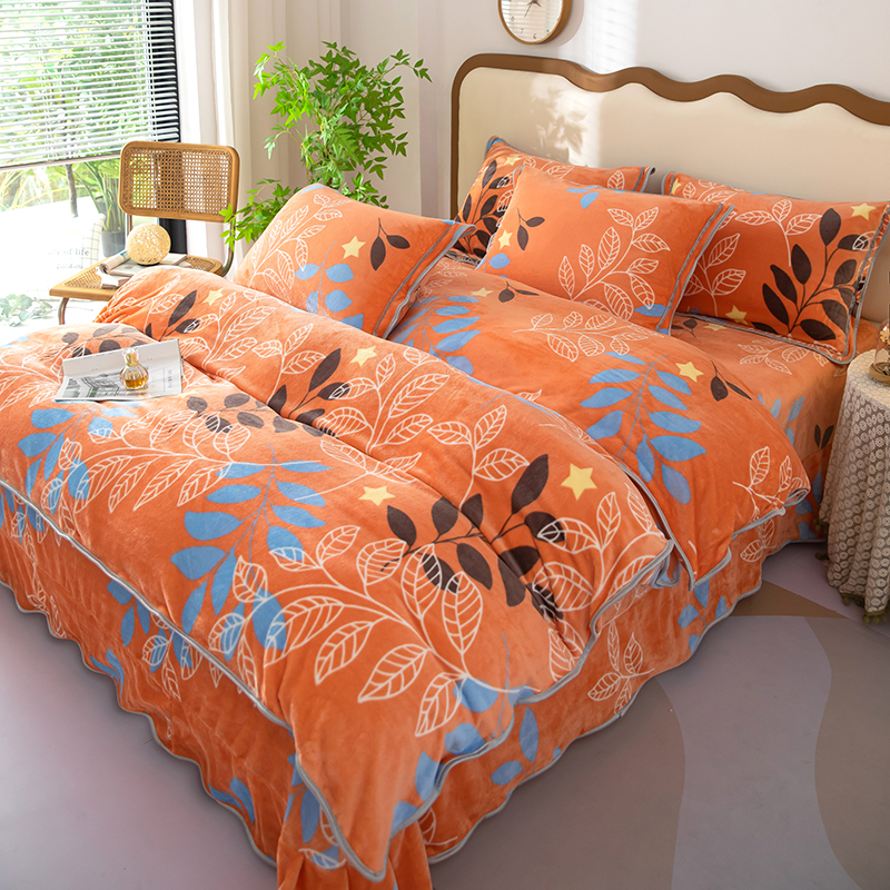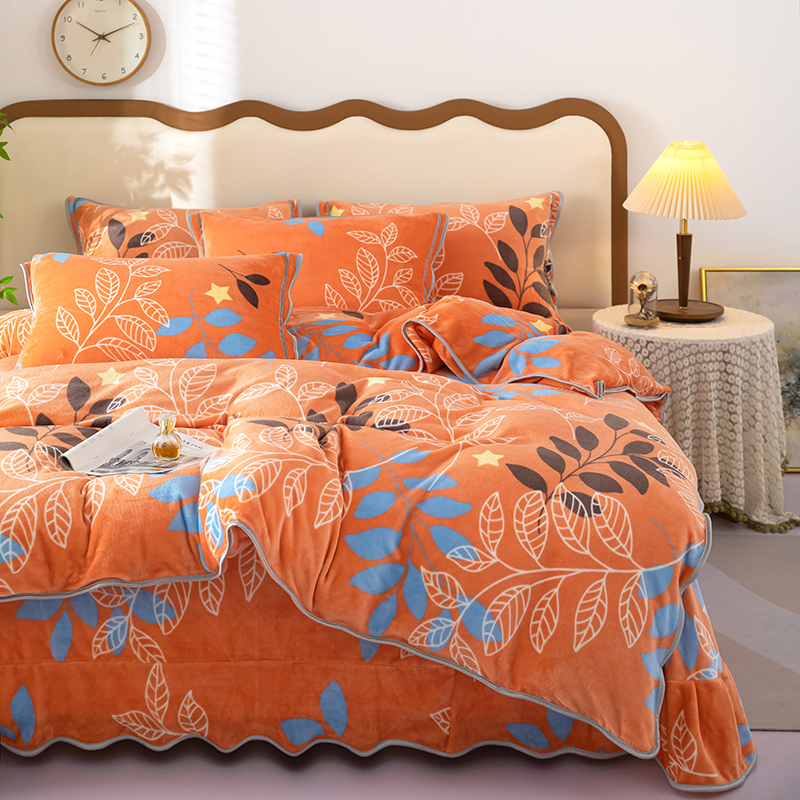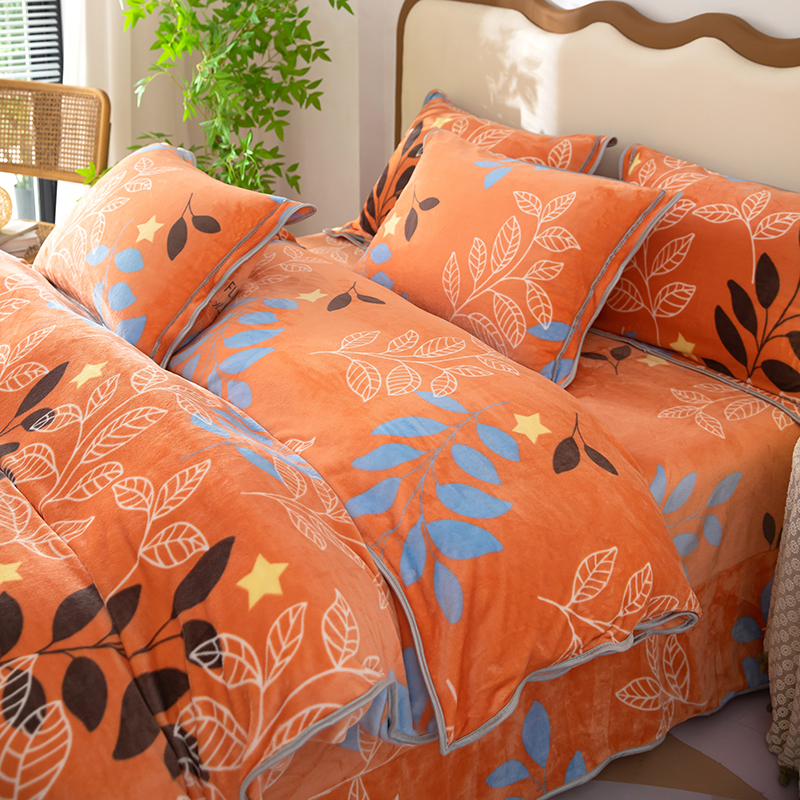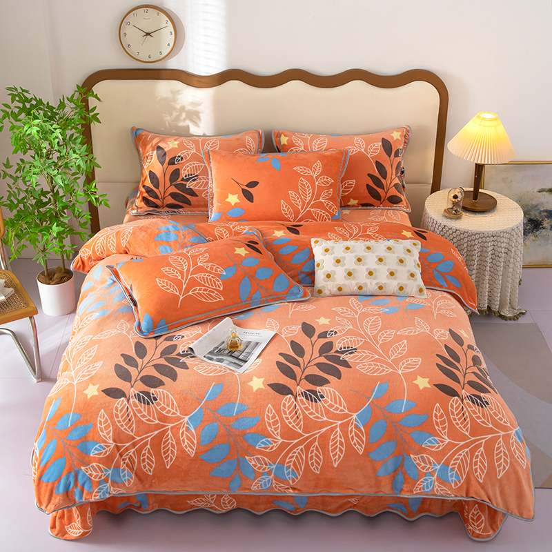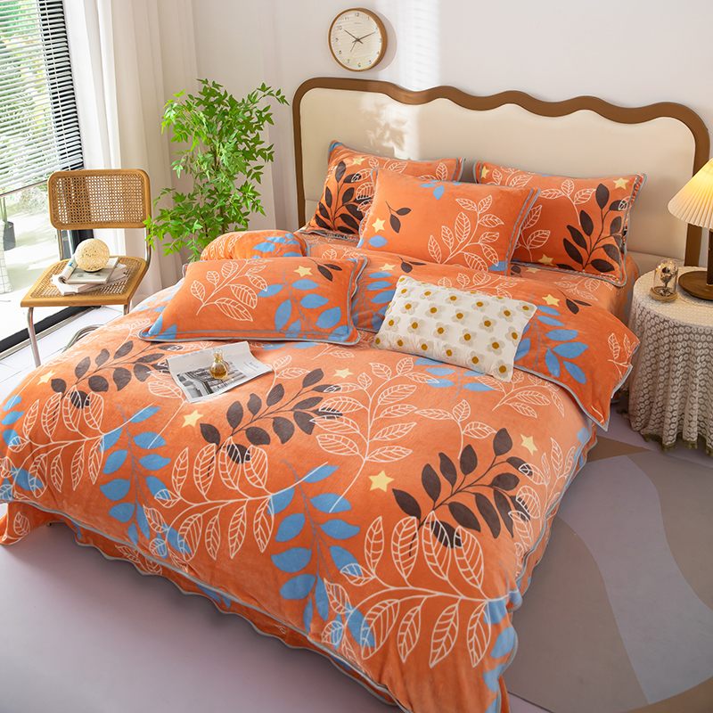 雨萝家纺 2024新款亲肤舒适牛奶绒四件套 叶幕-橙