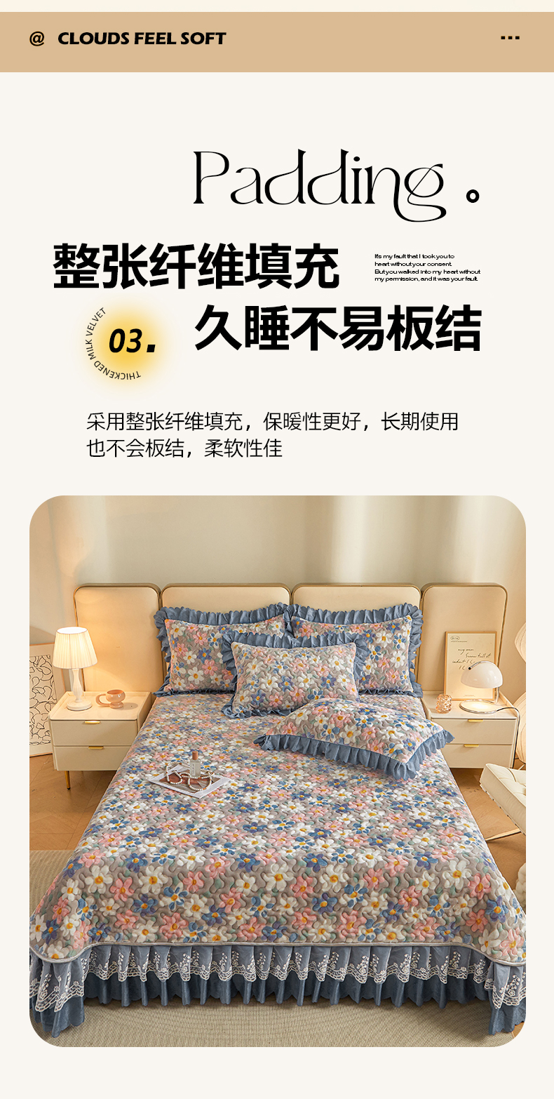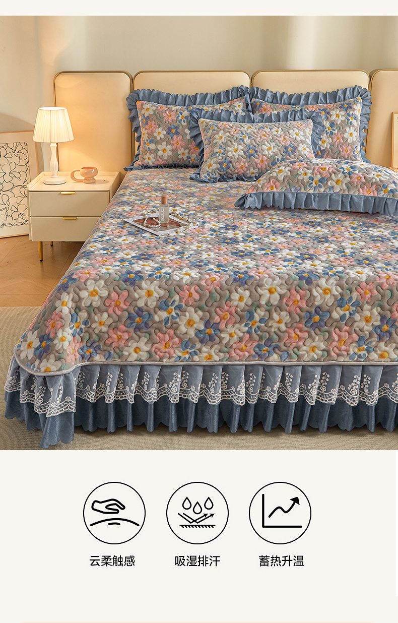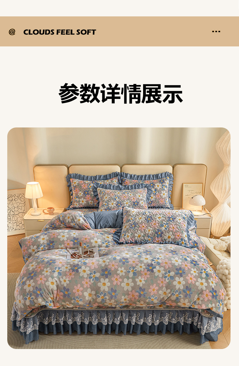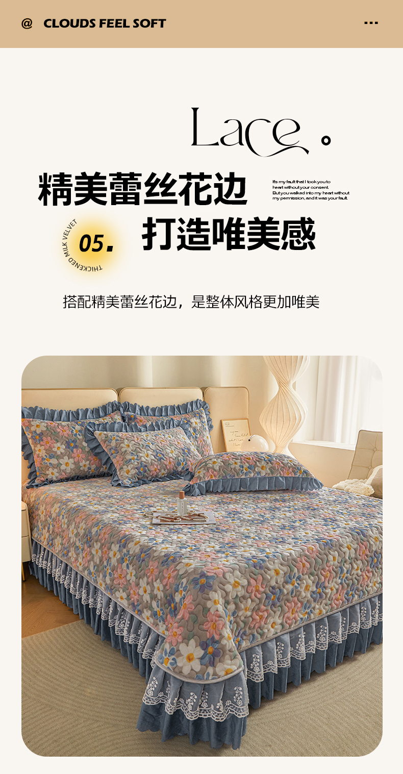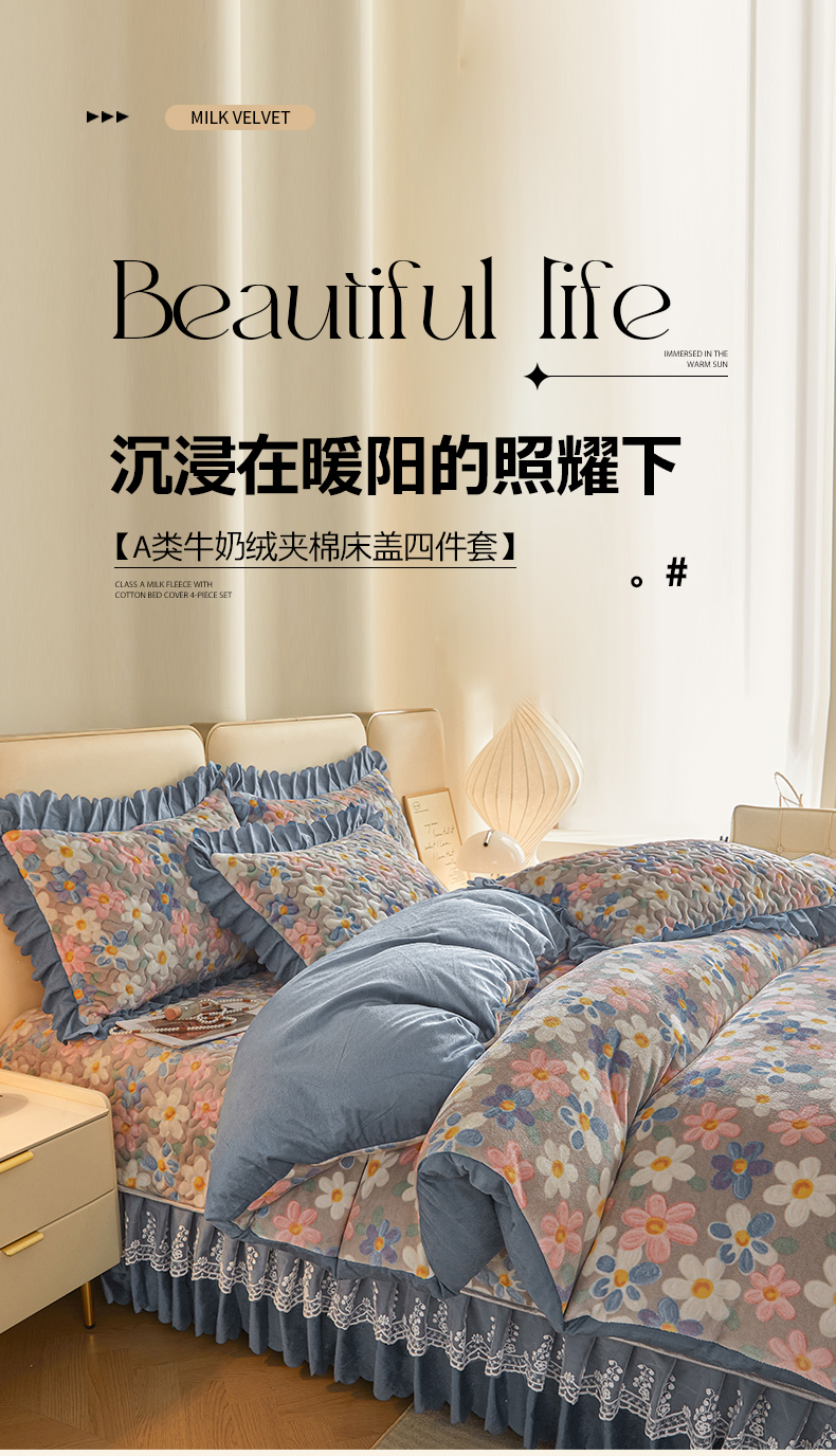 • 91家纺网 家纺一手货源 找家纺 艾裙海 2025新款高克重加厚保暖A类牛奶绒夹棉床盖系列四件套 美丽花园