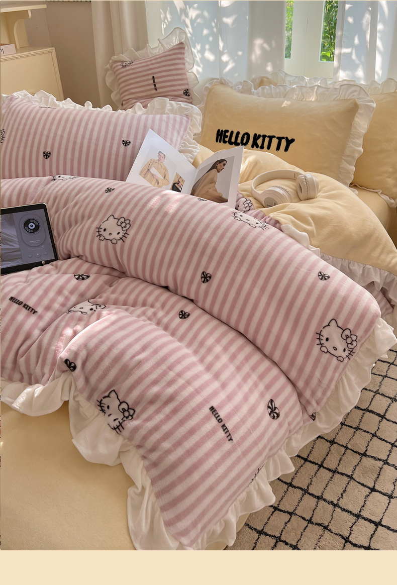 三朵家纺 2024新款高克重加厚保暖牛奶绒三丽鸥花边四件套 花边-可可KT黄