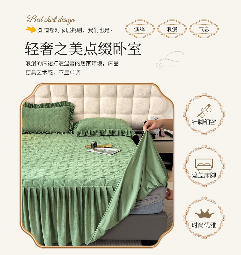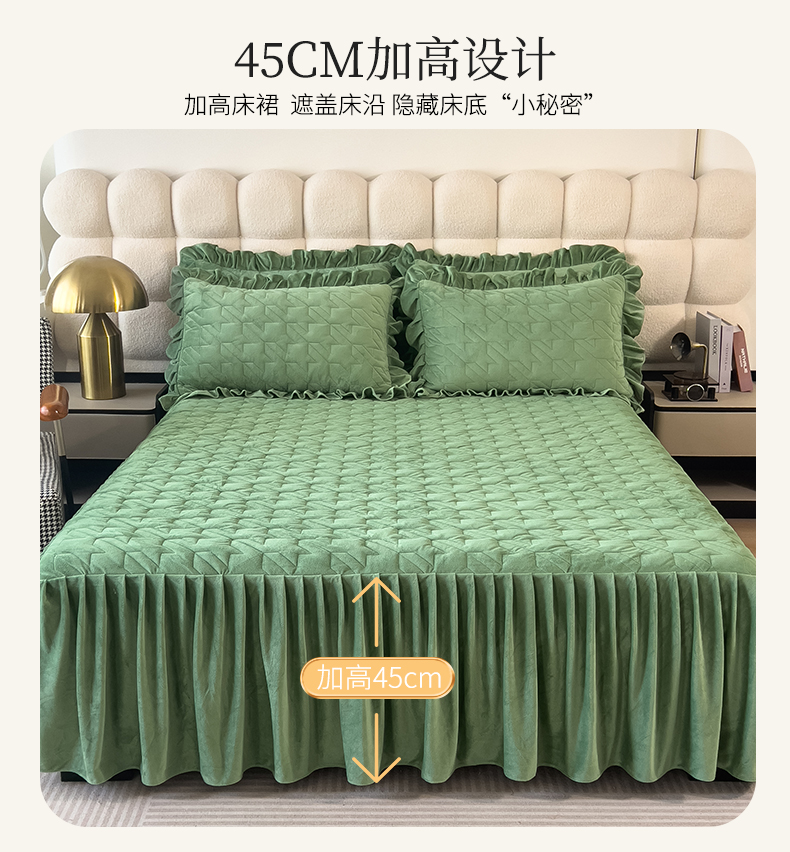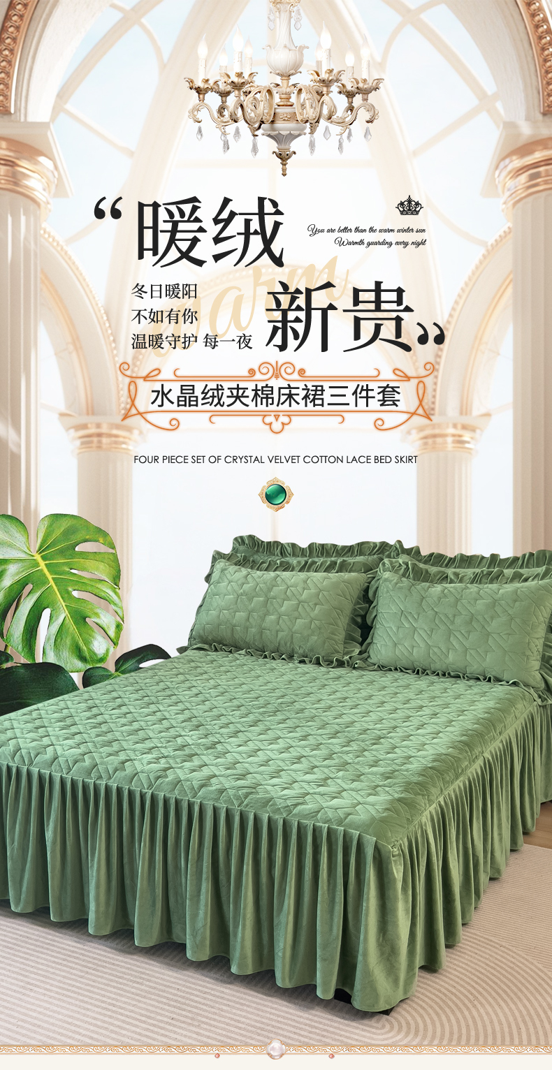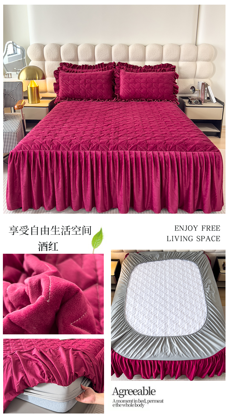 (总)屹成家纺2025新款水晶绒夹棉绗缝蕾丝床裙三件套(塞纳河畔)床裙单件起售价不低于105元,大红,豆沙,翡翠绿,粉玉,橄榄绿,蔚蓝,银灰
