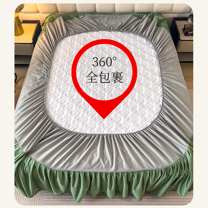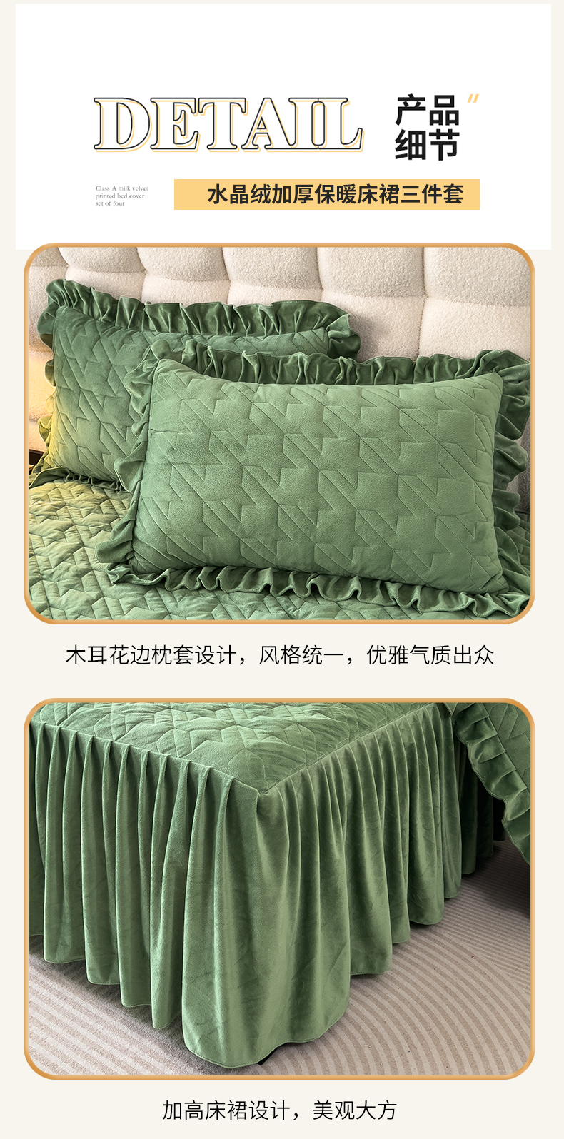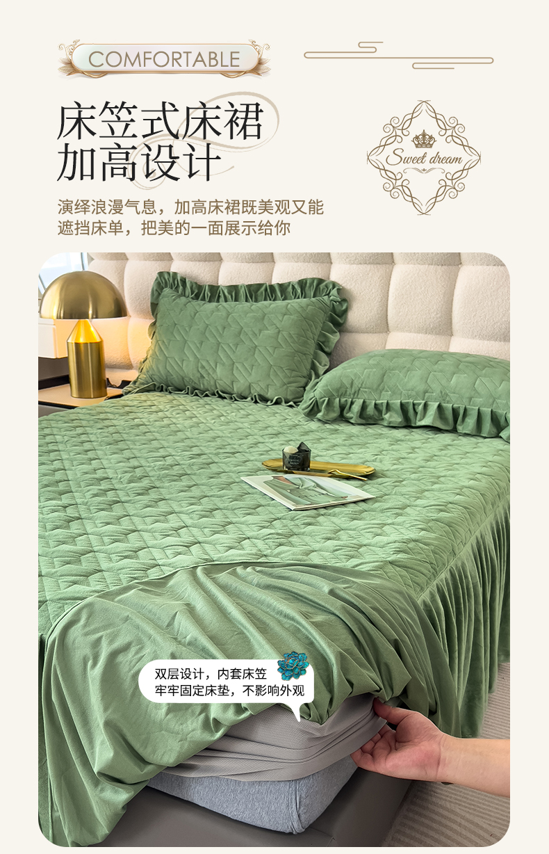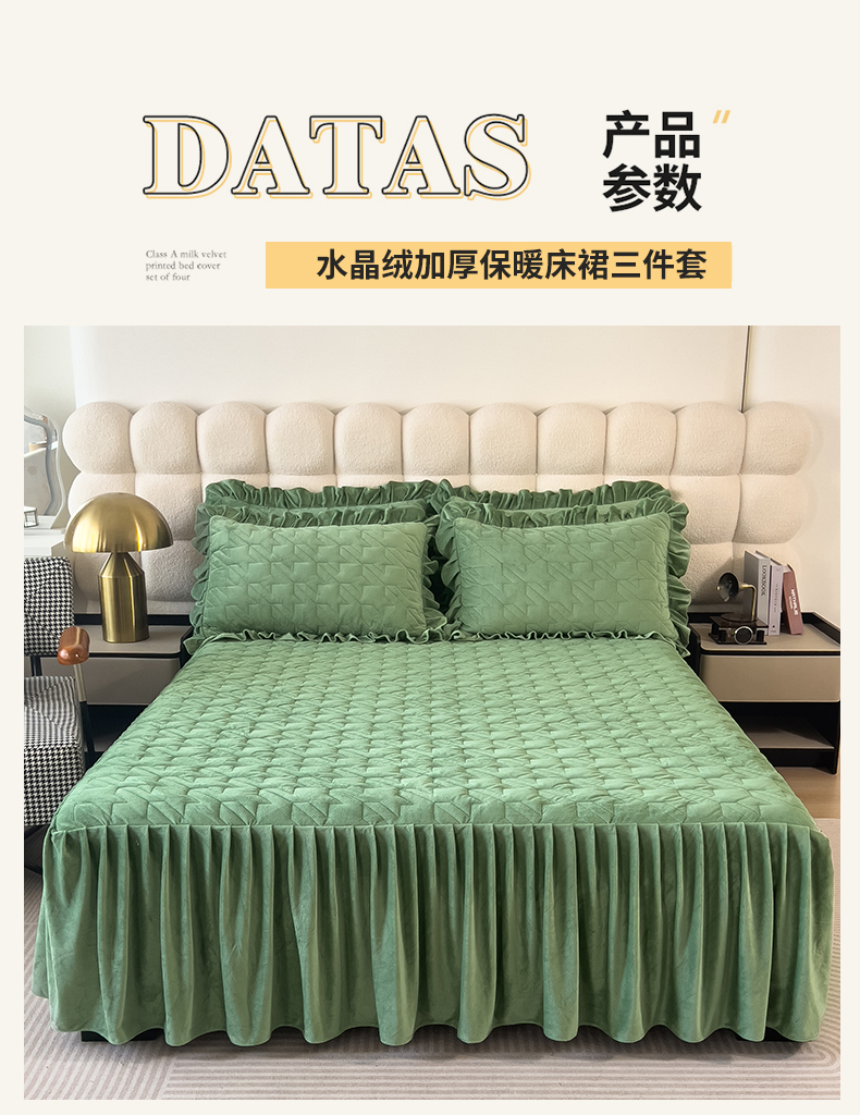 (总)屹成家纺2025新款水晶绒夹棉绗缝蕾丝床裙三件套(塞纳河畔)床裙单件起售价不低于105元,大红,豆沙,翡翠绿,粉玉,橄榄绿,蔚蓝,银灰