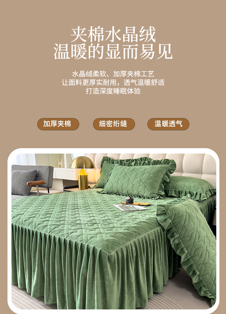 (总)屹成家纺2025新款水晶绒夹棉绗缝床裙四件套(塞纳河畔)四件套起售价不低于230元,大红,豆沙,翡翠绿,粉玉,橄榄绿,蔚蓝,银灰