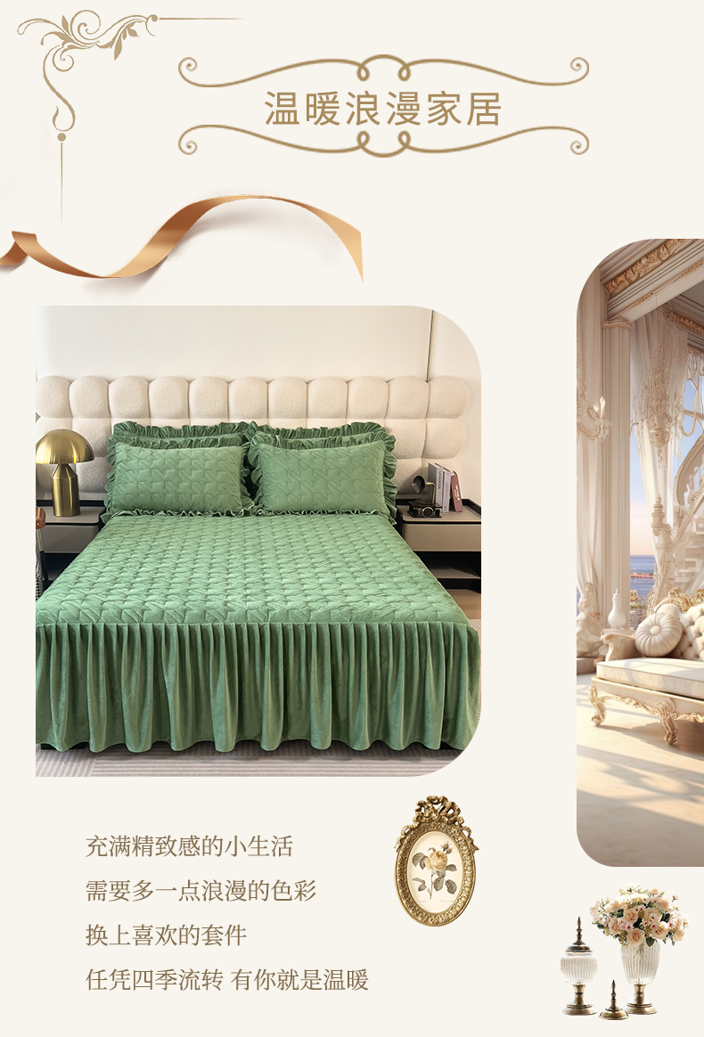 • 91家纺网 家纺一手货源 找家纺 (总)屹成家纺2025新款水晶绒夹棉绗缝蕾丝床裙三件套(塞纳河畔)床裙单件起售价不低于105元,大红,豆沙,翡翠绿,粉玉,橄榄绿,蔚蓝,银灰