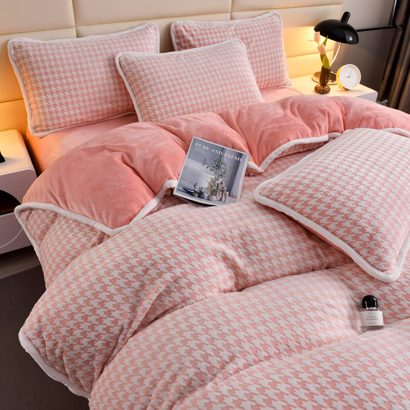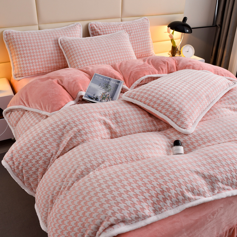 商品名称:诺梵 2025新款8斤立体雕花牛奶绒四件套_控价标准高于139,加大高于149 千鸟格-粉