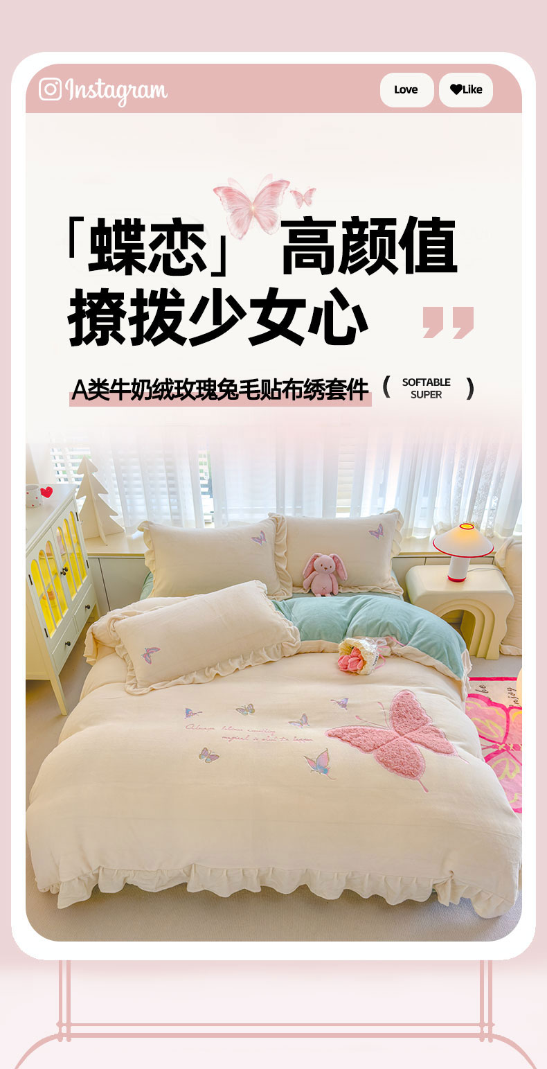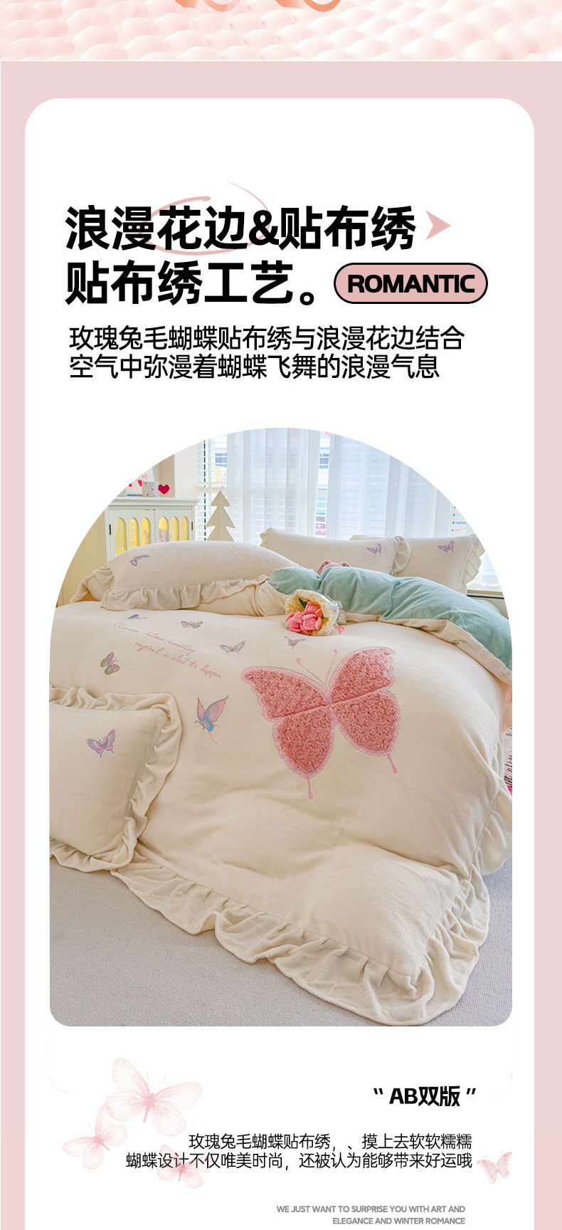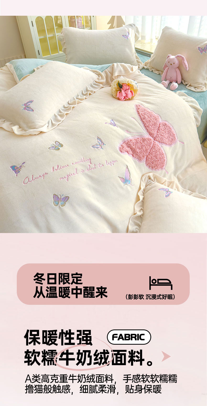 当前位置: 91家纺网 > 商品网购 > 床品套件 > 四件套 > 牛奶绒四件套 > 灰鲸 2025新款A类牛奶绒玫瑰兔毛贴布绣四件套 贴布绣蝶恋-奶昔白+薄荷绿