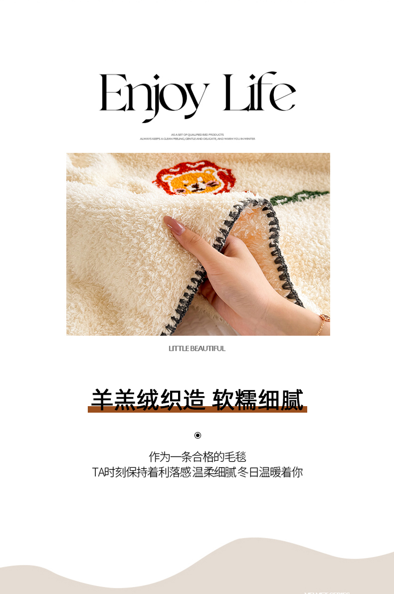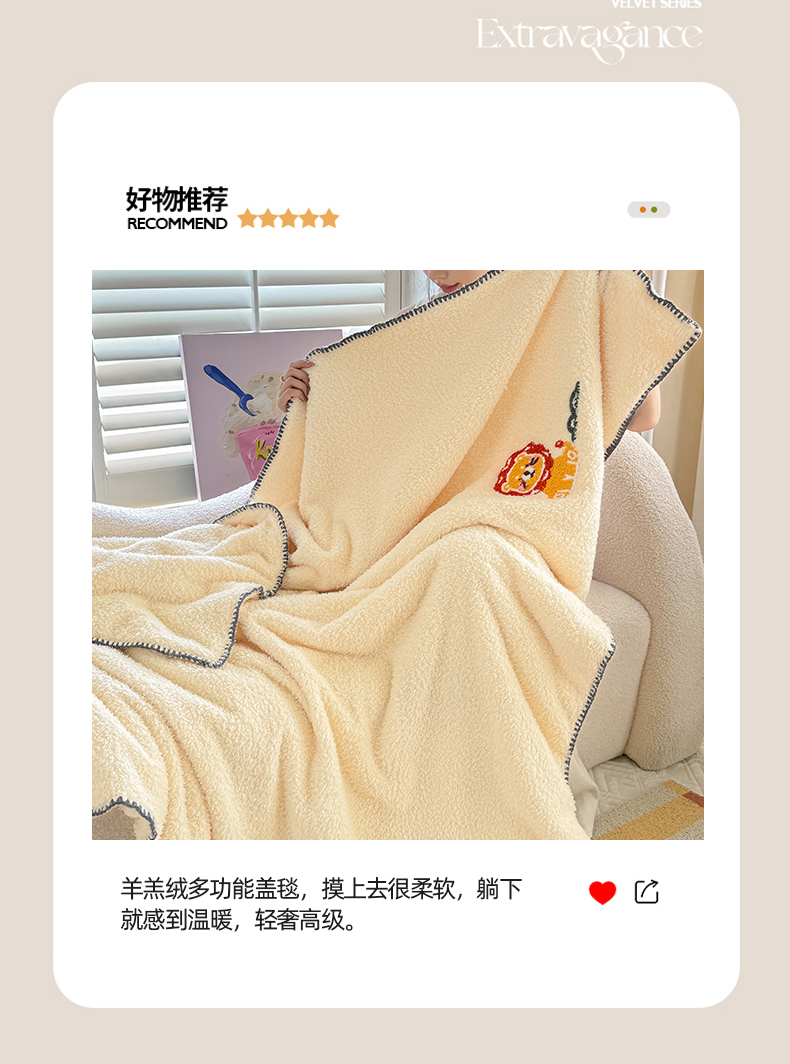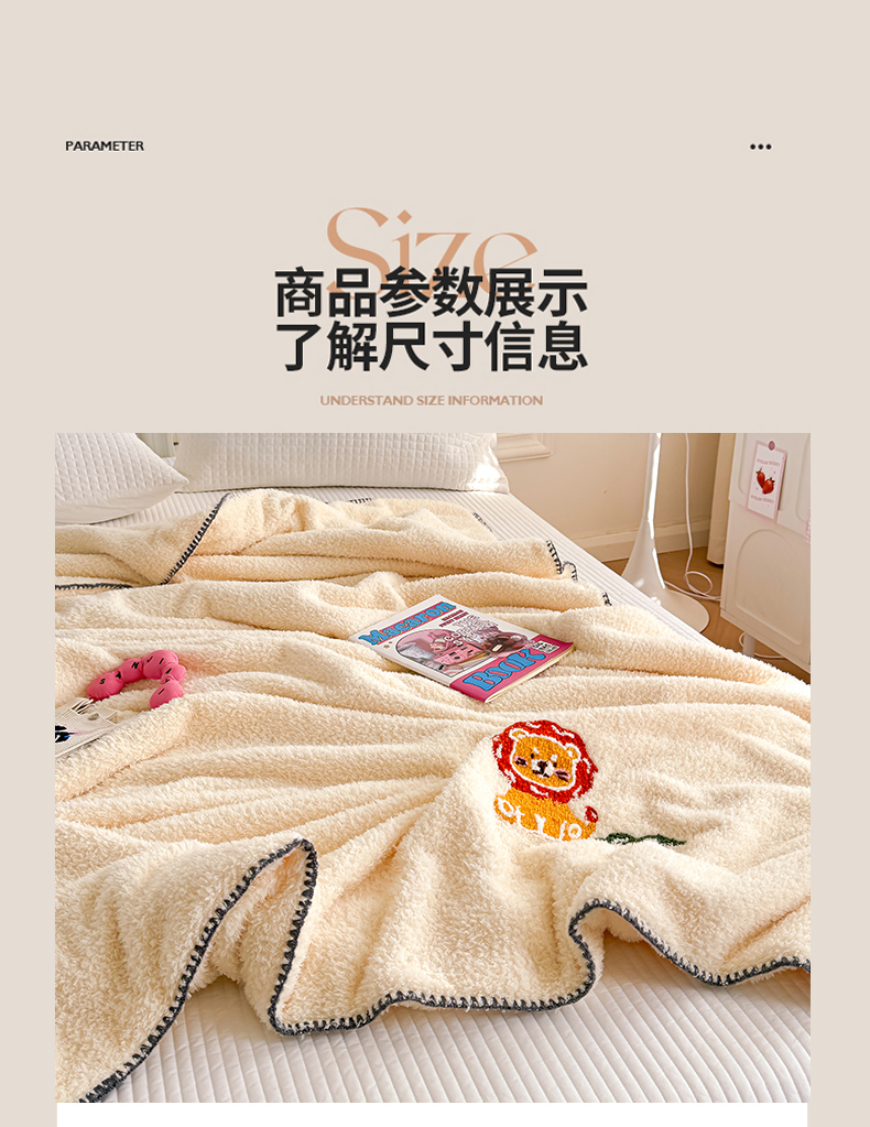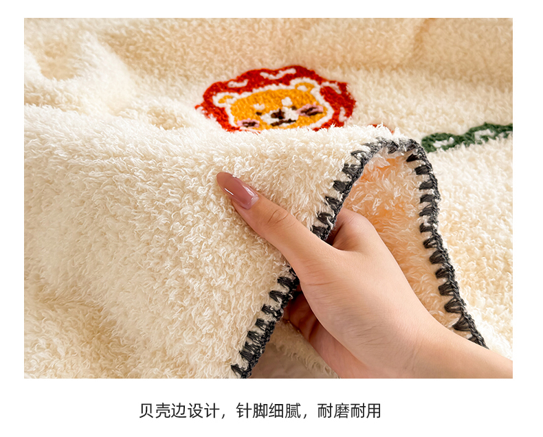 商品名称:简宜家居 2025新款立体毛巾绣三角针羊羔绒毯子一毯多用 小狮子-米黄