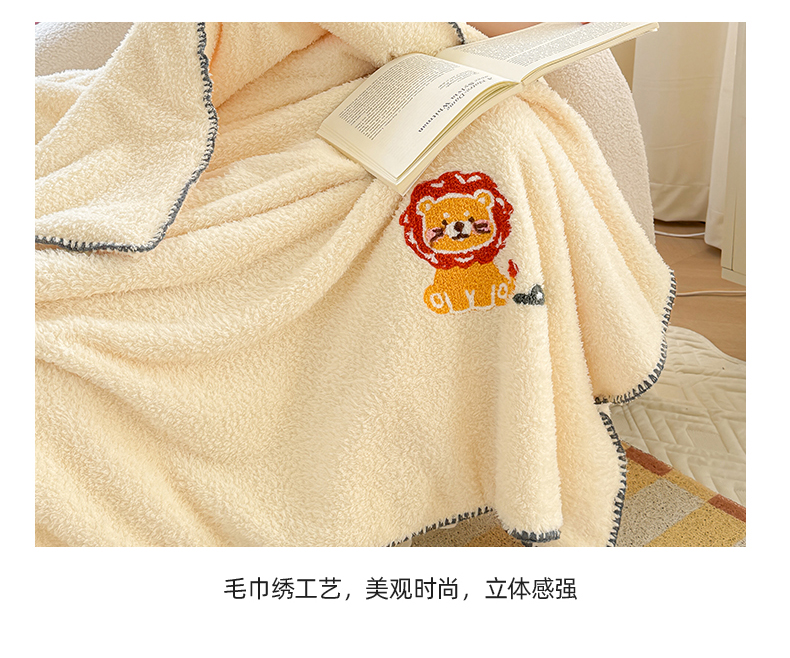 简宜家居 2025新款立体毛巾绣三角针羊羔绒毯子一毯多用 小狮子-米黄