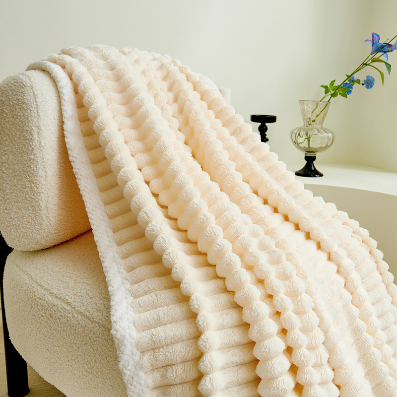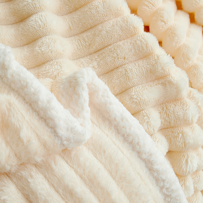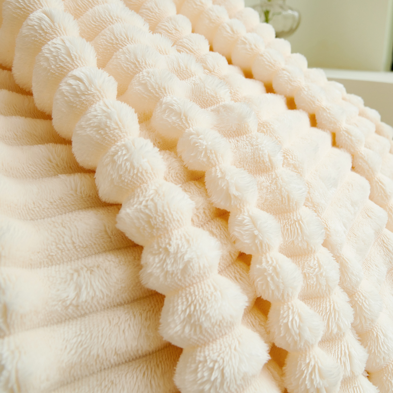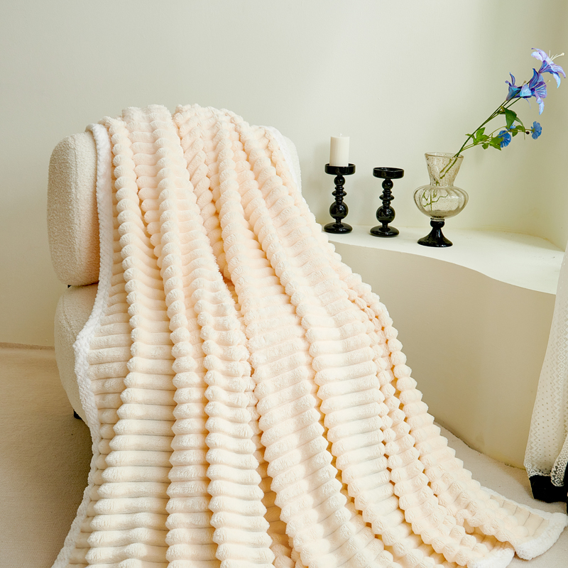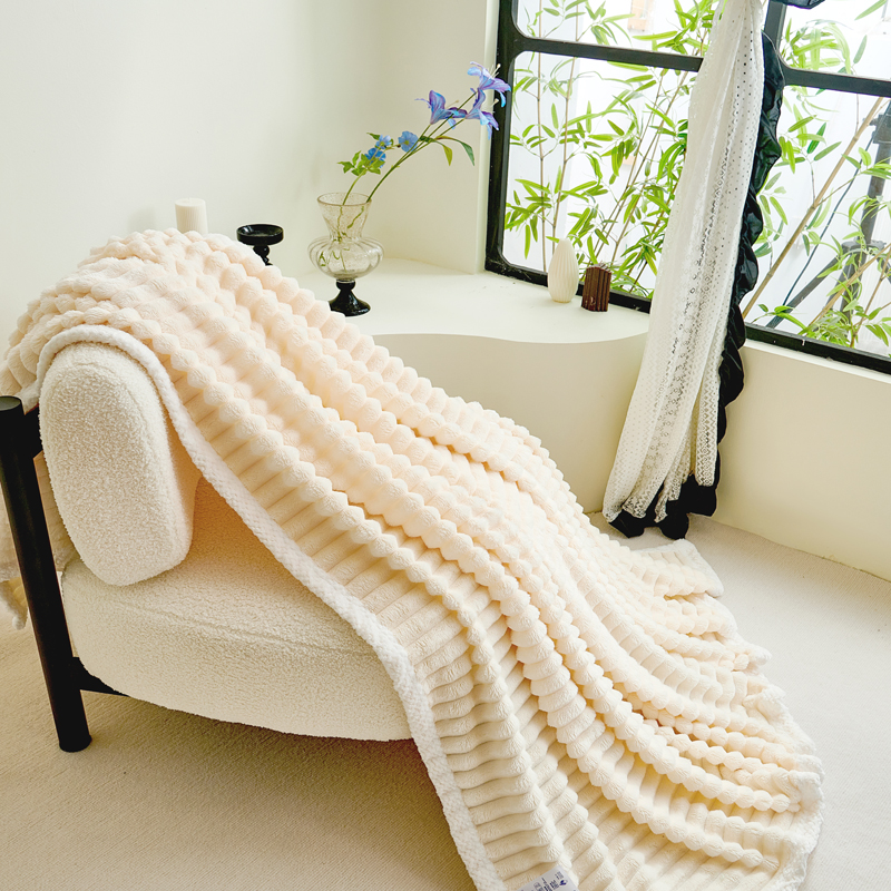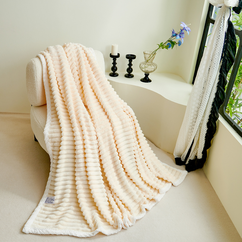鹏程 24款300克抽条毛毯高克重法莱绒牛奶绒贝贝绒毛毯 米白条