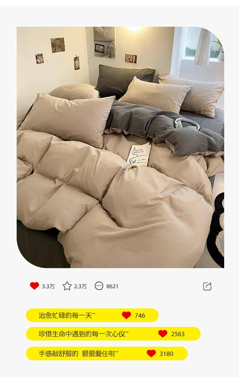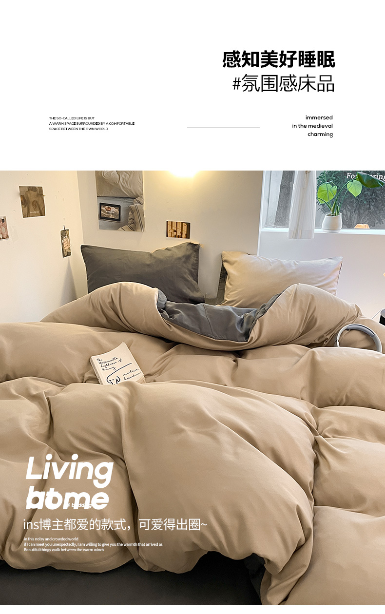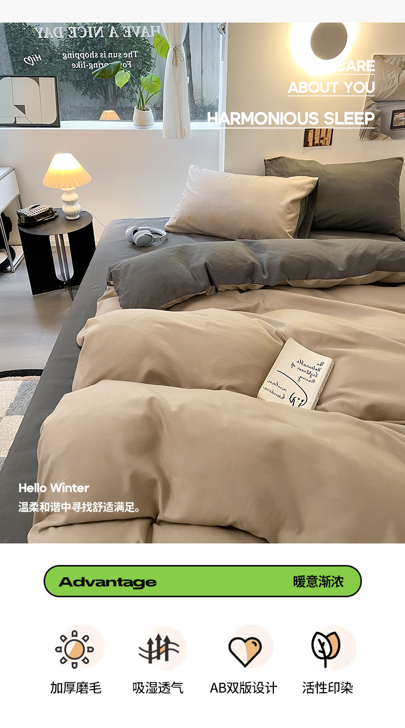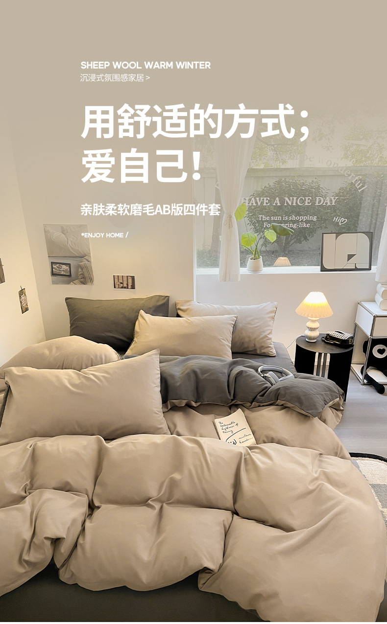 当前位置: 91家纺网 > 商品网购 > 床品套件 > 四件套 > 磨毛活性四件套 > 米粒 2024新款纯色简约双拼磨毛四件套 咖+深灰