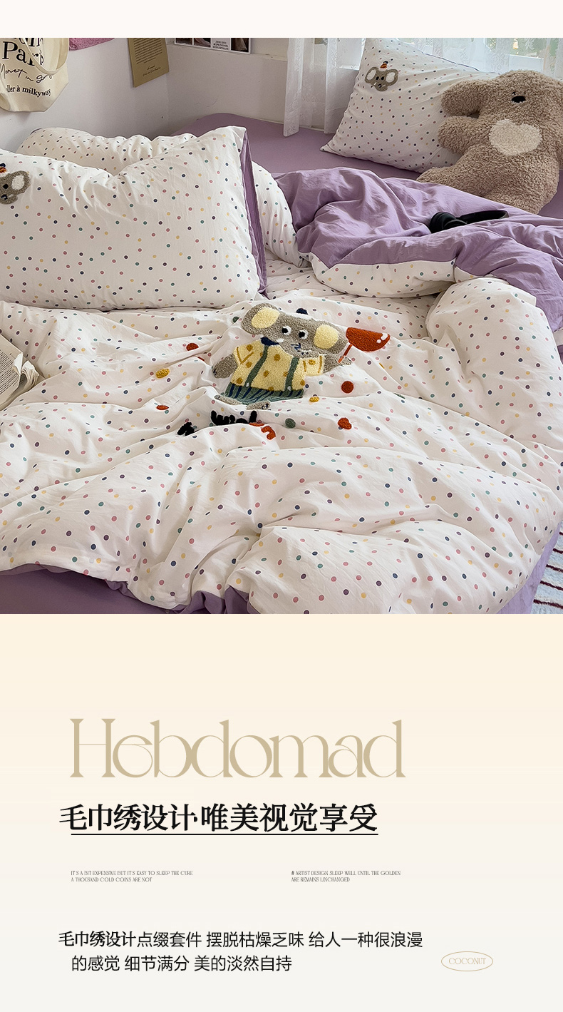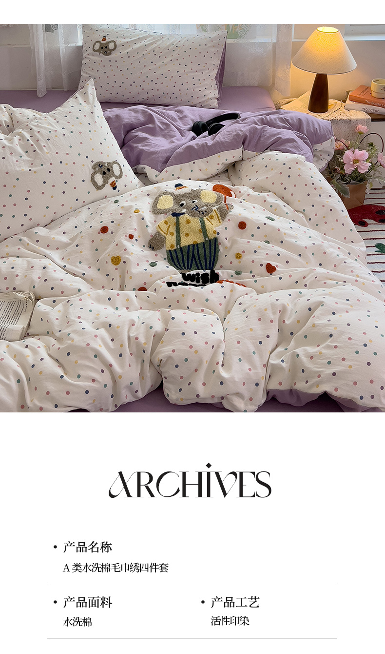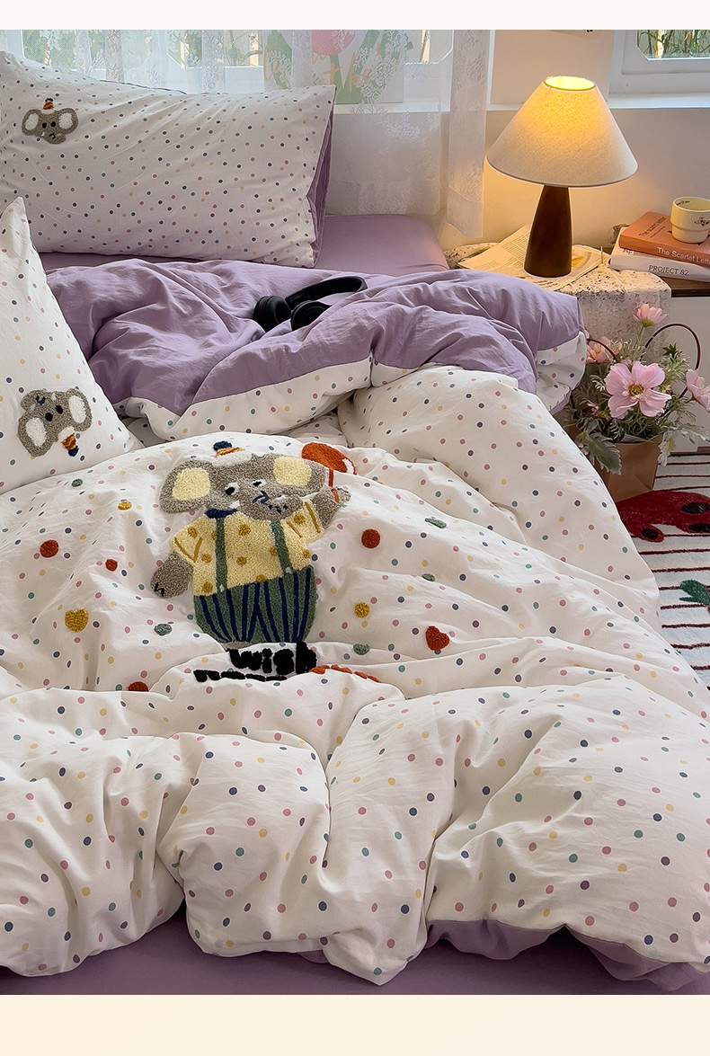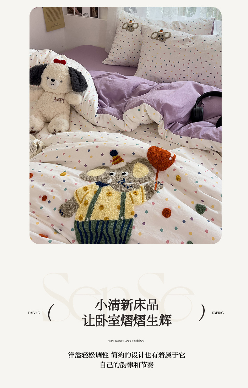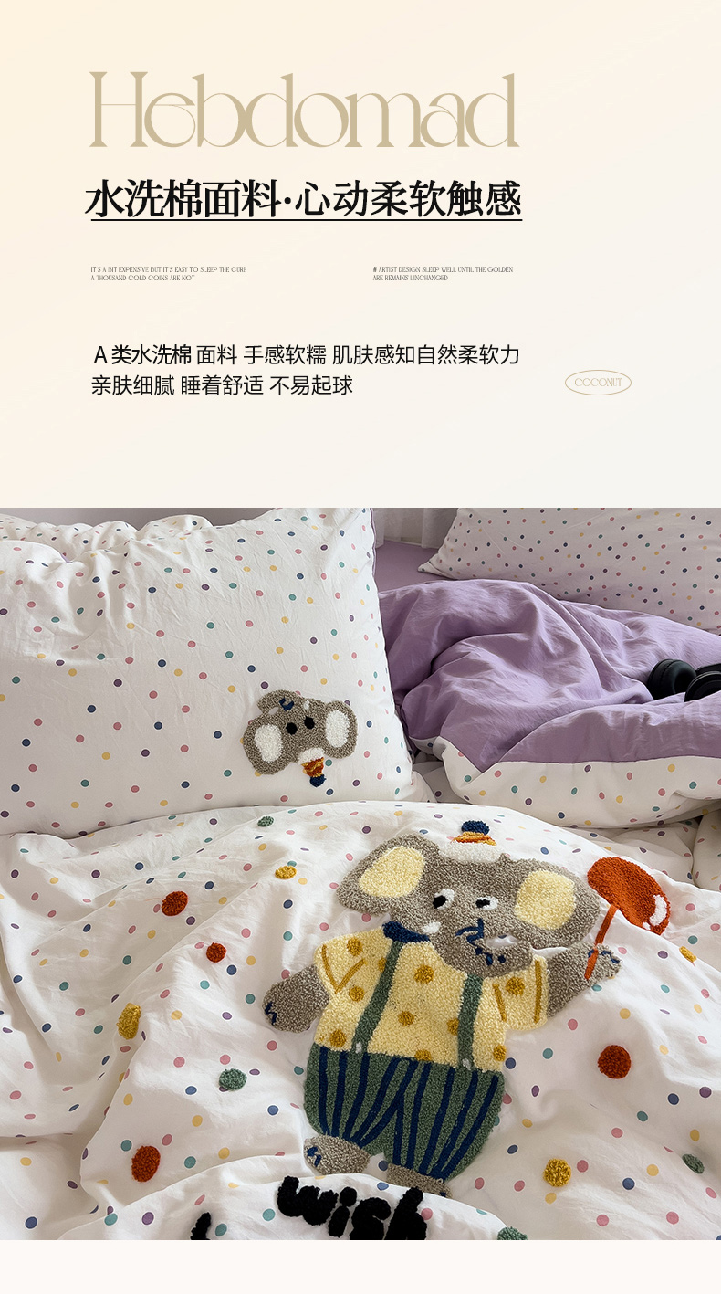 当前位置: 91家纺网 > 商品网购 > 床品套件 > 四件套 > 水洗棉四件套 > 2024新款水洗棉毛巾绣四件套系列 快乐小象