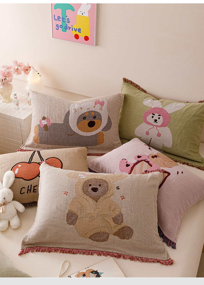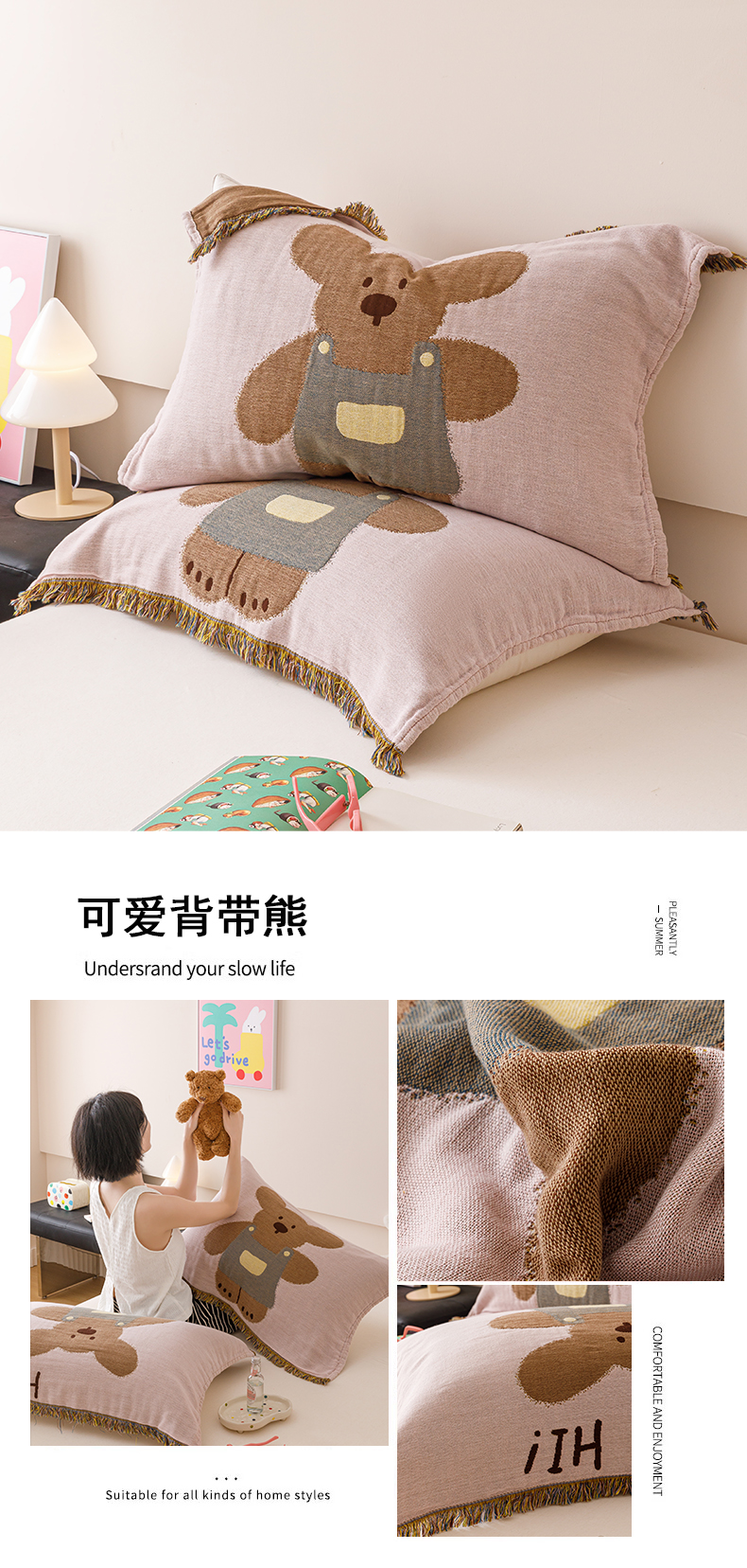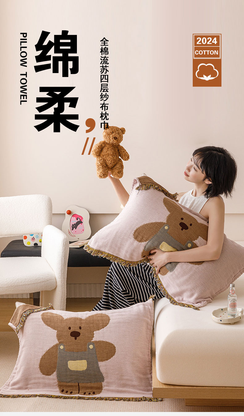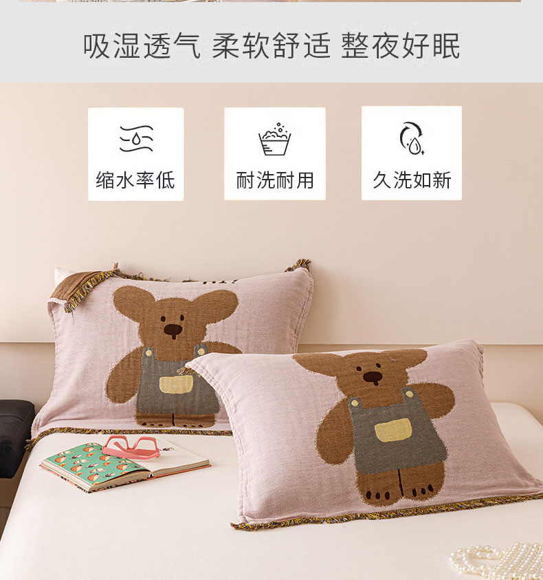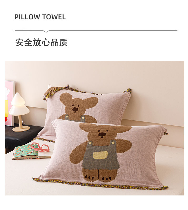 • 91家纺网 家纺一手货源 找家纺 麻依 2024新款全棉流苏款四层纱布枕巾52*75cm 可爱背带熊