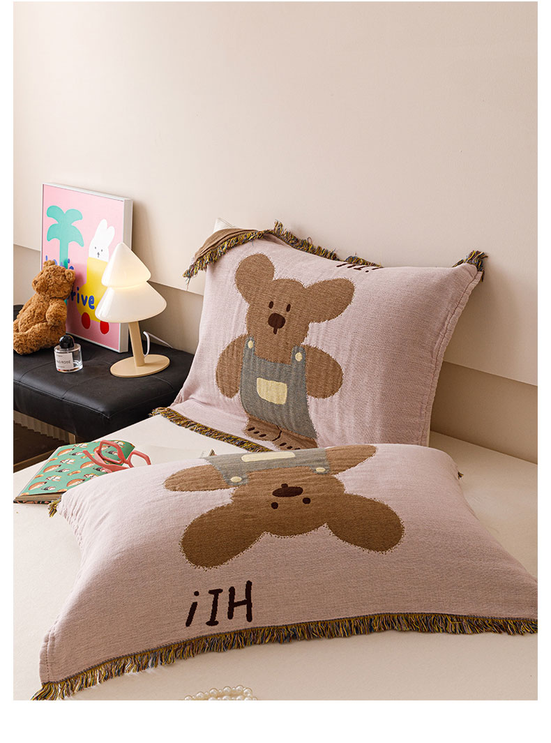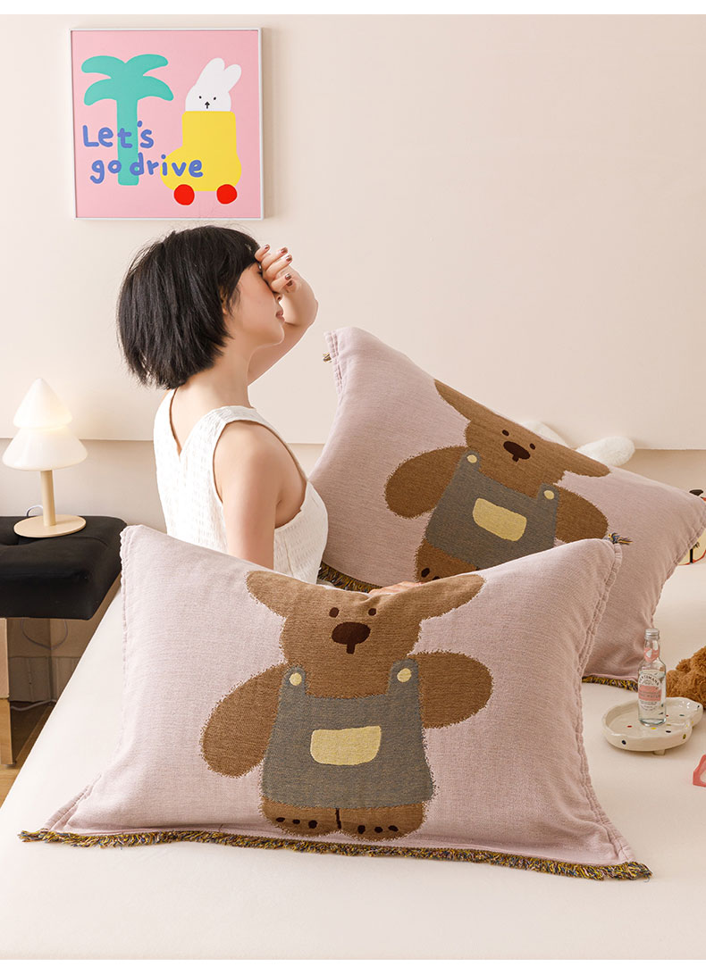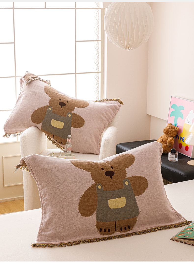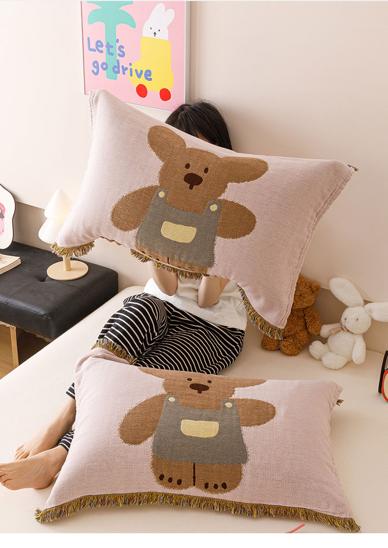 麻依 2024新款全棉流苏款四层纱布枕巾52*75cm 可爱背带熊