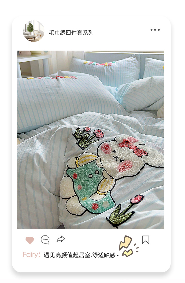当前位置: 91家纺网 > 商品网购 > 床品套件 > 四件套 > 水洗棉四件套 > 韩秀家纺 2025加厚110g超柔纯色印花亲肤云朵棉ins毛巾绣有氧水洗棉四件套-蛋糕和兔 可爱兔云兰