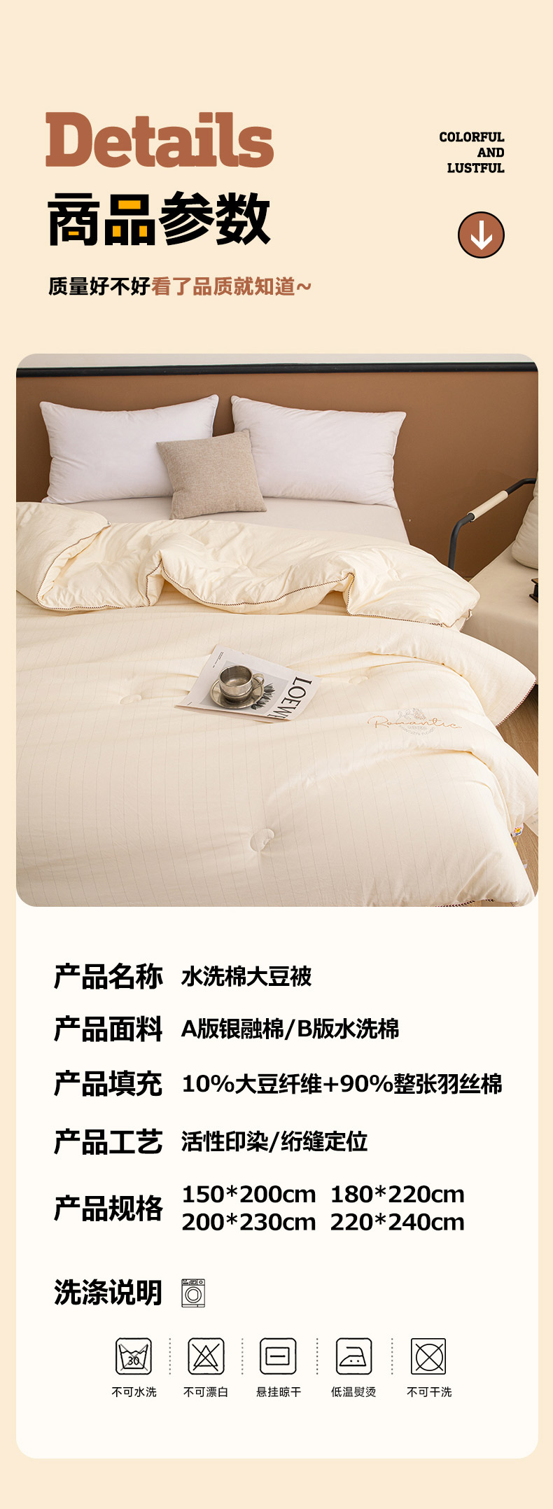 • 填充纤维种类: 大豆蛋白改性聚酯纤维