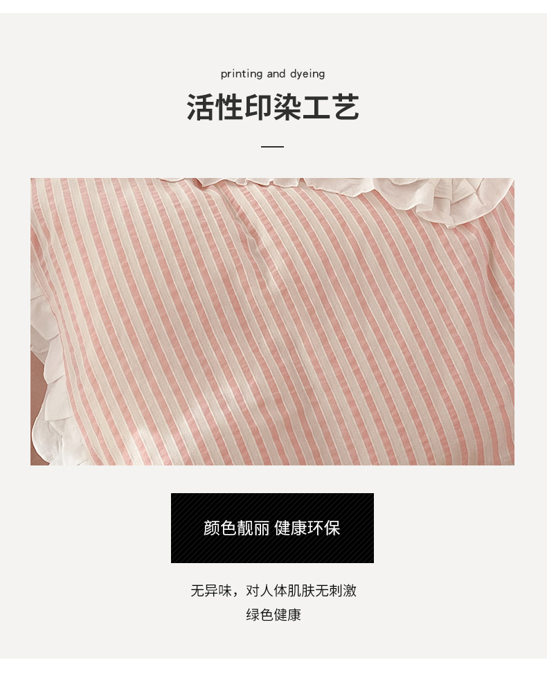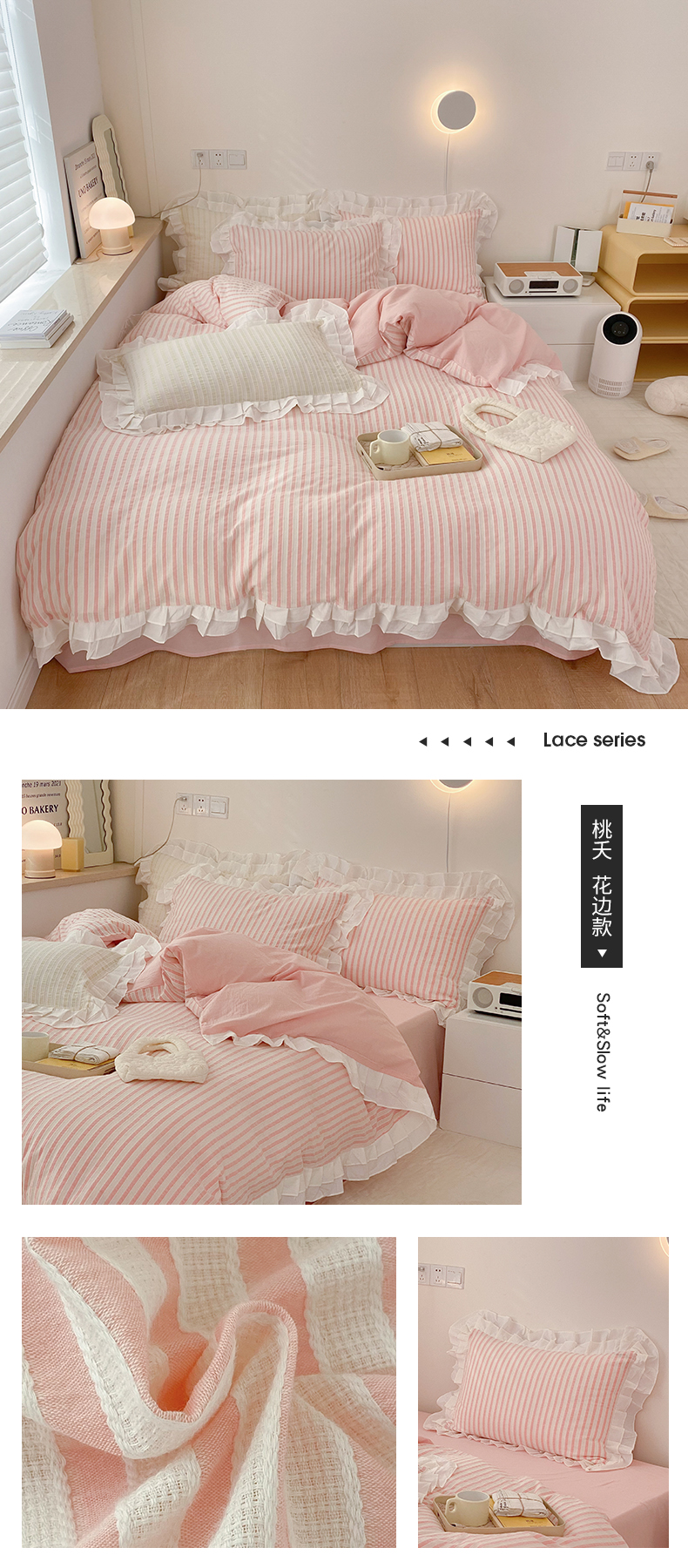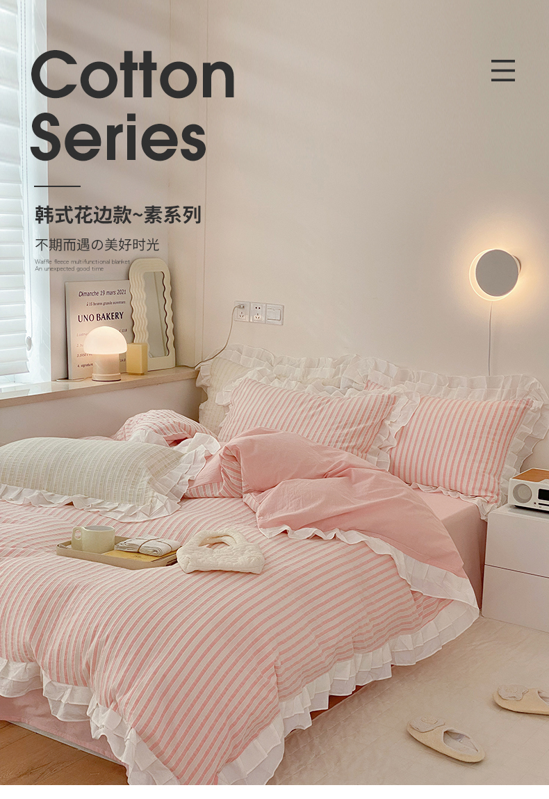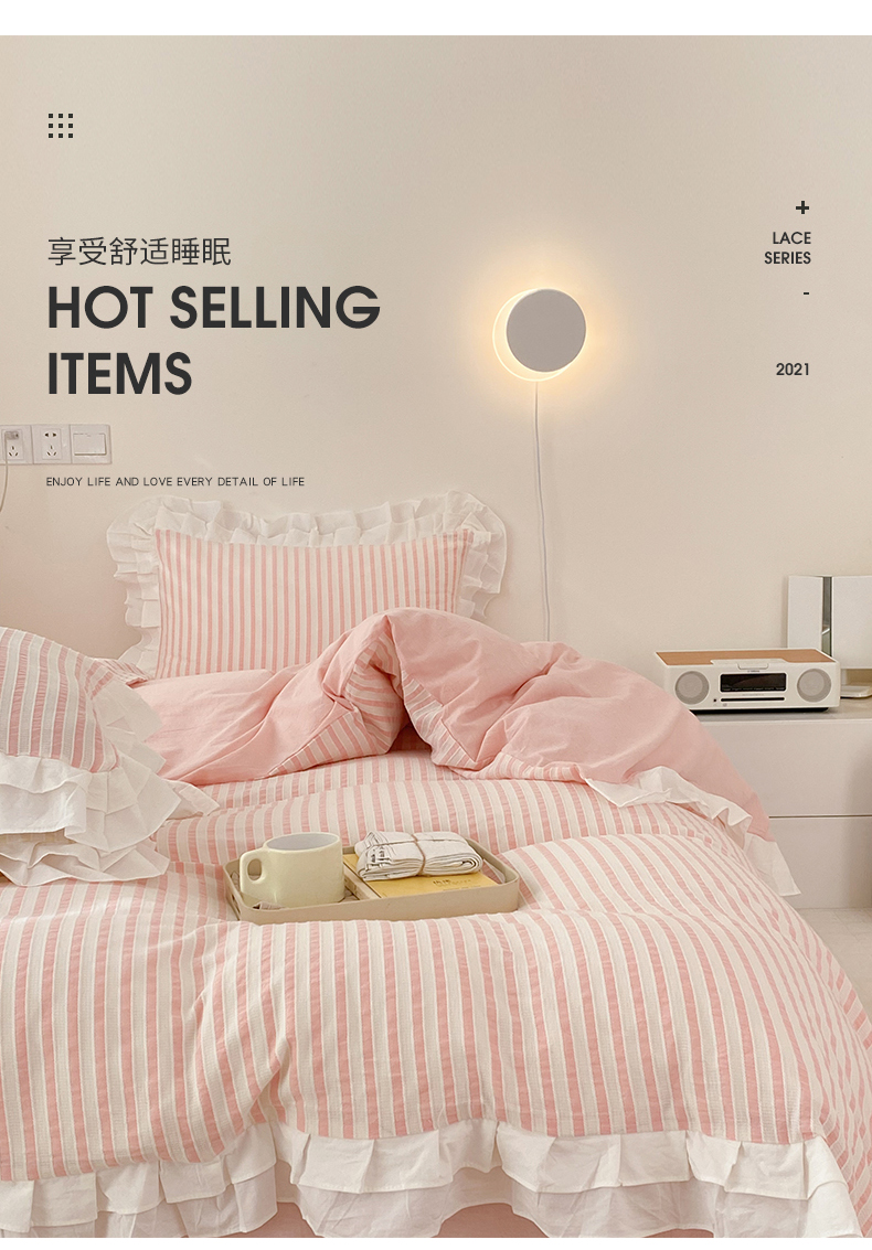商品名称:尺素 2025新款色织水洗棉韩式花边款素系列四件套 桃夭