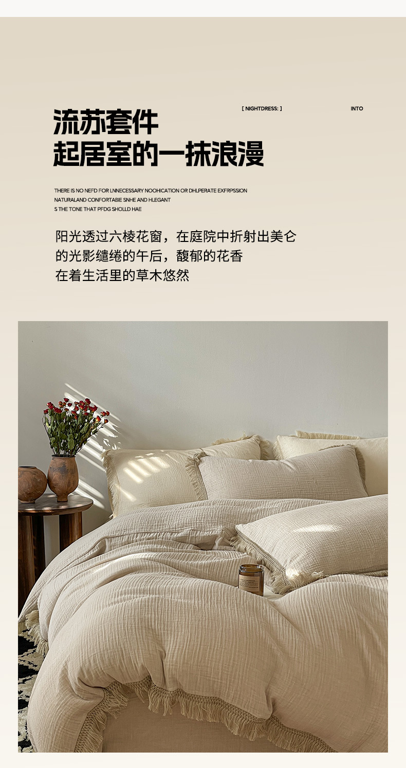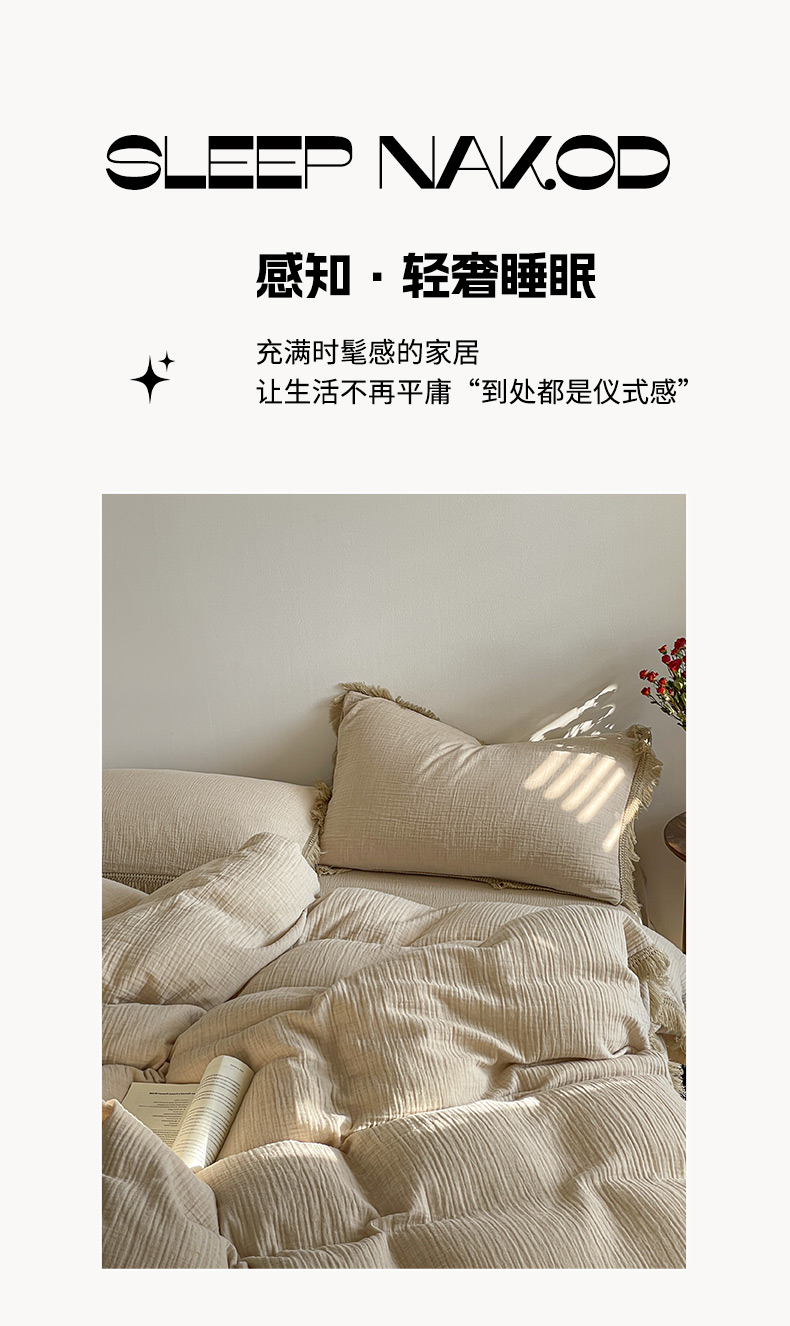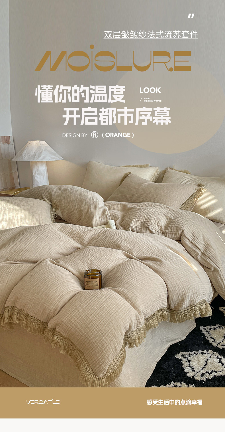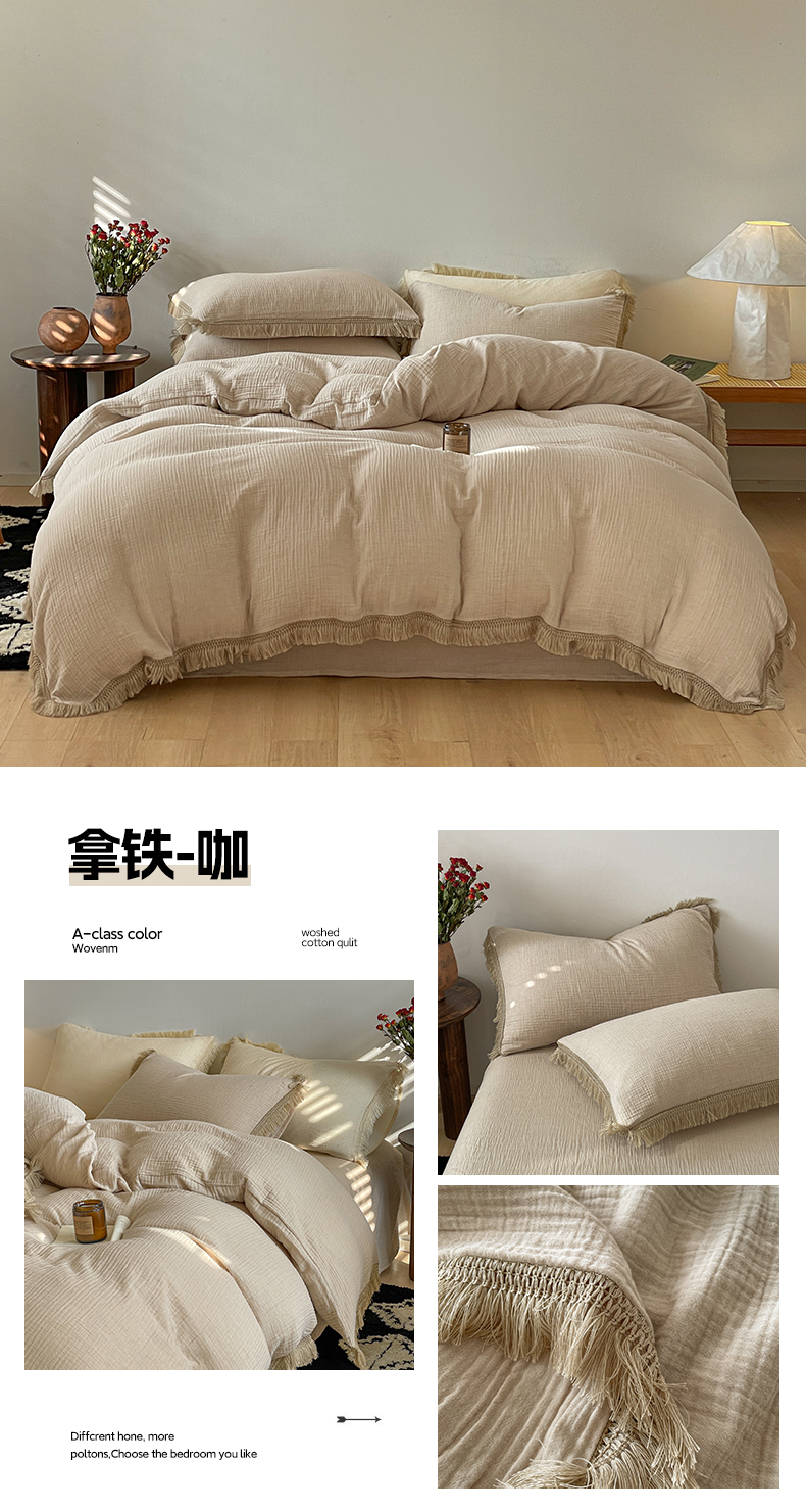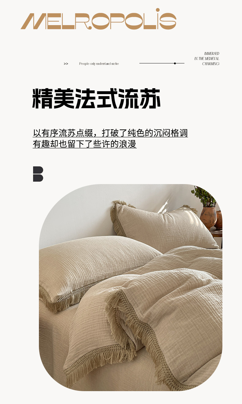 商品名称:卡巴伦家纺 2025新款双层皱皱纱法式流苏款四件套【全网控价(折后券后)不低于标准278/加大298元】 拿铁-咖