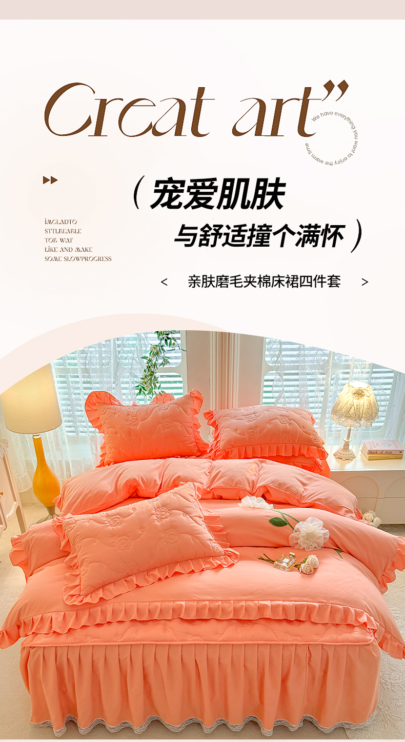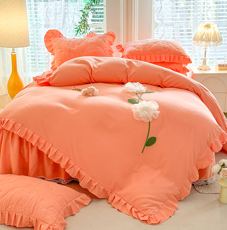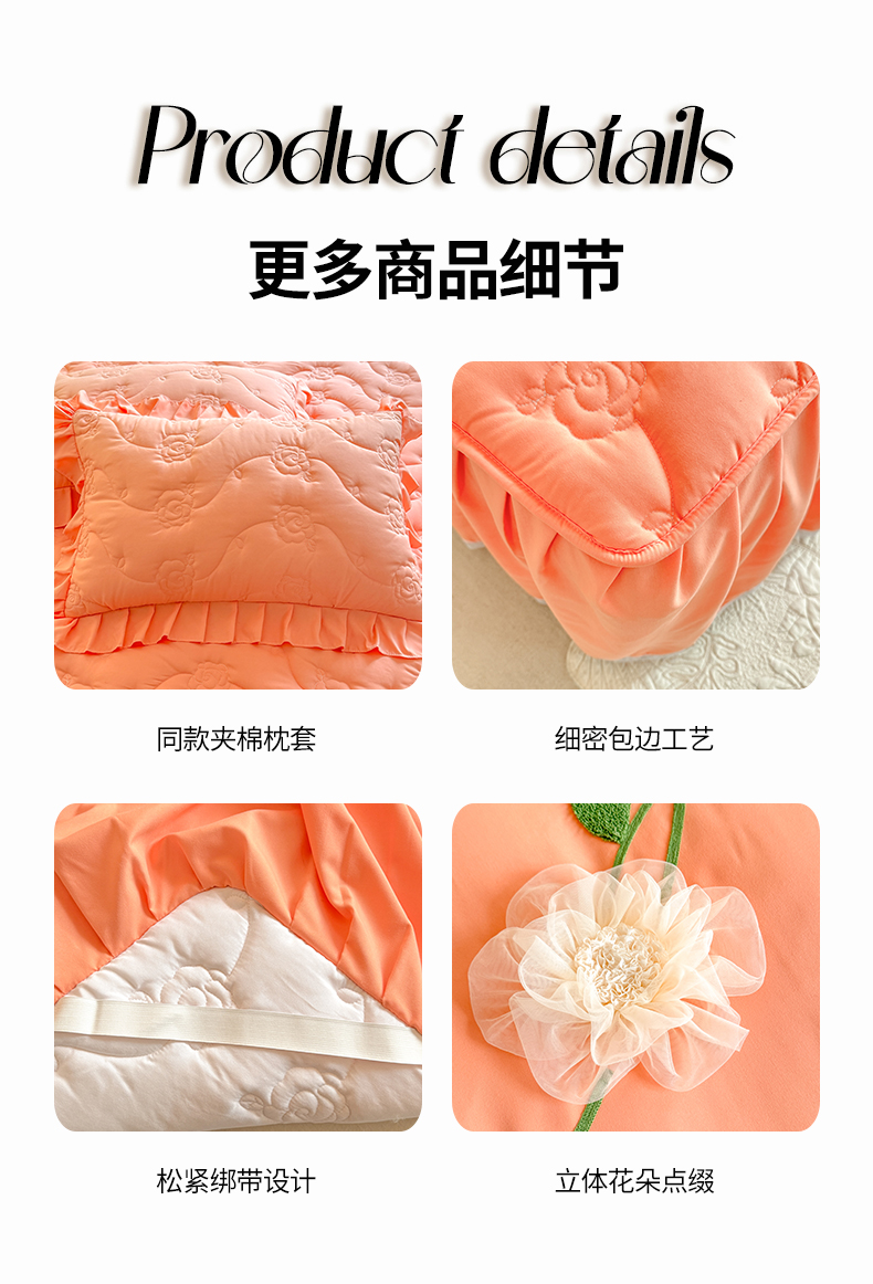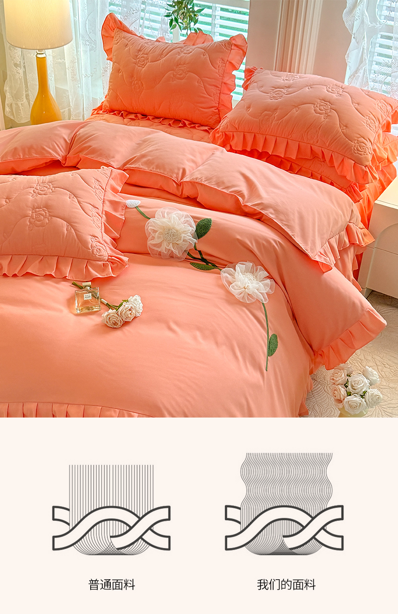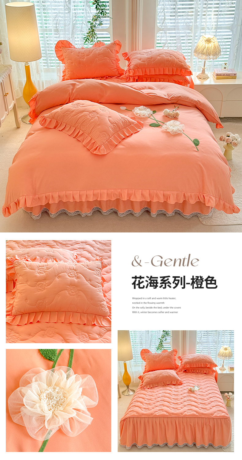 当前位置: 91家纺网 > 商品网购 > 床品套件 > 四件套 > 全棉普通四件套 > 芭比蔓家纺 2025新款夹棉床裙四件套-花海系列 花海系列-橙色