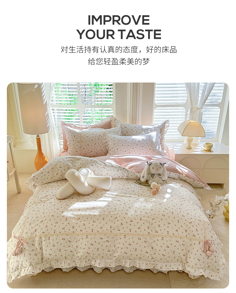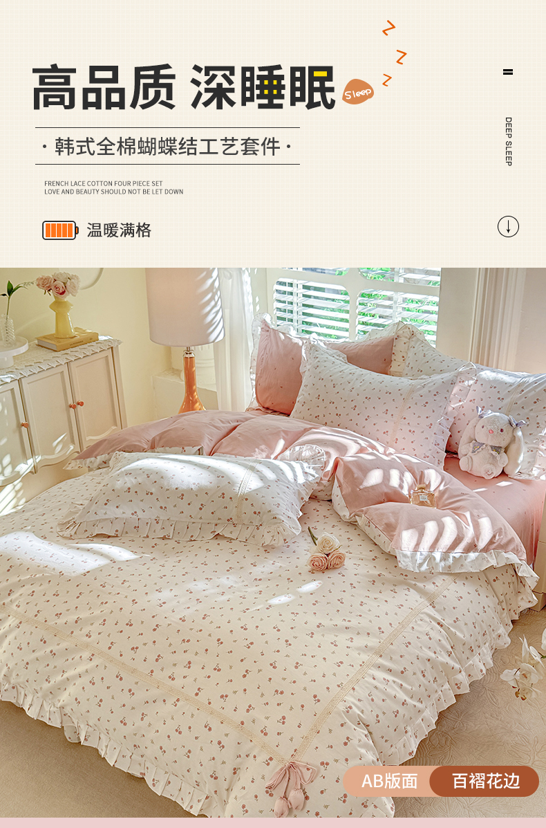 商品名称:艾唯希家纺 2025新款韩式全棉蝴蝶结工艺四件套纯棉公主风花边系列 雾幸