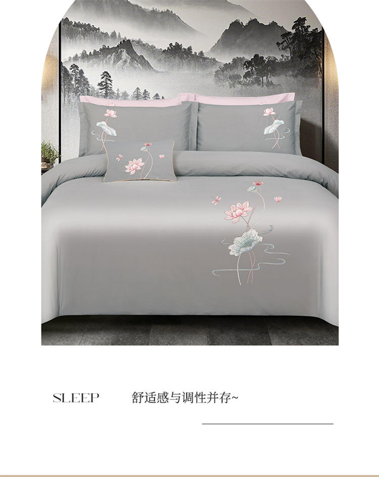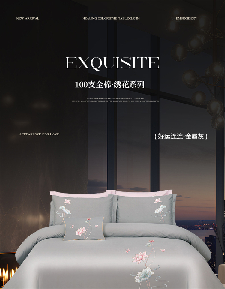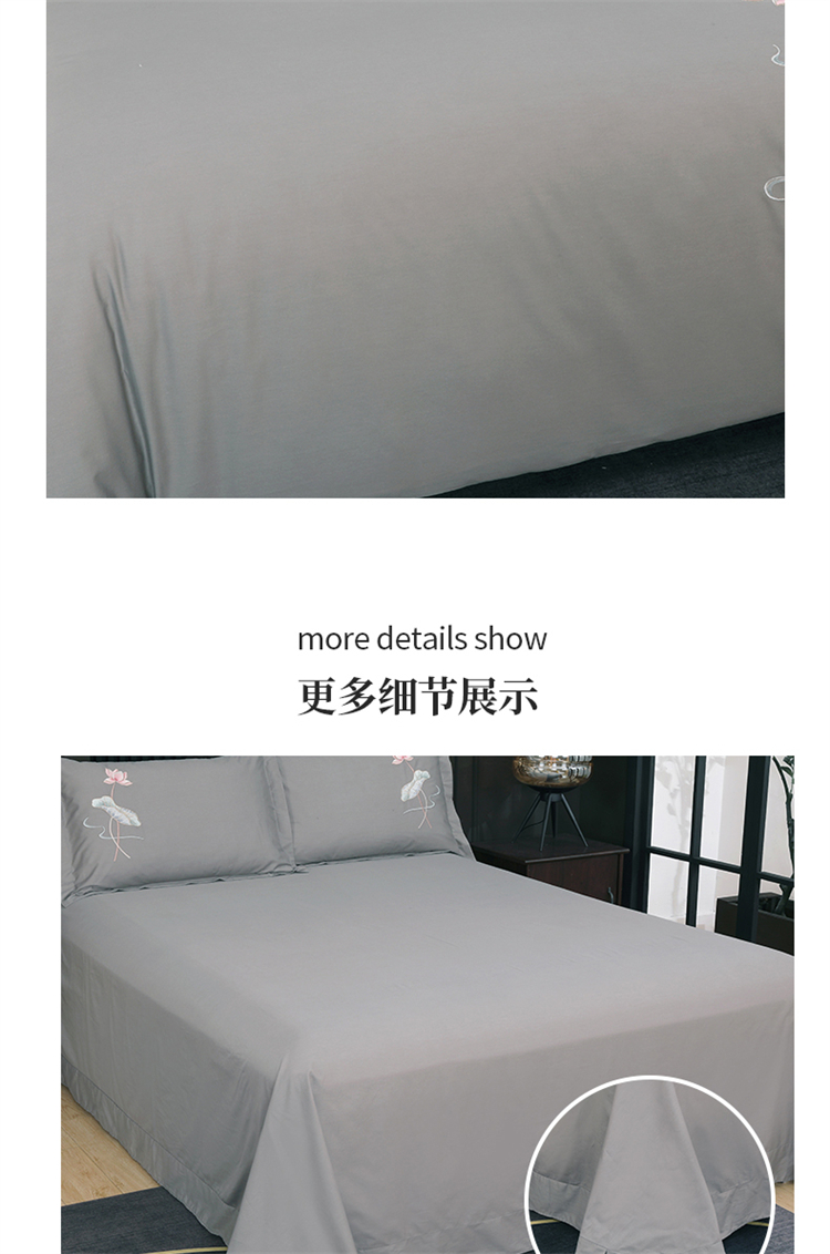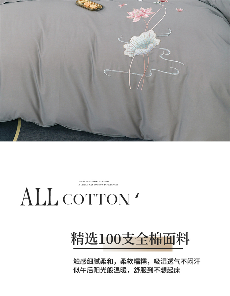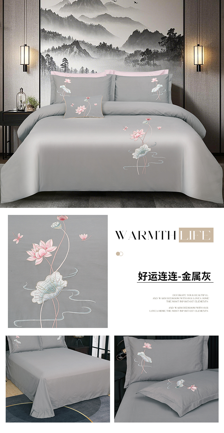商品名称:浩情国际婚庆供货中心 2026新款100支全棉高端刺绣中式风四件套--好运连连系列 好运连连-金属灰