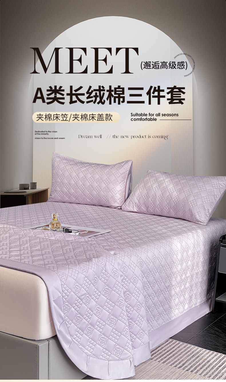 (总)2025轻奢风A类长绒棉夹棉床盖床笠三件套纯色绗绣四季高级感纯色全棉纯棉床上用品